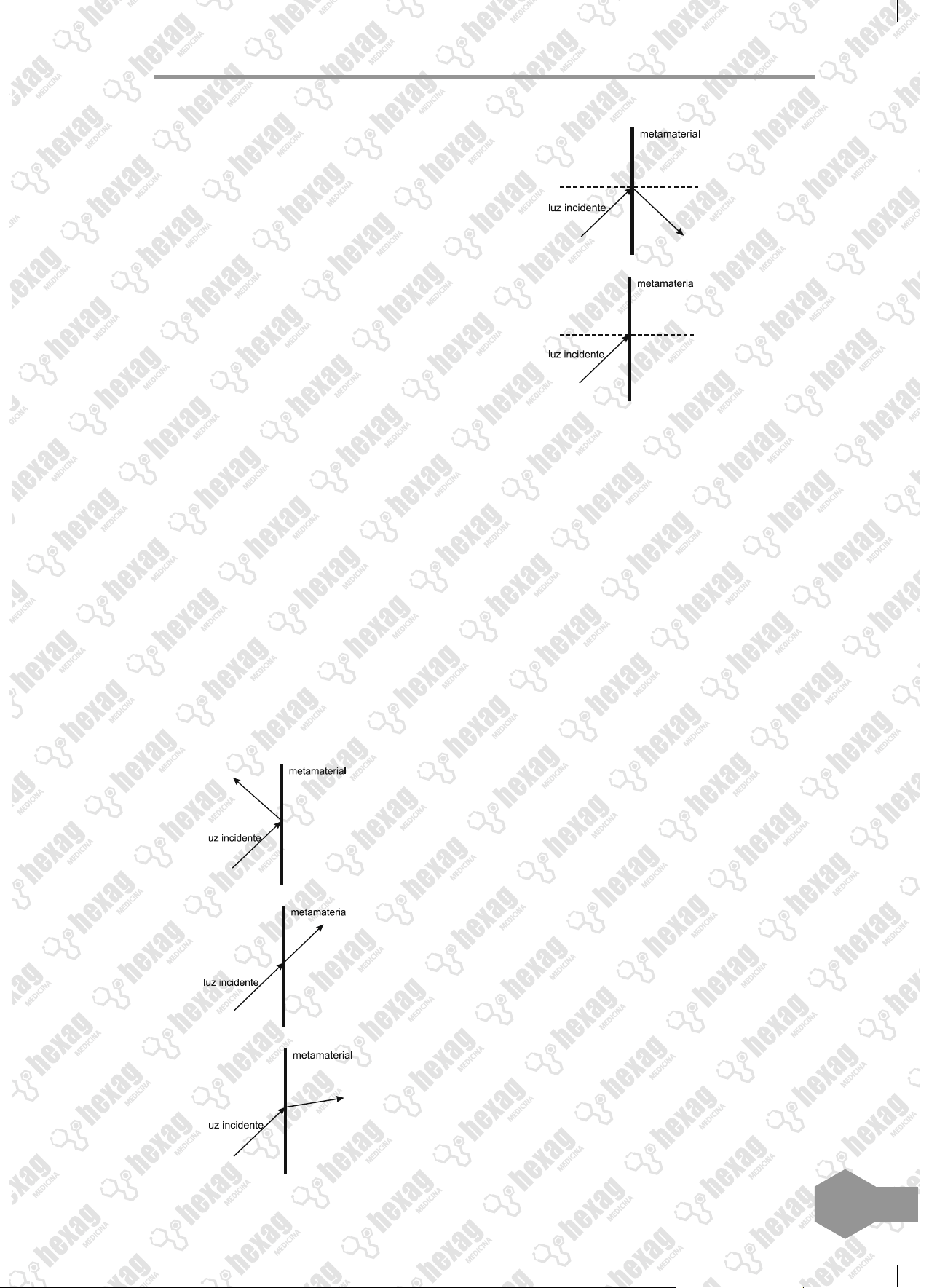507 A aparência de Júpiter é tipicamente mar- cada por duas faixas escuras em sua atmos- fera – uma no hemisfério norte e outra no hemisfério sul. Como o gás está constante- mente em movimento, o desaparecimento da faixa no planeta relaciona-se ao movi- mento das diversas camadas de nuvens em sua atmosfera. A luz do Sol, refletida nessas nuvens, gera a imagem que é captada pelos telescópios, no espaço ou na Terra. O desaparecimento da faixa sul pode ter sido determinado por uma alteração: a) na temperatura da superfície do planeta. b) no formato da camada gasosa do planeta. c) no campo gravitacional gerado pelo planeta. d) na composição química das nuvens do planeta. e) na densidade das nuvens que compõem o pla- neta. 31. (Enem) Um grupo de cientistas liderado por pesquisadores do Instituto de Tecnologia da Califórnia (Caltech), nos Estados Uni- dos, construiu o primeiro metamaterial que apresenta valor negativo do índice de refra- ção relativo para a luz visível. Denomina-se metamaterial um material óptico artificial, tridimensional, formado por pequenas es- truturas menores do que o comprimento de onda da luz, o que lhe dá propriedades e comportamentos que não são encontrados em materiais naturais. Esse material tem sido chamado de “canhoto”. Disponível em: . Acesso em: 28 abr. 2010 (adaptado). Considerando o comportamento atípico des- se metamaterial, qual é a figura que repre- senta a refração da luz ao passar do ar para esse meio? a) b) c) d) e) 32. “Uma ambulância com a sirene ligada, du- rante a aproximação ou afastamento e um observador. Quando ela aproxima-se do ob- servador, o som é mais agudo; e, quando a ambulância afasta-se, o som é mais grave. Esse é um fenômeno característico de qual- quer propagação ondulatória, e ele é muito mais presente no cotidiano do que pensa- mos. O efeito Doppler é utilizado para medir a ve- locidade de objetos por meio de ondas que são emitidas por aparelhos baseados em ra- diofrequência ou lasers,como os radares.” Disponível em: . Disponível em: 03 set. 2018. Com base nessas informações podemos afir- mar que o efeito Doppler é usado no seguin- te exame médico: a) hemograma completo. b) tomografia. c) ecocardiograma. d) punção lombar. e) laringoscopia. 33. Para focar as imagens, o olho se baseia em duas partes críticas: § A córnea, a superfície frontal transparen- te do olho. § O cristalino, uma estrutura clara dentro do seu olho que muda de forma para aju- dar no foco dos objetos. Num olho com a forma perfeita, cada um destes elementos de focagem tem uma cur- vatura lisa, como a superfície de uma esfe- ra. A córnea ou cristalino com tais curvas de superfície de curvatura refrata toda a luz recebida da mesma maneira e faz uma ima- gem perfeitamente focada na parte de trás do olho.