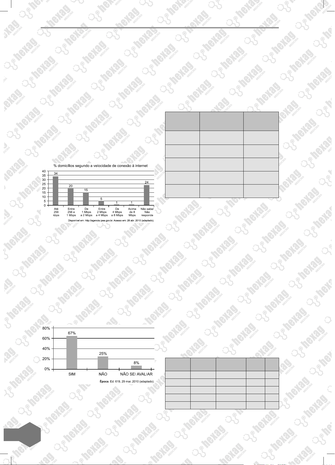 640 9. (Enem) O número mensal de passagens de uma determinada empresa aérea aumentou no ano passado nas seguintes condições: em janeiro foram vendidas 33000 passagens; em fevereiro, 34500; em março, 36000. Esse padrão de crescimento se mantém para os meses subsequentes. Quantas passagens foram vendidas por essa empresa em julho do ano passado? a) 38000 b) 40500 c) 41000 d) 42000 e) 48000 10. (Enem) O gráfico mostra a velocidade de co- nexão à internet utilizada em domicílios no Brasil. Esses dados são resultado da mais re- cente pesquisa, de 2009, realizada pelo Co- mitê Gestor da Internet (CGI). Escolhendo-se, aleatoriamente, um domicí- lio pesquisado, qual a chance de haver ban- da larga de conexão de pelo menos 1 Mbps neste domicílio? a) 0,45 b) 0,42 c) 0,30 d) 0,22 e) 0,15 11. (Enem) Uma enquete, realizada em mar- ço de 2010, perguntava aos internautas se eles acreditavam que as atividades humanas provocam o aquecimento global. Eram três alternativas possíveis e 279 internautas res- ponderam à enquete, como mostra o gráfico. Analisando os dados do gráfico, quantos in- ternautas responderam “não” à enquete? a) Menos de 23 b) Mais de 23 e menos de 25 c) Mais de 50 e menos de 75 d) Mais de 100 e menos de 190 e) Mais de 200 12. (Enem) Todo o país passa pela primeira fase de campanha de vacinação contra a gripe suma (H1N1). Segundo um médico infectologista do Instituto Emilio Ribas, de São Paulo, a imu- nização “deve mudar”, no país, a história da epidemia. Com a vacina, de acordo com ele, o Brasil tem a chance de barrar uma tendência do crescimento da doença, que já matou 17 mil no mundo. A tabela apresenta dados específi- cos de um único posto de vacinação. Campanha de vacinação contra a gripe suína: Datas da vacinação Público-alvo Quantidade de pessoas vacinadas 8 a 19 de março Trabalhadores da saúde e indígenas 42 22 de março a 2 de abril Portadores de doenças crônicas 22 5 a 23 de abril Adultos saudáveis entre 20 e 29 anos 56 24 de abril a 7 de maio População com mais de 60 anos 30 10 a 21 de maio Adultos saudáveis entre 30 e 39 anos 50 Disponível em: . Acesso em: 26 abr. 2010 (adaptado). Escolhendo-se aleatoriamente uma pessoa atendida nesse posto de vacinação, a proba- bilidade de ela ser portadora de doença crô- nica é: a) 8%. b) 9%. c) 11%. d) 12%. e) 22%. 13. (Enem) A cor de uma estrela tem relação com a temperatura em sua superfície. Estre- las não muito quentes (cerca de 3000 K) nos parecem avermelhadas. Já as estrelas ama- relas, como o Sol, possuem temperatura em torno dos 6000 K; as mais quentes são bran- cas ou azuis porque sua temperatura fica aci- ma dos 10000 K. A tabela apresenta uma classificação espectral e outros dados para as estrelas dessas classes. Estrelas da sequência principal Temperatura em Kelvin Classe Espectral Tempe- ratura Lumino- sidade Massa Raio O5 40.000 5∙105 40 18 B0 28.000 2∙104 18 7 AO 9.900 80 3 2∙5 G2 5.770 1 1 1 M0 3.480 0,06 0,5 0,6 Luminosa, massa e raio, tomando o Sol como unidade. Disponível em: . Acesso em: 01 maio 2010 (adaptado).