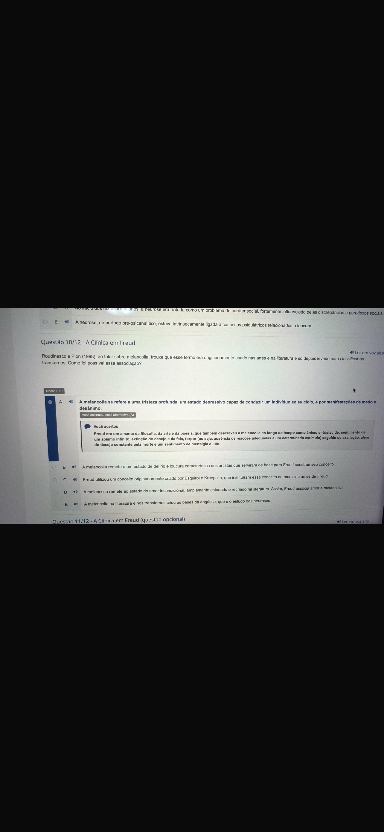 textos a neurose era tratada como um problema de caráter fortemente influenciado pelas discrepâncias e paradoxos sociais E A neurose, no período estava intrinsecamente ligada a conceitos psiquiátricos relacionados à loucura. Questão 10/12 A Clínica em Freud Ler em alt Roudinesco e Plon (1998), ao falar sobre melancolia, trouxe que esse termo era originariamente usado nas artes e na literatura e só depois levado para classificar os transtornos. Como foi possível essa associação? Nota: 10.0 A A melancolia se refere a uma tristeza profunda, um estado depressivo capaz de conduzir um indivíduo ao e por manifestações de medo e Você assinalou essa alternativa (A) Você acertou! Freud era um amante da da arte e da poesia, que também descreveu a melancolia ao longo do tempo como ânimo entristecido. sentimento de um abismo infinito. extinção do desejo e da fala, torpor (ou seja, ausência de reações adequadas a um determinado estímulo) seguido de exaltação, além do desejo constante pela morte e um sentimento de nostalgia e luto. B A melancolia remete a um estado de e loucura característico dos artistas que serviram de base para Freud construir seu conceito. Freud utilizou um conceito originariamente criado por Esquirol e Kraepelin, que esse conceito na medicina antes de D A melancolia remete ao estado do amor incondicional, amplamente estudado e recriado na literatura. Assim, Freud associa amor e melancolia A melancolia na literatura e nos transtornos criou as bases da angústia, que é o estudo das 11/12 A Clínica em Freud (questão opcional) Ler em voz alta