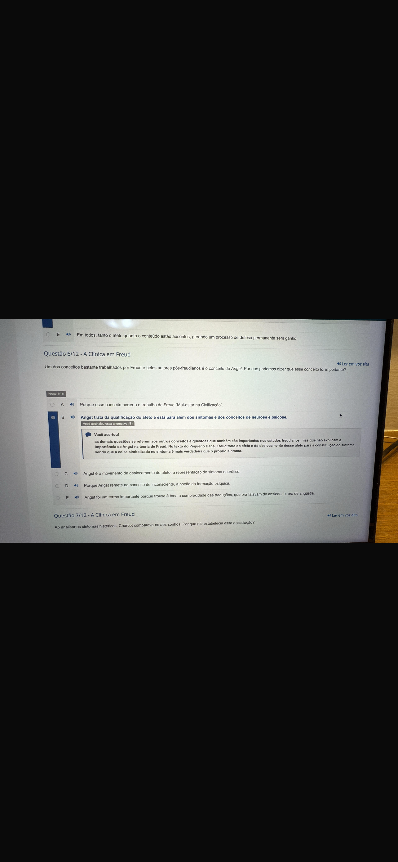 E Em todos, tanto o afeto quanto conteúdo estão ausentes. gerando um processo de defesa permanente sem ganho. Questão 6/12 - A Clínica em Freud 40 Ler em voz alta Um dos conceitos bastante trabalhados por Freud e pelos autores pós-freudianos é conceito de Angst. Por que podemos dizer que esse conceito foi importante? Nota: 10.0 A Porque esse conceito norteou trabalho de Freud "Mal-estar na B Angst trata da qualificação do afeto e está para além dos sintomas e dos conceitos de neurose e psicose. assinalou essa alternativa (B) Você acertou! as demais questões se referem aos outros conceitos e questões que também são importantes nos estudos freudianos, mas que não explicam a importância de Angst na teoria de Freud. No texto do Pequeno Hans, Freud trata do afeto e do deslocamento desse afeto para a constituição do sintoma, sendo que a coisa simbolizada no sintoma é mais verdadeira que próprio sintoma. C Angst é o movimento de deslocamento do afeto, a representação do sintoma D 40 Porque Angst remete ao conceito de inconsciente, à noção da formação E Angst foi um termo importante porque trouxe à tona a complexidade das traduções, que ora falavam de ansiedade, ora de Questão 7/12 A Clínica em Freud Ler em voz alta Ao analisar os sintomas histéricos, Charcot comparava-os aos sonhos. Por que ele estabelecia essa associação?