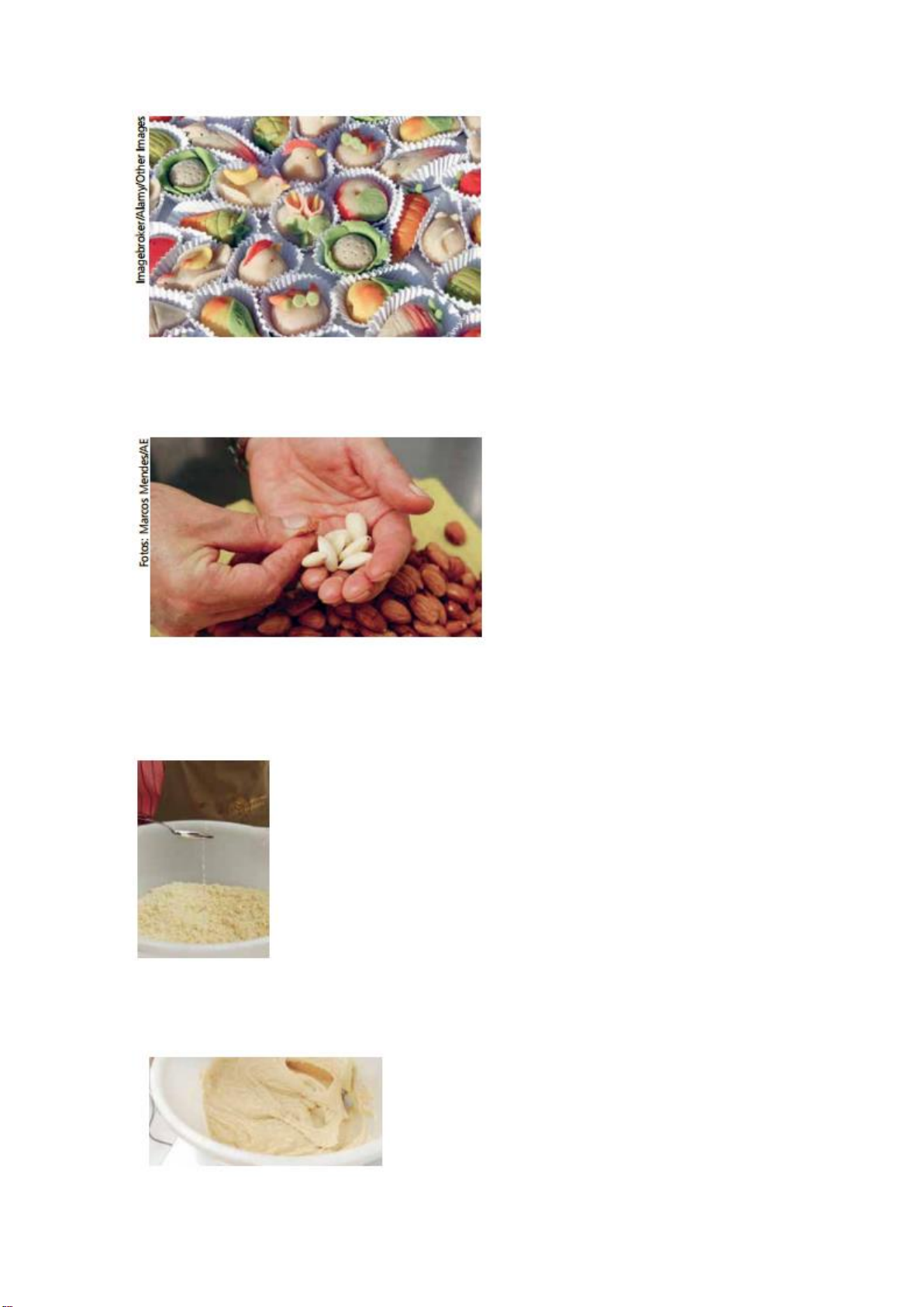 SEM CASCA — Coloque 2 quilos de amêndoas em água fervente por 1 minuto. Escorra e retire as cascas. BEM FINA — Desidrate as amêndoas em forno fraco por 20 minutos e bata no multiprocessador até virar uma farinha fina (e não uma pasta). Acrescente duas colheres (sopa) de água de rosas importada. A MASSA — Adicione a calda ainda quente feita com 450 mº de água e 1,5 quilo de açúcar. Misture bem. PODE COMER — Trabalhe porções com uma espátula até que desgrudem e esfriem rapidamente. E pronto! • São necessários 2 quilos de amêndoas e 1,5 de açúcar para cada receita • Depois de pronto, o marzipã pesa 3,5 quilos e rende até ** bombons de 12 gramas cada • A Chocolates produz 7 quilos de marzipã por semana. Mas esse número é 3 vezes maior durante a época de Natal • Armazenado em recipiente fechado, o doce dura até 30 dias na geladeira • Barrinhas de marzipã de 50 gramas custam R$ 6. O quilo do bombom sai a R$ 110. (O Estado de S. Paulo, 4/10/2007.) a) Essa reportagem traz uma receita para fazer marzipã. No texto da notícia, apagamos o número de bombons de 12 g que são obtidos com os 3,5 quilos de marzipã. Quantos bombons rende a receita? b) Na época de Natal, quantos quilos de amêndoas a Chocolates consome semanalmente para fabricar marzipã? c) Hoje a barrinha de marzipã de 50 g custa R$ 9,00 e a caixa com um quilo de barrinhas sai a R$ 165,00. Se quero comprar 100 barrinhas de 50 g de marzipã da Chocolates gastando o menos possível, qual é a melhor opção e quanto vou gastar? Matemática - Unidade 7 - Capítulo 25 - Unidades de massa - Exercícios - Matemática em notícia Questão 231 Em qual das seguintes alternativas a forma indicada é mais próxima de segmento de reta? Matemática - Unidade 3 - Capítulo 7 - Ângulo; ângulo reto e ângulo formado por retas - Exercícios - Teste seu conhecimento