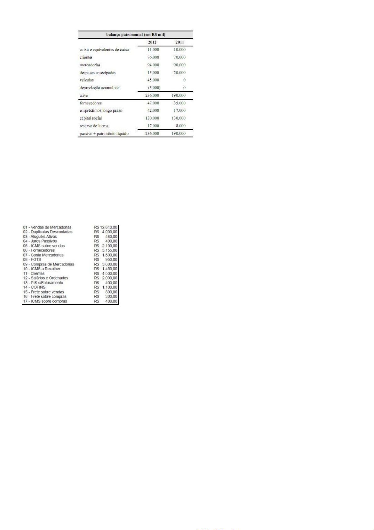 17/08/2021 https://www.exponencialconcursos.com.br/questoes/main/imprimir_meus_cadernos_html/947670 https://www.exponencialconcursos.com.br/questoes/main/imprimir_meus_cadernos_html/947670 95/254 Considere o seguinte balanço patrimonial da Cia. Spirits para os exercícios de 2011 e de 2012. Com base nessas informações e considerando que a companhia reteve todo o lucro de 2012, é correto afirmar que o caixa líquido gerado pelas atividades operacionais da Cia. Spirits em 2012 foi de; a) R$ 16.000,00. b) R$ 21.000,00. c) R$ 1.000,00 d) R$ 6.000,00. e) R$ 11.000,00. 378. Id: 354552 Ano: 2009 Bancas: ESAF Instituições: Receita Federal Provas: Auditor Fiscal da Receita Federal Disciplina: Contabilidade Geral Assuntos: 5.4 Lucro: Bruto, Operacional e Líquido, 5.6 DRE (questões gerais) Em 31.12.2008, a empresa Baleias e Cetáceos S/A colheu em seu livro Razão as seguintes contas e saldos respecti- vos com vistas à apuração do resultado do exercício: O inventário realizado em 31.12.08 acusou a existência de mercadorias no valor de R$ 1.000,00. Considerando que na relação de saldos acima estão indicadas todas as contas que formam o resultado dessa empresa, pode-se dizer que no exercício em causa foi apurado um Lucro Operacional Bruto no valor de a) R$ 9.040,00. b) R$ 6.540,00. c) R$ 5.040,00. d) R$ 4.240,00. e) R$ 2.350,00. 379. Id: 549812 Ano: 2018 Bancas: FCC Instituições: SEFAZ-SC Provas: Auditor-Fiscal da Receita Estadual - Tecnologia da Informação (Prova 2) Disciplina: Contabilidade Geral Assuntos: 4.1.2.4.1 Ativo Intangível (CPC 04) Sobre Ativos Intangíveis, considere: I. Os gastos incorridos com pesquisa devem ser reconhecidos como ativo em desenvolvimento, uma vez que gerarão benefícios futuros para a entidade. II. O ágio derivado da expectativa de rentabilidade futura gerado internamente não deve ser reconhecido como ativo. III. Um ativo intangível com vida útil definida deve ser reconhecido inicialmente pelo custo, deve ser amortizado e não está sujeito ao teste de redução ao valor recuperável, existindo ou não qualquer indicação de redução ao valor recuperável. IV. Um ativo intangível com vida útil indefinida deve ser reconhecido inicialmente pelo custo, não sofre amortização e está sujeito ao teste de redução ao valor recuperável anualmente, existindo ou não qualquer indicação de redução ao valor recuperável. Está correto o que se afirma APENAS em a) I, II e III. b) II e IV. c) I, II e IV. d) III e IV. e) I e III. 380. Id: 162720 Ano: 2013 Bancas: CESPE/ CEBRASPE Instituições: SEFAZ-ES Provas: Auditor Fiscal da Receita Estadual Disciplina: Contabilidade Geral Assuntos: 4.1.1.3.2 Critérios de Avaliação do Estoque - PEPS, UEPS e Média Ponderada