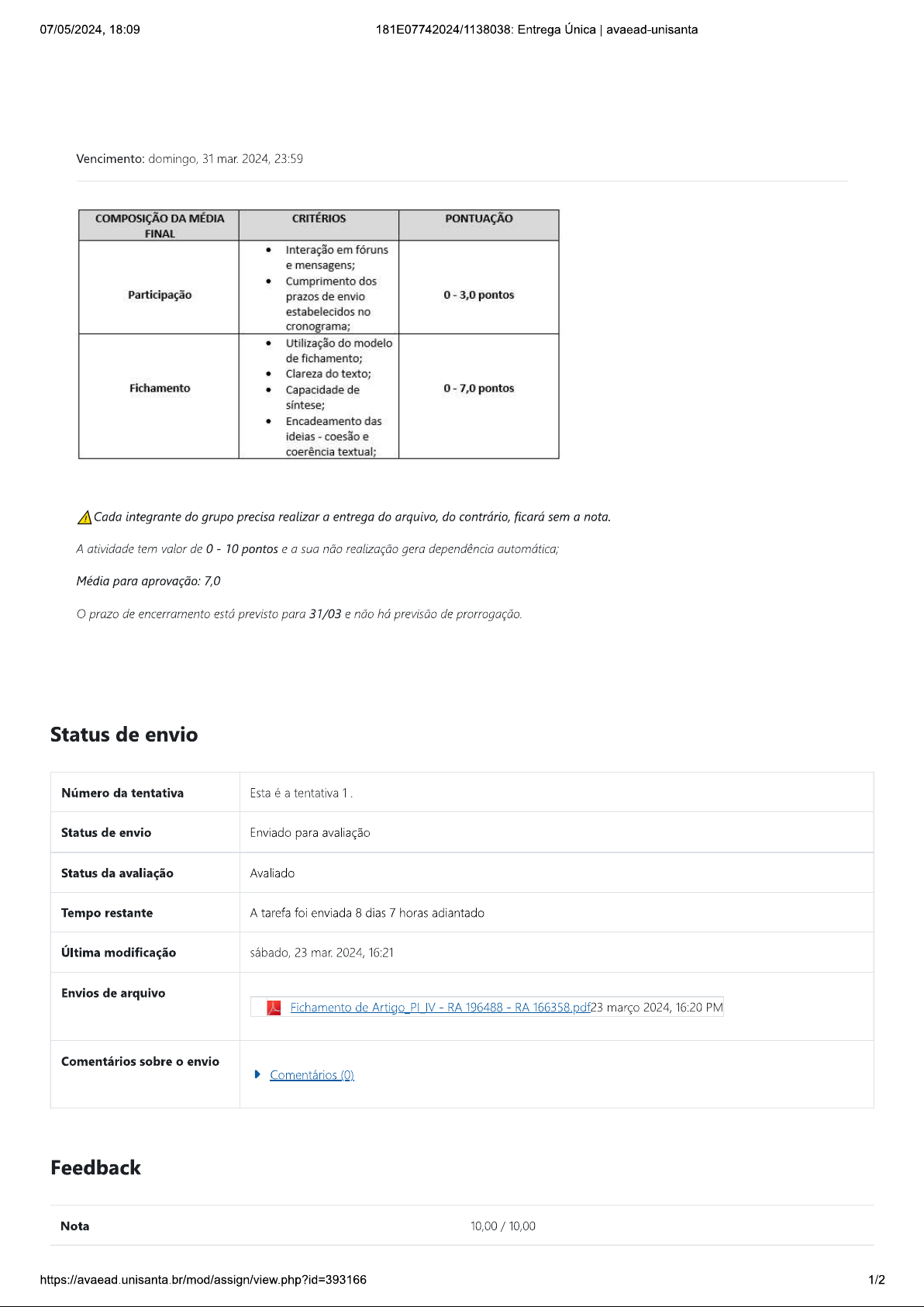 07/05/2024, 18:09 181E07742024/1138038: Entrega Única avaead-unisanta Vencimento: domingo, 31 mar. 2024, 23:59 COMPOSIÇÃO DA MÉDIA CRITÉRIOS PONTUAÇÃO FINAL Interação em fóruns e mensagens; Cumprimento dos Participação prazos de envio 0 3,0 pontos estabelecidos no cronograma; Utilização do modelo de fichamento; Clareza do texto; Fichamento Capacidade de 0 7,0 pontos síntese; Encadeamento das ideias coesão e coerência textual; Cada integrante do grupo precisa realizar a entrega do arquivo, do contrário, ficará sem a nota. A atividade tem valor de 0 - 10 pontos e a sua não realização gera dependência automática; Média para aprovação: 7,0 O prazo de encerramento está previsto para 31/03 e não há previsão de prorrogação. Status de envio Número da tentativa Esta é a tentativa 1. Status de envio Enviado para avaliação Status da avaliação Avaliado Tempo restante A tarefa foi enviada 8 dias 7 horas adiantado Última modificação sábado, 23 mar. 2024, 16:21 Envios de arquivo Fichamento de Artigo PLIV - RA 196488 - RA 166358 pdf23 março 2024, 16:20 PM Comentários sobre o envio Comentários (0) Feedback Nota 10,00 / 10,00 https://avaead.unisanta.br/mod/assign/view.php?id=393166 1/207/05/2024, 18:09 181E07742024/1138038: Entrega Única I avaead-unisanta Avaliado em domingo, 28 abr. 2024, 13:51 Avaliado por Angélica Magalhães Comentários de feedback Oi, Daniela Nota do Falconi Obrigada pela participação. Angélica Magalhães EaD UNISANTA - Educação a Distância UNISANTA | Tel: (13) 3202-7100 / (13) 3202-7101 Rua Cesário Mota, 08 - Bloco E 8° andar - Boqueirão - Santos/SP CEP: 11045-040 https://avaead.unisanta.br/mod/assign/view.php?id=393166 2/2