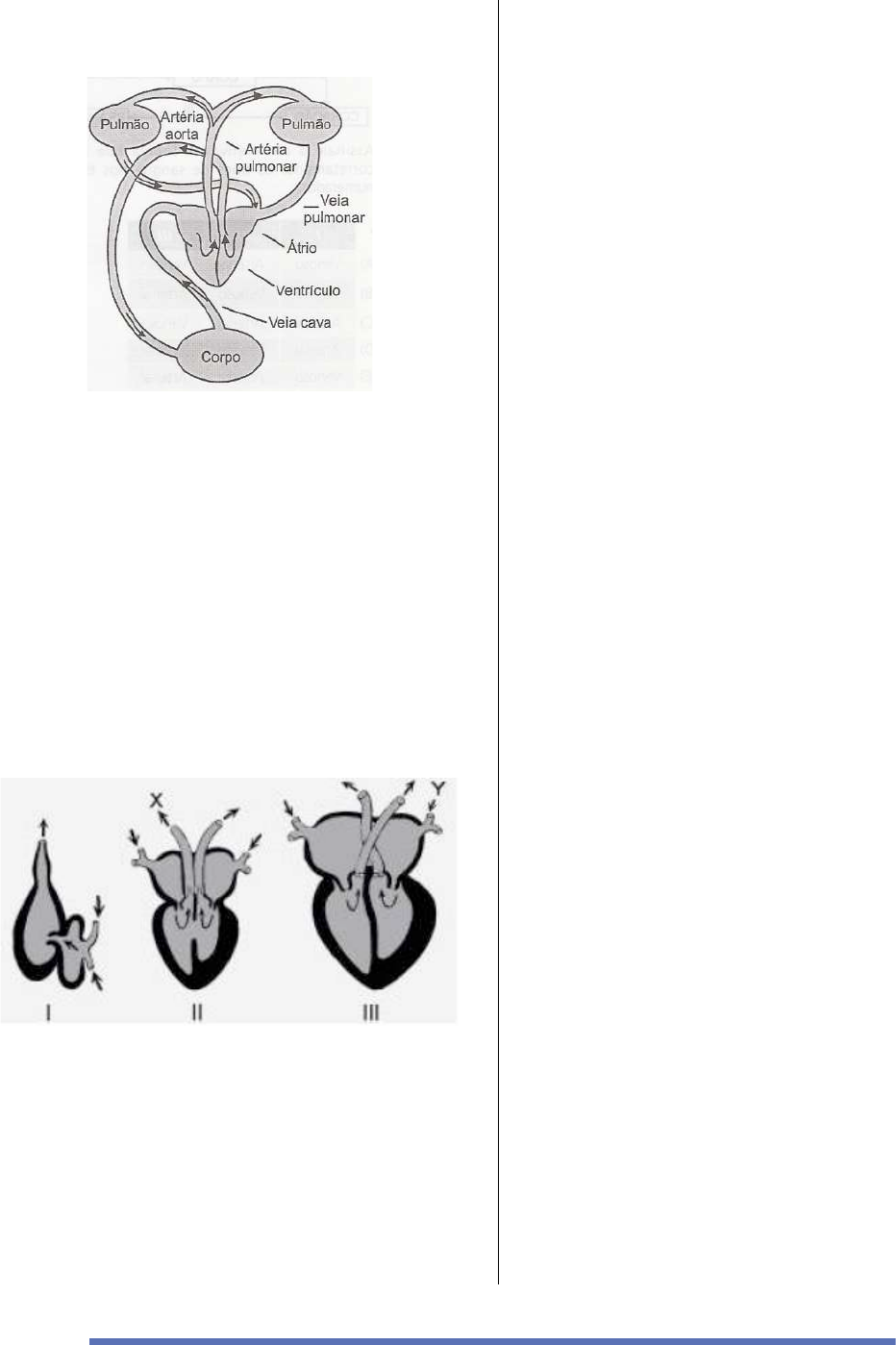 5 VESTIBULARES: As questões abaixo são direcionadas para quem prestará vestibulares tradicionais. Se você está estudando apenas para a prova do ENEM, fica a seu critério, de acordo com o seu planejamento, respondê-las ou não. 21 - (Unifor) O esquema abaixo representa o sistema circulatório de um vertebrado. Esse vertebrado é uma ave, uma vez que, de acordo com o esquema, a) o coração só recebe sangue venoso. b) o coração é formado por quatro cavidades. c) a artéria aorta está voltada para a direita do animal. d) não há mistura de sangue arterial com venoso. e) as veias pulmonares transportam sangue arterial. 22 - (Ufv) A figura abaixo representa tipos de coração (I, II e III) de três Classes de vertebrados diferentes. As setas representam o sentido do fluxo do sangue, inclusive as setas X e Y. Assinale a afirmativa incorreta: a) I está presente nos peixes, enquanto II está presente nos répteis. b) X corresponde ao fluxo de sangue que é levado para os pulmões. c) Y indica o fluxo de sangue que chega ao coração pela veia cava. d) III é encontrado em vertebrados que possuem o músculo diafragma. 23 - (Unp) Os mamíferos apresentam uma circulação dupla e completa. Tal característica confere a estes organismos inúmeras vantagens adaptativas. Nas alternativas abaixo, identifique a justificativa para a existência desse tipo de circulação entre os mamíferos: a) Coração com três cavidades bem delimitadas e a presença de uma única aorta que não permitem a mistura de sangue. b) O coração possui uma completa separação entre os ventrículos e existe apenas uma aorta, o que impede a mistura de sangue. c) Os ventrículos são separados parcialmente pelo septo de Sabatier e possuem duas aortas que impedem a mistura de sangue rico em gás carbônico. e) Coração com quatro cavidades bem delimitadas e a presença de duas aortas que não permitem a mistura do sangue. 24 - (Facid) BEBÊS, TAMBÉM, PODEM NASCER COM PROBLEMAS CARDÍACOS Oito em cada mil crianças nascem com algum problema cardíaco: são as cardiopatias congênitas, que podem ser originadas por diversos fatores durante a formação do coração do feto. Algumas crianças, por exemplo, nascem com um problema conhecido como transposição dos vasos da base. Isso significa que as artérias pulmonares saem do ventrículo esquerdo e a artéria aorta sai do ventrículo direito. Pioneiro no procedimento cirúrgico dessa cardiopatia, Dr. Adib Domingos Jatene descreveu a técnica de correção de transposição dos grandes vasos da base, conhecida hoje como Operação de Jatene, a qual tem sido empregada, com sucesso, em vários Serviços de Cirurgia Cardíaca em todo o mundo. Adaptado de Gewandsznajder, Fernando; Projeto Teláris: Ciências / Fernando Gewandsznajder. 1. Ed. – São Paulo: Ática 2012. – (Projeto Teláris: Ciências). A respeito do tema não é correto afirmar: a) Uma das graves consequências da anomalia morfológica descrita acima é a cianose, condição em que a pele e mucosas adquirem coloração azulada devido ao excesso de oxigenação tecidual, levando à necrose das células naquela região. b) As crianças que são acometidas por esse problema podem apresentar falta de ar, sintoma esperado uma vez que a artéria aorta, erroneamente, sai do ventrículo direito após receber sangue com baixo teor de oxigênio.