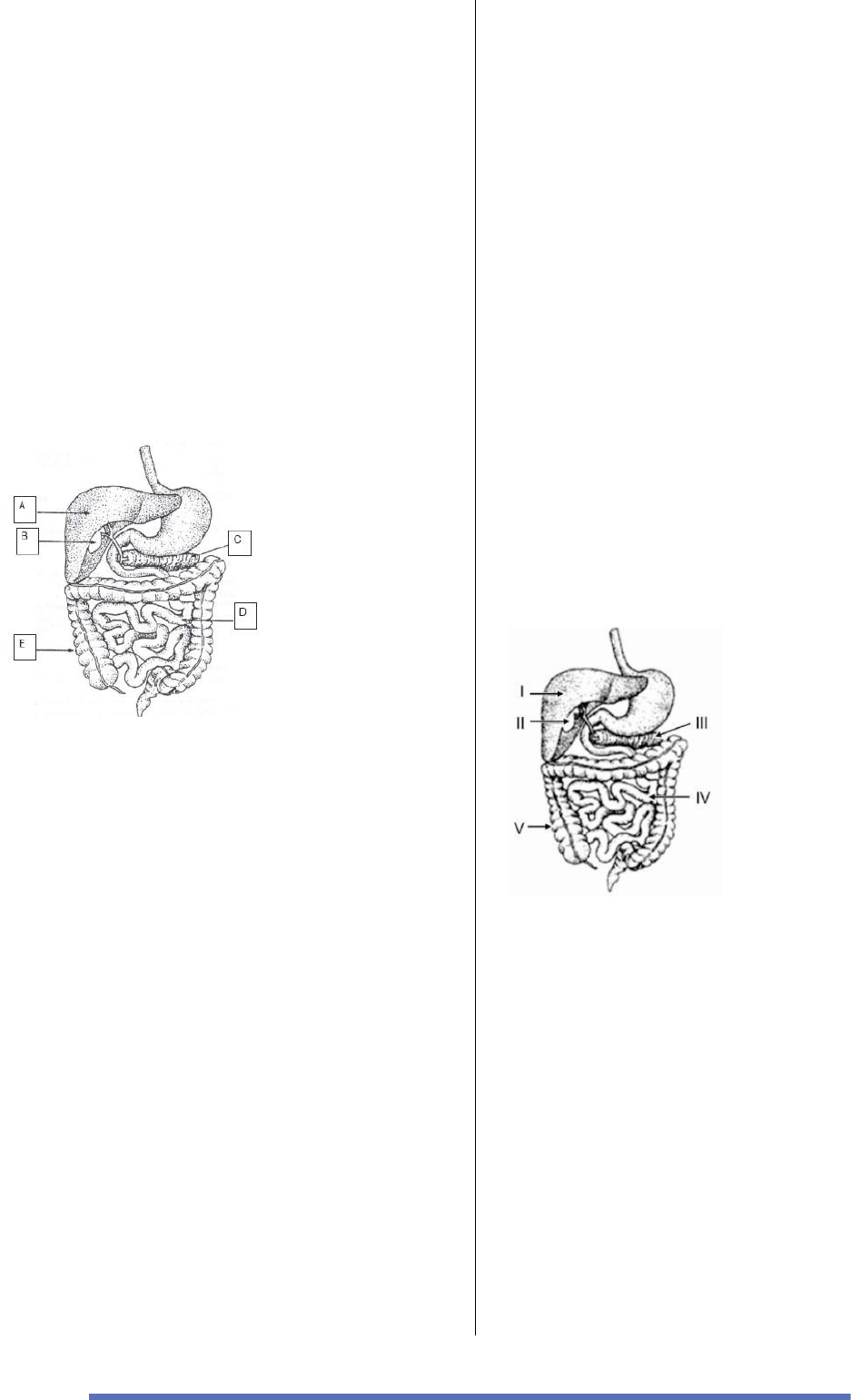 3 conhecimentos de anatomia e fisiologia do sistema digestório humano, é possível afirmar que a referida doença afeta o cólon, a) uma porção do intestino grosso, iniciado pelo ceco intestinal, e o reto. b) ascendente, dificultando a digestão e absorção de substâncias sólidas não metabolizadas. c) transverso, receptor do material não digerido, misturado em muita água, e o reto. d) transverso, responsável pela absorção de água e sais minerais. e) descendente e o reto, que recebe as fezes, constituídas de material digerido. 11 - (Unifor) O esquema abaixo representa uma seção do tubo digestivo humano e seus anexos. Com base no esquema, avalie as seguintes afirmativas: I. A estrutura A representa o fígado que possui funções de regular o nível de glicose no sangue, transformar amônia em ureia e produzir bile. II. A estrutura B mostra o pâncreas, órgão de destaque na produção e armazenamento do líquido biliar, principal meio de eliminação de colesterol do organismo. III. A estrutura C representa a vesícula biliar, responsável pela produção de bile e glucagon, que atuam na digestão de gorduras e no controle glicêmico, respectivamente. IV. As estruturas D e E indicam o intestino delgado e grosso, respectivamente. Órgãos responsáveis pela absorção de nutrientes (intestino delgado), água e eletrólitos (intestino grosso). É correto apenas o que se afirma em: a) I e IV. b) II e V. c) I, III e V. d) I, II, III e IV. e) II, III, IV e V. 12 - (Unichristus) Leia estes trechos. TRECHO 1: Doença celíaca: quase 2 milhões de brasileiros não podem comer glúten. Disponível em:.Acesso em: 2 de agosto de 2017. TRECHO 2: Pesquisadores da Universidade de Bonn, na Alemanha, com colegas da Romênia, descobriram que a versão de um gene pode dobrar ou até triplicar o risco de desenvolver pedras na vesícula. Disponível em: .Acesso em: 2 de agosto de 2017. TRECHO 3: Uma célula comum do pâncreas foi transformada em uma produtora de insulina por um grupo de pesquisadores americanos. Além de ser uma boa notícia para quem sofre com diabetes, o feito é um grande avanço para a Medicina: é a primeira vez que alguém faz isso “pulando” o estágio de célula-tronco. Disponível em:.Acesso em: 2 de agosto de 2017. Agora, observe esta figura. Os trechos 1, 2 e 3 se referem a órgãos do sistema digestório humano que estão respectivamente indicados na figura anterior pelos algarismos a) IV, II e III. b) I, III e IV. c) II, I e V. d) IV, III e I. e) III, IV e II. 13 - (Uerj) Algumas embalagens de alimentos apresentam no rótulo a informação “contém glúten”, obrigatória por resolução da Agência Nacional de Vigilância Sanitária (ANVISA). O glúten apresenta, em sua composição, uma molécula que não deve ser consumida por portadores da doença celíaca, uma enfermidade autoimune crônica do intestino delgado.