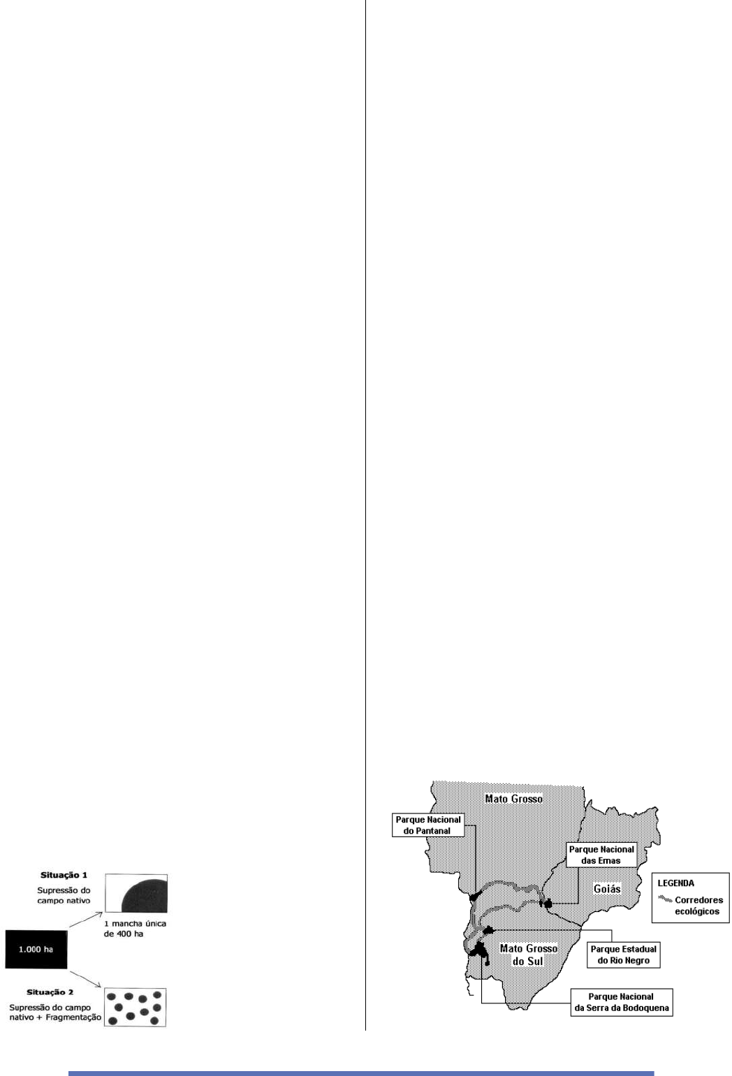 8 IV. Fragmentos especialmente muito finos e compridos ou com formas muito irregulares, apresentando muitas reentrâncias, podem permitir que as perturbações antrópicas penetrem em grande parte da área ou mesmo em toda a área do fragmento, afetando negativamente a floresta. Está correto, apenas, o que se afirma em a) III e IV. b) I, II e III. c) II e III. d) I e IV. e) II. 26 - (Unp) Mais de 99% das espécies que surgiram sobre a Terra estão extintas. Cada evento de extinção modifica a fauna e a flora do período seguinte mediante eliminação de alguns tipos de organismos e aumento relativo de outros. Nos últimos séculos, a intervenção humana, deliberada ou não, passou a desempenhar um papel sem precedentes na história da vida. Adaptado de: PURVES, W.K.; SADAVA, D.; ORIEANS, G.H.;HELLER, H.C. Vida, a ciência da biologia. 6a. ed. Porto Alegre: Artmed, 2002. p. 391-394. Considere as seguintes afirmações sobre processos de extinção de espécies. I. A extinção natural é resultado de constantes modificações dos ecossistemas e da seleção adaptativa. II. A destruição e a fragmentação do habitat são importantes causas da extinção de espécies. III. A redução acentuada de indivíduos de uma espécie poderá levá-la a extinção por baixa variabilidade genética. Assinale: a) Estão corretas todas as afirmações. b) Está correta apenas a afirmação I. c) Está correta apenas a afirmação II. d) Estão corretas as afirmações I e III. 27 - (Ufrgs) Observe a figura abaixo, referente à supressão de campos nativos do Rio Grande do Sul. Fonte: PILLAR, V.P. & LANGE, O. (ed.). Os campos do sul. Porto Alegre: UFRGS. 2015. Com base no esquema, assinale a alternativa que preenche corretamente as lacunas do enunciado abaixo, na ordem em que aparecem. As espécies campestres de mamíferos encontram melhores condições de habitat na situação _____, uma vez que pode ocorrer _____ na situação _____. a) 1 – isolamento geográfico – 2. b) 2 – perda da biodiversidade – 1. c) 2 – aumento de predadores – 1. d) 1 – aumento da biodiversidade – 2. e) 2 – isolamento geográfico – 1. 28 - (Enem) Corredores ecológicos visam mitigar os efeitos da fragmentação dos ecossistemas promovendo a ligação entre diferentes áreas, como o objetivo de proporcionar o deslocamento de animais, a dispersão de sementes e o aumento da cobertura vegetal. São instituídos com base em informações como estudos sobre o deslocamento de espécies, sua área de vida (área necessária para o suprimento de suas necessidades vitais e reprodutivas) e a distribuição de suas populações. Disponível em: www.mma.gov.br. Acesso em: 30 nov. 2017 (adaptado). Nessa estratégia, a recuperação da biodiversidade é efetiva porque a) propicia o fluxo gênico. b) intensifica o manejo de espécies. c) amplia o processo de ocupação humana. d) aumenta o número de indivíduos nas populações. e) favorece a formação de ilhas de proteção integral. 29 - (Ufmg) Analise esta figura: ATALHO PARA A BIODIVERSIDADE: Corredor Ecológico de 800 km interligará parques do Centro-Oeste do Brasil