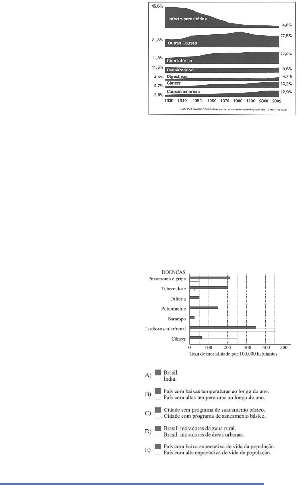 2 Horizonte. De acordo com a pesquisa, 87,10% da população de Fortaleza e 80,87% de Juazeiro do Norte, no Cariri, têm acesso à água distribuída pela Companhia de Água e Esgoto do Ceará (Cagece). Já na coleta de esgoto adequada, menos da metade da população da Capital dispõe do serviço (48,30%). Na terra do Padre Cícero e em Caucaia, a situação ainda é mais preocupante, apenas 26,65% e 22,47% das casas têm o serviço de coleta de esgoto, respectivamente. Segundo o estudo, nessas 100 cidades vivem 40% dos habitantes do país ou 77 milhões de um total de 191 milhões de pessoas. Quase a metade da população desses municípios não conta com a coleta de esgotos. E cerca de 8 bilhões de litros de fezes, urina e outros dejetos são despejados diariamente nas águas dos córregos, dos rios e do mar. Fonte: http://www.opovo.com.br/app/fortaleza/2012/08/16/noticiaforta leza,2900906/ fortaleza-ocupaa-41-posicao-em-pesquisa-de- saneamentobasico-no-pais.shtml Acesso em 02 nov.2012. (com adaptações) Nesse contexto, a falta de instalações sanitárias adequadas é diretamente responsável pelo aumento da incidência de a) doenças cardiovasculares na terceira idade. b) viroses do tipo vírus HPV em adultos jovens. c) síndrome da imunodeficiência adquirida – AIDS. d) infecções por enteroparasitoses em crianças. e) câncer do trato-respiratório em homens. 07 - (Fmo) Segundo relatório da Organização Mundial de Saúde, morreram no mundo, em 2015, cerca de 56,4 milhões de pessoas, sendo diarreias gastrintestinais a segunda causa mais prevalente dentre países pobres. Considerando que tais doenças são geralmente causadas por bactérias, vírus e parasitas eucariontes transmitidos através da água ou alimentos contaminados, é correto afirmar que tais micróbios possuem em comum, além de outras características, a capacidade de: a) produzir toxinas. b) infectar células estomacais. c) multiplicação intracelular. d) disseminação via fecal-oral. e) resistência aos antibióticos. 08 - (Enem) Algumas doenças que, durante várias décadas do século XX, foram responsáveis pelas maiores percentagens das mortes no Brasil, não são mais significativas neste início do século XXI. No entanto, aumentou o percentual de mortalidade devida a outras doenças, conforme se pode observar no diagrama: No período considerado no diagrama, deixaram de ser predominantes, como causas de morte, as doenças a) infecto-parasitárias, eliminadas pelo êxodo rural que ocorreu entre 1930 e 1940. b) infecto-parasitárias, reduzidas por maior saneamento básico, vacinas e antibióticos. c) digestivas, combatidas pelas vacinas, vermífugos, novos tratamentos e cirurgias. d) digestivas, evitadas graças à melhoria do padrão alimentar do brasileiro. e) respiratórias, contidas pelo melhor controle da qualidade do ar nas grandes cidades. 09 - (Unifesp) Observe o gráfico e assinale a alternativa que contém legendas que explicam corretamente as diferenças observadas.