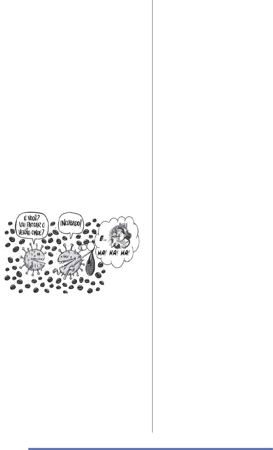 13 De acordo com a figura, o lobo mau fugiu dos porquinhos devido à gripe suína ser a) transmitida pelo retrovírus influenza H1N1 modificado, que acomete o indivíduo inicialmente com uma tosse seca, e pode evoluir para uma tosse com expectoração e falta de ar. b) desencadeada pelo retrovírus H1N1, cuja enfermidade provoca muita tosse, coriza, febre e olhos irritados, além de um estágio catarral. c) transmitida pelo adenovírus H1N1 modificado, que motiva uma doença com tosse seca, que evolui com catarro amarelo, esverdeado ou com sangue, dor torácica, febre e dificuldade para respirar, devido ao agente infeccioso atingir os alvéolos pulmonares. d) ocasionada pelo adenovírus influenza da gripe aviária, que desenvolve uma enfermidade caracterizada por febres altas, que podem vir acompanhadas de diarreia, além de dores nas articulações e nos músculos. e) causada pelo vírus influenza H1N1 modificado, que pode ser adquirido através de partículas virais em momentos de tosse ou espirro, cujos sintomas provocam picos de febres acima de 38°C, com diarreias, dificuldades para respirar e dores de cabeça. 47 - (Facisa) http://drfrederico.blogspot.com.br/2012/06/resfriado-gripe-ou- alergia.html (Acesso em 12/10/2013) Com base na ilustração e nos conhecimentos sobre vírus, considere as afirmativas abaixo. I. O diálogo ilustrado ocorre entre dois vírus envelopados, que podem ser reconhecidos pela presença evidente das espículas H e N, as quais permitem, respectivamente, sua ligação e seu desprendimento da célula hospedeira. II. Um indivíduo que realizou a prévia imunização passiva para o tipo de vírus destacado apresentará uma memória imunológica, que foi conseguida por meio de uma rápida e substanciosa produção de anticorpos. III. O vírus, que passará as férias incubado, penetrará na célula hospedeira por endocitose e, após ter o seu capsídeo rompido, liberará o RNA viral, que migrará para o núcleo celular e servirá de molde para a produção de moléculas complementares. IV. Em um indivíduo não imunizado, o vírus infectará a sua célula hospedeira com o RNA viral que será transcrito em DNA viral, pela transcriptase reversa, e incorporado ao DNA celular para servir de molde à produção de RNA viral. Estão corretas apenas a) I e III. b) II e III. c) II e IV. d) I, II e III. e) III e IV. 48 - (Uema) Segundo a Organização Mundial da Saúde, o vírus da gripe do frango fez 79 vítimas humanas no Camboja, na Tailândia e no Vietnã entre janeiro de 2004 e abril de 2005. Veja, ano 38, n. 15, 13 de abril de 2005. p.120-4. Essa doença é causada pelo vírus conhecido como: a) H5N1. b) H1N1. c) H5N5. d) H2N1. e) H2N2. 49 - (Ufcg) A “gripe do frango” foi identificada pela primeira vez na Itália, há cerca de 100 anos. Acreditava- se que a gripe só infectava aves, até que os primeiros casos humanos foram detectados em Hong Kong, em 1997. Na época, todas as aves – em torno de 1,5 milhão – foram mortas em três dias. Especialistas acreditam que a medida foi decisiva para conter a epidemia. Gripe Aviária. Revista Veja em 27 de janeiro de 2004. Para a avicultura brasileira, a entrada da doença no País pode representar prejuízos incalculáveis. No disputado mercado mundial da carne do frango, um mero foco de Influenza é suficiente para suspender contratos e provocar muitas perdas para as agroindústrias e produtores brasileiros. Leia as afirmações a seguir: I. Pessoas contraem a doença por meio de contato direto com aves vivas infectadas. O agente etiológico está presente nas fezes das aves, que secam, são pulverizadas e depois, podem ser inaladas. Ele consegue sobreviver por um longo período nos tecidos e nas fezes das aves mortas, particularmente sob baixas temperaturas. II. O agente etiológico causador da gripe do frango é um Haemophilus influenza: o vírus H5N1 que infecta os humanos e pode causar a morte. Existem 15 diferentes