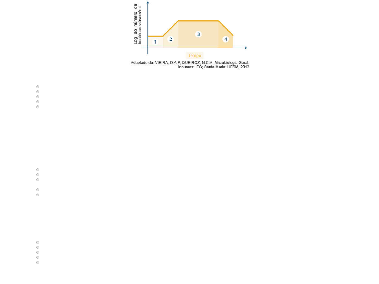Assinale a alternativa correta. a) A fase 1 corresponde a uma etapa em que não há divisão celular devido à ausência de nutrientes e oxigênio b) A fase 2 corresponde a uma rápida divisão celular, em que as bactérias crescem em progressão geométrica c) A fase 3 corresponde a um equilíbrio entre o número de células mortas e o de células produzidas em decorrência do excesso de nutrientes disponíveis d) A fase 4 corresponde a uma elevada produção de células, motivo pelo qual o logaritmo do número de células viáveis/mL decresce com o tempo e) A fase 2 corresponde a uma baixa divisão celular, pois, com o crescimento bacteriano, a oferta de nutrientes diminui Esta questão não possui comentário do professor no site. www.tecconcursos.com.br/questoes/467426 Questão 154: IBFC - Per Of (PCie PR)/PCie PR/Perito Criminal/Área 6/2017 Assunto: Bactérias A tecnologia da biorremediação é baseada em processos nos quais ocorrem reações bioquímicas mediadas por microrganismos. Em geral, um composto orgânico, quando é oxidado, perde elétrons para um aceptor final de elétrons, que é reduzido. O oxigênio comumente atua como aceptor final de elétrons quando presente e a oxidação de compostos orgânicos com a redução do oxigênio molecular é chamado de respiração aeróbia heterotrófica. No entanto, quando o oxigênio não está presente, microrganismos podem usar compostos orgânicos ou íons inorgânicos como aceptores finais de elétrons alternativos, condições estas chamadas de anaeróbias. Com base no exposto, assinale a alternativa correta. a) A biodegradação anaeróbia pode ocorrer, por exemplo, pela desnitrificação, pela redução do ferro ou pela redução do sulfato b) Hidrocarbonetos com baixo a médio peso molecular e álcoois são exemplos de compostos de baixíssima biodegradabilidade c) Biorremediação “ex situ” é realizada no próprio local, sem que haja remoção de material contaminado. Isso evita custos e distúrbios ambientais associados com o movimento de solos e águas que estão contaminados para outros locais destinados ao tratamento d) A biodegradação de hidrocarbonetos é essencialmente um processo hidrolítico, no qual o hidrocarboneto é reduzido pelo oxigênio, quando em condições aeróbias e) A biodegradação aeróbia pode ocorrer, por exemplo, pela desnitrificação, pela redução do ferro ou pela redução do sulfato Esta questão não possui comentário do professor no site. www.tecconcursos.com.br/questoes/467427 Questão 155: IBFC - PEB (SEDUC MT)/SEDUC MT/Biologia/2017 Assunto: Bactérias As bactérias fazem parte do reino monera, são encontradas em todos os tipos habitats até os mais extremos, e são seres extremamente simples. Sobre as bactérias, assinale a alternativa correta: a) Só se reproduzem através do processo de conjugação b) Não apresentam membrana nuclear c) Sua respiração é apenas anaeróbica d) Apresentam mitocôndrias no citoplasma e) Todas são heterótrofas Esta questão não possui comentário do professor no site. www.tecconcursos.com.br/questoes/570873 Questão 156: IBFC - PEB (PM MG)/PM MG/Ciências/Biologia/2015 TEC Concursos - Questões para concursos, provas, editais, simulados. https://www.tecconcursos.com.br/questoes/cadernos/experimental/17805158/imprimir 49 of 62 21/06/2020 13:15
