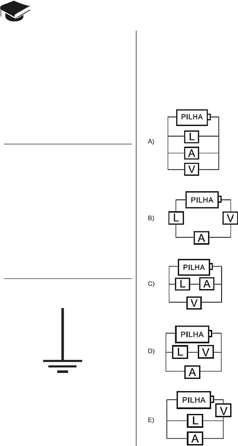CADERNO FÍSICA ENEM novocadernoenem@gmail.co 4 B) um dos princípios da termodinâmica, segun- do o qual o rendimento de uma máquina térmica nunca atinge o ideal. C) o funcionamento cíclico de todos os motores. A repetição contínua dos movimentos exige que parte da energia seja transferida ao próximo ciclo. D) as forças de atrito inevitável entre as peças. Tais forças provocam desgastes contínuos que com o tempo levam qualquer material à fadiga e ruptura. E) a temperatura em que eles trabalham. Para atingir o plasma, é necessária uma temperatura maior que a de fusão do aço com que se fazem os motores. Questão 113 (2012.1) Nossa pele possui células que reagem à inci- dência de luz ultravioleta e produzem uma subs- tância chamada melanina, responsável pela pigmentação da pele. Pensando em se bronze- ar, uma garota vestiu um biquíni, acendeu a luz de seu quarto e deitou-se exatamente abaixo da lâmpada incandescente. Após várias horas ela percebeu que não conseguiu resultado algum. O bronzeamento não ocorreu porque a luz emi- tida pela lâmpada incandescente é de: A) baixa intensidade. B) baixa frequência. C) um espectro contínuo. D) amplitude inadequada. E) curto comprimento de onda. Questão 114 (2012.2) No manual de uma máquina de lavar, o usuário vê o símbolo: Este símbolo orienta o consumidor sobre a ne- cessidade de a máquina ser ligada a: A) uma rede de coleta de água da chuva. B) um fio neutro para evitar sobrecarga elétrica. C) um fio terra para aproveitar as cargas elétri- cas do solo. D) um fio terra para evitar sobrecarga elétrica. E) uma rede de coleta de esgoto doméstico. Questão 115 (2012.2) Um eletricista precisa medir a resistência elétri- ca de uma lâmpada. Ele dispõe de uma pilha, de uma lâmpada (L), de alguns fios e de dois aparelhos: um voltímetro (V), para medir a dife- rença de potencial entre dois pontos, e um am- perímetro (A), para medir a corrente elétrica. O circuito elétrico montado pelo eletricista para medir essa resistência é: Na sequência apresentamos a relação das provas presentes no Caderno Enem. A sigla no início de cada questão é uma referência do ano e da ordem de aplicação da prova. Por exemplo, uma questão com a sigla ENEM 2014.2 foi aplicada nas Unidades Prisio- nais no ano de 2014, conforme explicamos: ENEM 2018.2 - Prova Unidades Prisionais 2018 Questão 113 (2012.1) Questão 114 (2012.2) Questão 115 (2012.2)