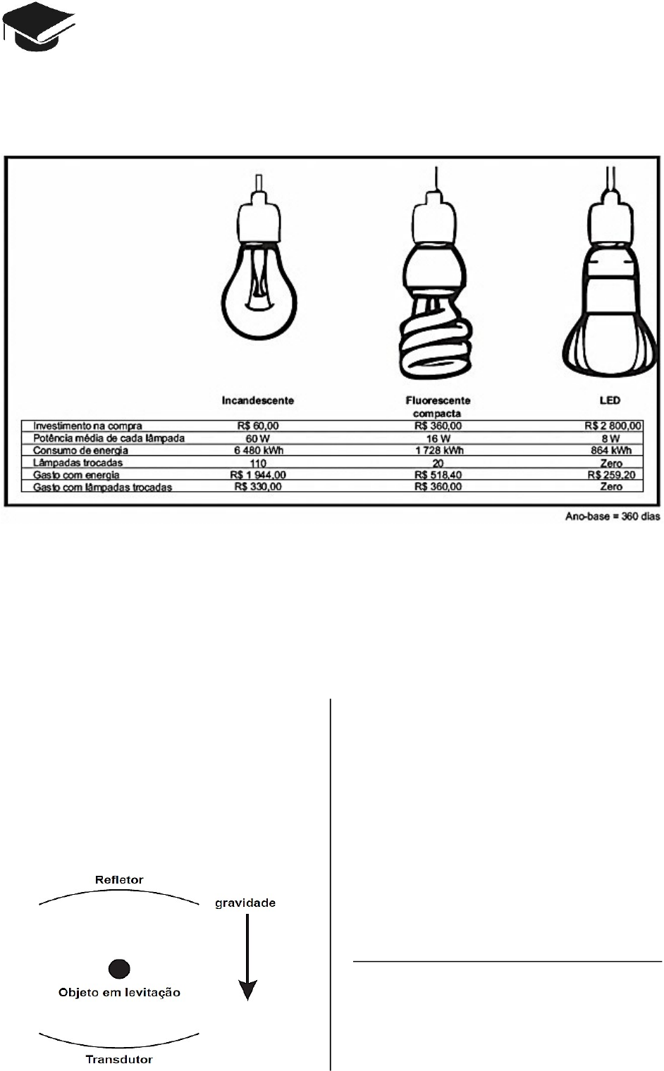 CADERNO FÍSICA ENEM novocadernoenem@gmail.co 6 Questão 192 (2014.2) A figura apresenta a comparação dos gastos de três tipos de lâmpadas residenciais de mesmo brilho, durante cinco anos. Considera-se a utilização média de vinte pontos de luz, utilizando em média dez lâmpadas acesas durante 6 horas ao custo de R$0,30, para cada 1kWh consumido. Com base nas informações, a lâmpada energeticamente mais eficiente, a mais viável economicamente e a de maior vida útil são, respectivamente: A) fluorescente compacta, LED, LED. B) LED, fluorescente compacta, LED. C) fluorescente compacta, incandescente, LED. D) LED, incandescente, fluorescente compacta. E) fluorescente compacta, fluorescente compacta, LED. Questão 193 (2014.3) O fenômeno da levitação de corpos ocorre, na Terra, quando a força gravitacional a equilibra- da, fazendo com que um objeto paire no ar. O som pode fazer objetos levitarem, fenômeno chamado de levitação acústica. Um levitador acústico deve conter um transdutor, que uma superfície vibratória que emite o som, e um re- fletor. Ambos têm superfícies côncavas para focalizar o som, conforme a ilustração: Para que haja a levitação indicada na figura, a força que equilibra o peso do objeto deve ser decorrente da: A) ação mecânica direta do transdutor sobre o objeto. B) ressonância que ocorre entre a onda sonora e o objeto. C) pressão que o som emitido pelo transdutor aplica no objeto. D) interferência destrutiva do som que anula o movimento do objeto. E) diferença de pressão dos sons emitido e refletido aplicada no objeto. Questão 194 (2014.3) A ilustração a seguir representa uma das mais conhecidas obras do artista gráfico holandês M. C. Escher. Seu trabalho tem como características as figu- ras geométricas e ilusões de Óptica. Na sequência apresentamos a relação das provas presentes no Caderno Enem. A sigla no início de cada questão é uma referência do ano e da ordem de aplicação da prova. Por exemplo, uma questão com a sigla ENEM 2014.2 foi aplicada nas Unidades Prisio- nais no ano de 2014, conforme explicamos: ENEM 2018.2 - Prova Unidades Prisionais 2018 Questão 192 (2014.2) Questão 193 (2014.3) Questão 194 (2014.3)