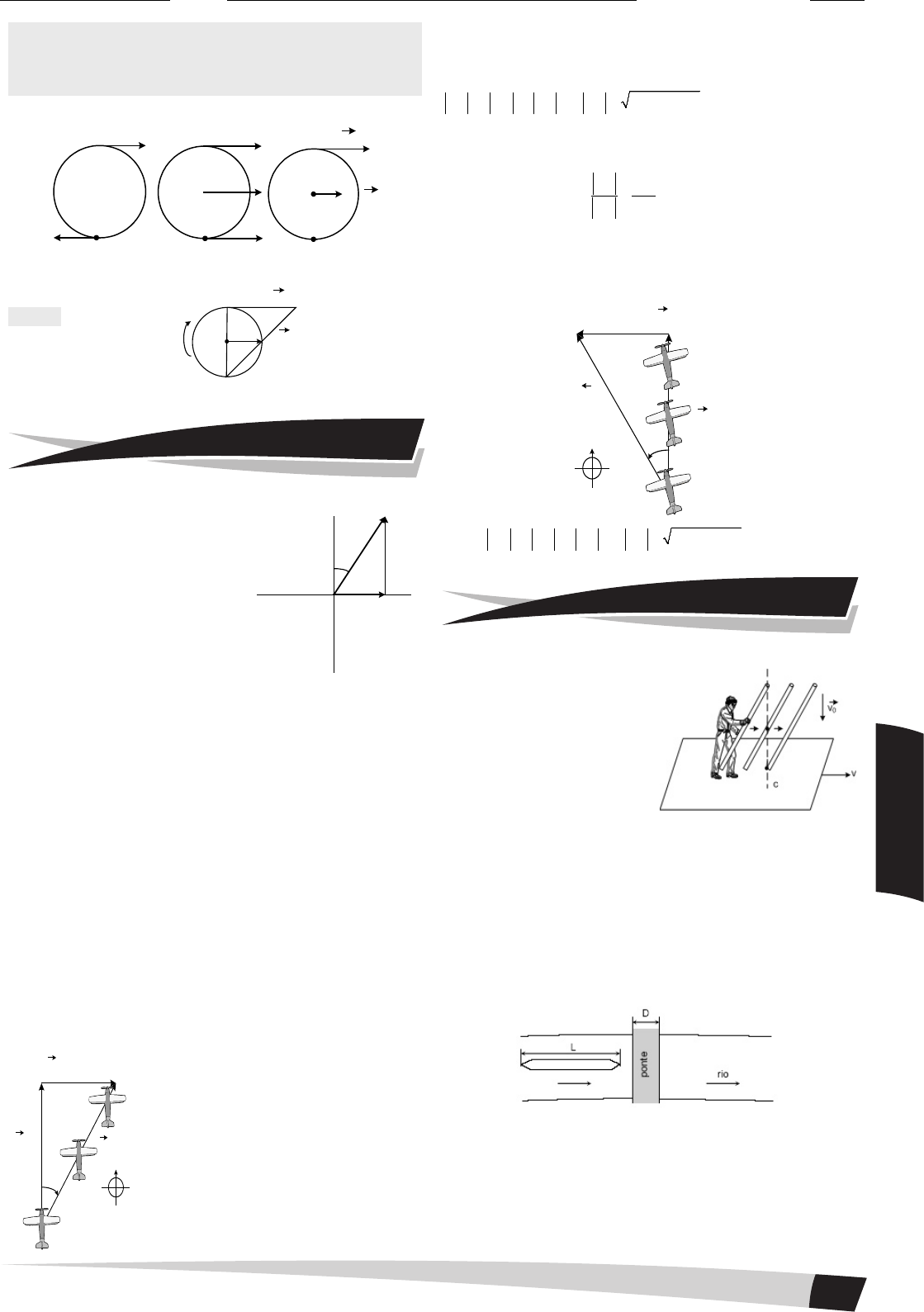 FÍ SI CA I Questões Resolvidas 30° v2 v21 v1 N LO S 01. Um barco viaja na direção oeste- leste, sentido leste com a velocidade de 10km/h. Qual deve ser a velocidade de um segundo barco com a direção 30º a leste da direção sul-norte no sentido nordeste, caso este segundo barco, esteja sempre diretamente ao norte em relação ao primeiro? Solução V1 = velocidade do primeiro barco em relação à Terra; V2 = velocidade do segundo barco em relação à Terra. Seja V21 a velocidade relativa do segundo barco em relação ao primeiro. Então: V2 = V21 + V1 (veja a figura), onde V21 deve ter orientação norte. Portanto v2.sen30º = v1 = 10km/h, então: v2=20km/h 02. A bússola de um avião mostra que ele se desloca do sul para o norte, e seu indicador de velocidade do ar mostra que ele está se movendo no ar com velocidade igual a 240 km/h. a) Se existe um vento de 100 km/h de oeste para leste, qual é a veloci- dade do avião em relação à Terra? b) Em que direção o piloto deve inclinar o avião para que ele siga de sul para o norte? Qual seria, então, sua velocidade em relação à Terra? Solução a) Aqui temos a seguinte soma vetorial: AT AV VTv v v= + onde: ATv é a velocidade do avião em relação à Terra AVv é a velocidade do avião em relação ao vento VTv é a velocidade do vento em relação à Terra Em composição de movimentos de rotação com translação, podemos raciocinar a partir do conceito do centro instantâneo de rotação (CIR) que seria o ponto 1 na figura a seguir. Mov. Rel. 1 Mov. Arrast. 1 Mov. Arrast. V 2V O 1 Ponto 3: v3 = ω2R Ponto O: vO = ωR v3 = 2vO R O R 3 1 (CIR) W V3 V0 Questões Propostas Como as componentes são ortogonais, podemos calcular diretamente utilizando Pitágoras: 2 2 2 2 2 AT AV VT ATv v v v 240 100 260km/h= + → = + = b) A direção em relação à direção sul-norte é determinada pelo ângulo φ. Observe a figura a seguir: Então temos que: VT AV v 100sen 25 240v φ = = → φ ≅ ° Para determinar a velocidade do avião em relação à Terra, utilizamos a mesma soma vetorial: AT AV VTv v v= + Aplicando Pitágoras temos: N L O S vAT vAV = 240 km/h, com ângulo vVT =100 km/h, leste ,norte φ φ 2 2 2 2 2 AV AT VT ATv v v v 240 100 218km/h= + → = − ≅ 01. (VUNESP) Um homem, em pé sobre uma plataforma que se move horizontalmente para a direita com velocidade constante v= 4,0m/s, observa que, ao inclinar em 45° um tubo cilíndrico oco, permite que uma gota de chuva, que cai verticalmente com velocidade c constante em rela- ção ao solo, atravesse o tubo sem tocar em suas paredes. Determine a velocidade c da gota da chuva, em m/s. 02. (UFPE/UFRPE) Um barco de comprimento L = 80 m, navegando no sentido da correnteza de um rio, passa sob uma ponte de largura D = 25 m, como indicado na figura. Sabendo-se que a velocidade do barco em relação ao rio é v B = 14 km/h, e a velocidade do rio em relação às margens é v R = 4 km/h, determine em quanto tempo o barco passa completamente por baixo da ponte, em segundos. 03. (UFPE/UFRPE) Dois trens idênticos trafegam em sentidos contrários na mesma linha férrea retilínea e horizontal, em rota de colisão. Um trem partiu da estação A, e outro saiu da estação B. Ambos partiram do repouso no mesmo instante. A distância entre as estações é D = 4 km, e o intervalo de tempo até a colisão é ∆t = 5 minutos. Supondo que as resultantes das forças que atuam nos trens são constantes e têm módulos iguais, determine a velocidade relativa de aproximação dos trens, no instante da colisão, em km/h. N LO S vAT vAV = 240 km/h, norte vVT =100 km/h, leste φ Prof. Sérgio Torres Caderno - 01 - Com Resoluções das Questões Física 41 42 #sergiorbtorres - sergiorbtorres@gmail.com - Blog de Ciências - Canal do Youtube
