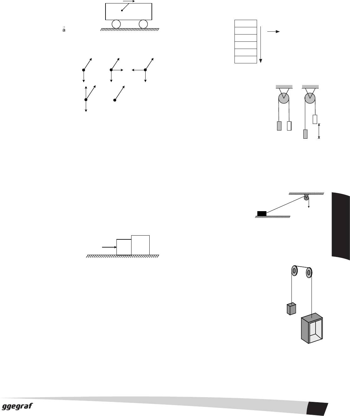 a m T P m T P m a) b) T P m c) T P m d) N T m e) cpF cfF BA F m2m (a) m 2m (b) h F 13 FÍ SI CA I 05. (UPE) No teto de um elevador, está pendurado um dinamômetro que tem, na sua outra extremidade, um pequeno corpo de peso 1,6 N. O dinamômetro, no entanto, acusa 2,0 N. O elevador está a) subindo com velocidade constante. b) em repouso. c) descendo com velocidade constante. d) subindo com velocidade crescente. e) descendo com velocidade crescente. 06. (UFJF) Na figura, representamos uma esfera de massa m, presa ao teto de um vagão e em repouso em relação a este. O vagão desloca-se em movimento retilí- neo com uma aceleração para a direita em relação ao solo. Do ponto de vista de um observador em repouso em relação ao solo, qual das opções a seguir representa corretamente as forças que atuam sobre a massa m? :T Tração da corda :P Força peso :Fcp Força centrípeta :N Força normal :Fcf Força centrífuga 07. (PUC-RS) No estudo das leis do movimento, ao tentar identificar pares de forças de ação-reação, são feitas as seguintes afirmações: I. Ação: A Terra atrai a Lua. Reação: A Lua atrai a Terra. II. Ação: O pulso do boxeador golpeia o adversário. Reação: O adversário cai. III. Ação: O pé chuta a bola. Reação: A bola adquire velocidade. IV. Ação: Sentados numa cadeira, empurramos o assento para baixo. Reação: O assento nos empurra para cima. O princípio da ação-reação é corretamente aplicado a) somente na afirmativa I. d) somente nas afirmativas I e IV. b) somente na afirmativa II. e) nas afirmativas I, II, III e IV. c) somente nas afirmativas I, II e III. 08. (UFSM) A figura representa dois corpos A e B que, sendo em- purrados por uma força F, em uma superfície sem atrito, movem-se com a mesma aceleração. Pode-se, então, afirmar que a força que o corpo A exerce sobre o corpo B é, em módulo, a) menor do que a força que B exerce sobre A. b) maior do que a força que B exerce sobre A. c) diretamente proporcional à diferença entre as massas dos corpos. d) inversamente proporcional à diferença entre as massas dos corpos. e) igual à força que exerce sobre B. 09. (UEL) O cabo de um reboque arrebenta se nele for aplicada uma força que exceda 1800 N. Suponha que o cabo seja usado para rebocar um carro de 900 kg ao longo de uma rua plana e retilínea. Nesse caso, que aceleração máxima o cabo suportaria? a) 0,5 m/s2 b) 1,0 m/s2 c) 2,0 m/s2 d) 4,0 m/s2 e) 9,0 m/s2 10. (UFPE/UFRPE) Uma partícula de massa m = 2,0 kg move-se, a partir do repouso, sobre uma superfície horizontal sem atrito, sob a ação de uma força constante cujas componentes nas direções x e y são, respectivamente, Fx = 30 N. As direções x e y são definidas sobre a superfície horizontal. Calcule o módulo da velocidade da partícula, em m/s, decorridos 3,0s. 11. (ITA) Uma pilha de seis blocos iguais, de mesma massa m, repousa sobre o piso de um elevador, como mostra a figura. O elevador está subindo em movimento uniformemente retardado com uma aceleração de módulo a. O módulo da força que o bloco 3 exerce sob o bloco 2 é dado por: 1 2 3 4 5 6 a) 3m(g+a) b) 3m(g-a) c) 2m(g+a) d) 2m(g-a) e) m(2g-a) 12. (UFRJ) O sistema ilustrado na figura é uma máquina de Atwood. A roldana tem massa desprezível e gira livremente em torno de um eixo fixo perpendicular ao plano da figura, pas- sando pelo centro geométrico da roldana. Uma das massas vale m e a outra, 2m. O sistema encontra-se inicialmente na situação ilustrada pela figura (a), isto é, com as duas massas no mesmo nível. O sistema é então abandonado a partir do repouso e, após um certo intervalo de tempo, a distância vertical entre as massas é h, figura (b). Calcule o módulo da velocidade de cada uma das massas na situação mostrada na figura (b). 13. (UFPE/UFRPE) Um pequeno bloco de 0,50 kg desliza sobre um plano horizontal sem atrito, sendo pu- xado por uma força constante F = 10,0 N aplicada a um fio inextensível que passa por uma roldana, conforme a figura. Qual a aceleração do bloco, em m/s2, na direção paralela ao plano, no instante em que ele perde o contato com o plano? Despreze as massas do fio e da roldana, bem como o atrito no eixo da roldana. a) 12,4 b) 14,5 c) 15,2 d) 17,3 e) 18,1 14. (UPE) Um elevador tem, vazio, 1000 kgf. A carga máxima prevista é de 1000 kgf. O contra-peso é dimensionado para a carga média. Se faltar ener- gia e os freios falharem, o que ocorrerá (assinale V ou F)? Desconsidere o atrito). I. Se o elevador estiver subindo totalmente carrega- do, a aceleração, após o acidente, será de – 1,4 m/s2. II. Se o elevador estiver subindo totalmente vazio, a aceleração, após o acidente, será de + 1,4 m/s2. III. Se o elevador estiver descendo totalmente carregado, a aceleração, após o acidente, será +1,4 m/s2. IV. Se o elevador estiver descendo totalmente vazio, a aceleração, após o acidente, será de – 2 m/s2. V. Se o elevador estiver parado, totalmente vazio, subirá, após o aci- dente, com aceleração de +2 m/s2. a Prof. Sérgio Torres Apostila 02 Física Pura 15/05/2010 13/181 Sergio Torres fisica