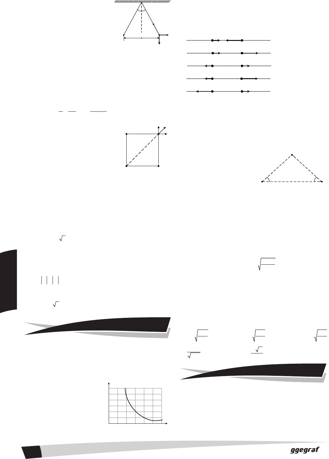 D d q d q q q F1 F2 F3 d Questões Propostas F θθ q mg TL m q md 5,0 2,5 0 0 1,0 2,0 3,0 4,0 5,0 6,0 F(10-8N) r(m) 30° 30° L L q qA qB Questões de Vestibulares 6 FÍ SI CA II 02. Duas esferas idênticas possuem a mesma carga q. Elas estão presas às extremidades de dois fios de mesmo com- primento L, conforme indicado na figura de termine o módulo da tensão num dos fios em equilíbrio. Solução: De acordo com a Lei de Coulomb,temos: F = k0q 2/d2 Em geral o ângulo θ é muito pequeno, pois normalmente o peso do corpo é muito maior do que a força elétrica; neste caso, podemos usar a expressão aproximada: sen θ = tg θ = d /2L Tsenθ = F � T · 2 2 d kq 2l d = � 2 3 2LkqHT d = 03. Quatro cargas puntiformes positivas (cada uma igual a q) estão dispostas nos vértices de um quadrado de lado igual a d, conforme indicado na figura. As cargas se encontram em equilíbrio no vácuo; os suportes isolantes que mantêm estas cargas em repou- so não são indicados na figura. Determine o módulo da força resultante sobre um das quatro cargas. Despreze a atração gravitacional. Solução: O módulo da força resultante sobre qualquer uma das quatro cargas deve ser o mesmo (pela simetria do problema). Pela Lei de Coulomb: F1 = F2 = k0q 2/d2 (1) F3 = k0q 2/D2 (2) D2 = 2d2 � D = d 2 O Princípio da Superposição, permite escrever: 1 2 3F' F F F= + + Como 1 2F F= , a resultante da soma de 1F com 2F ,está na mesma direção e sentido da força 3F . Portanto, a resultante F está na mesma direção de 3F . O módulo F da resultante será: ( )2 2 0F k q 1 2 2 / 2 d= + 01. (UFPE/UFRPE) Duas cargas elétricas puntiformes positivas estão separadas por 4cm e se repelem com uma força de 27 x 10-5N. Suponha que a distância entre elas seja aumentada para 12cm Qual é o novo valor da força de repulsão entre as cargas, em unidades de 10-5N? 02. (UFPE/UFRPE) O gráfico abai- xo representa a força F entre duas cargas pontuais positivas de mesmo valor, separadas pela distância r. Determine o valor das cargas, em unidades de 10-9C. a) 1,0 b) 2,0 c) 3,0 d) 4,0 e) 5,0 03. (UFPE/UFRPE) Duas partículas de mesma massa têm cargas Q e 3Q. Sabendo-se que a força gravitacional é desprezível em compara- ção com a força elétrica, indique qual das figuras melhor representa as acelerações vetoriais das partículas. Q 3Q Q 3Q Q 3Q Q 3Q Q 3Q a) b) c) d) e) 04. (UFPE/UFRPE) Duas cargas puntiformes, q1 = +1 mC e q2 = -4 mC, estão fixas no vácuo a uma distância de 1,0 m entre si. Uma terceira carga puntiforme e positiva q3 é posicionada ao longo da linha reta que passa pelas outras duas. Calcule a distância, em metros, entre a terceira carga e a carga positiva de forma que ela permaneça em equilíbrio estático. 05. (MACKENZIE) Duas cargas elétricas puntiformes idênticas qa e qb, cada uma com 1 x 10-7 C, en- contram-se fixas sobre um plano horizontal, conforme a figura ao lado. Uma terceira carga q, de mas- sa 10 g, encontra-se em equilíbrio no ponto P, formando assim um triângulo isósceles vertical. Sabendo que as únicas forças que agem em q são as de interação eletrostática com qa e qb e seu próprio peso, o valor desta terceira carga é: (Dado: L = 3,0 cm). a) 1 x 10-5 C b) 2 x 10-6 C c) 1 x 10-6 C d) 2 x 10-7 C e) 1 x 10-7 C 06. Dois pêndulos elétricos tem o mesmo comprimento L. Suas massas pendulares tem o mesmo peso P e são carregadas com a mesma carga Q. Repelem-se e na posição de equilíbrio os fios formam um ângulo α com a vertical. Nessas condições prove que: Q = 2L P tg k ⋅ α . sen α 07. (UPE) Existem vários modelos para explicar o comportamento dos átomos. O Modelo de Bohr é o mais simples para explicar algumas propriedades do átomo de hidrogênio. No modelo de Bohr do átomo de hidrogênio, um elétron (q = - e) circunda um próton (q = + e) em uma órbita de raio R. Qual a velocidade do elétron nessa órbita? Considere K como a constante da lei de Coulomb e m a massa do elétron. Ka) 2 e m R 2Kb) e m R Kc) e m R e Kd) m R e Ke) m R 01. (UNICAP) I II 0 0 Sempre que colocamos dois condutores eletrizados em contato, ocorrerá transferência de cargas de um para o outro. 1 1 Na eletrização por atrito, os corpos se eletrizam com cargas de sinais opostos. 2 2 Os isolantes não podem ser eletrizados. Prof. Sérgio Torres Apostila 02 Física Pura 15/05/2010 62/181 Sergio Torres fisica