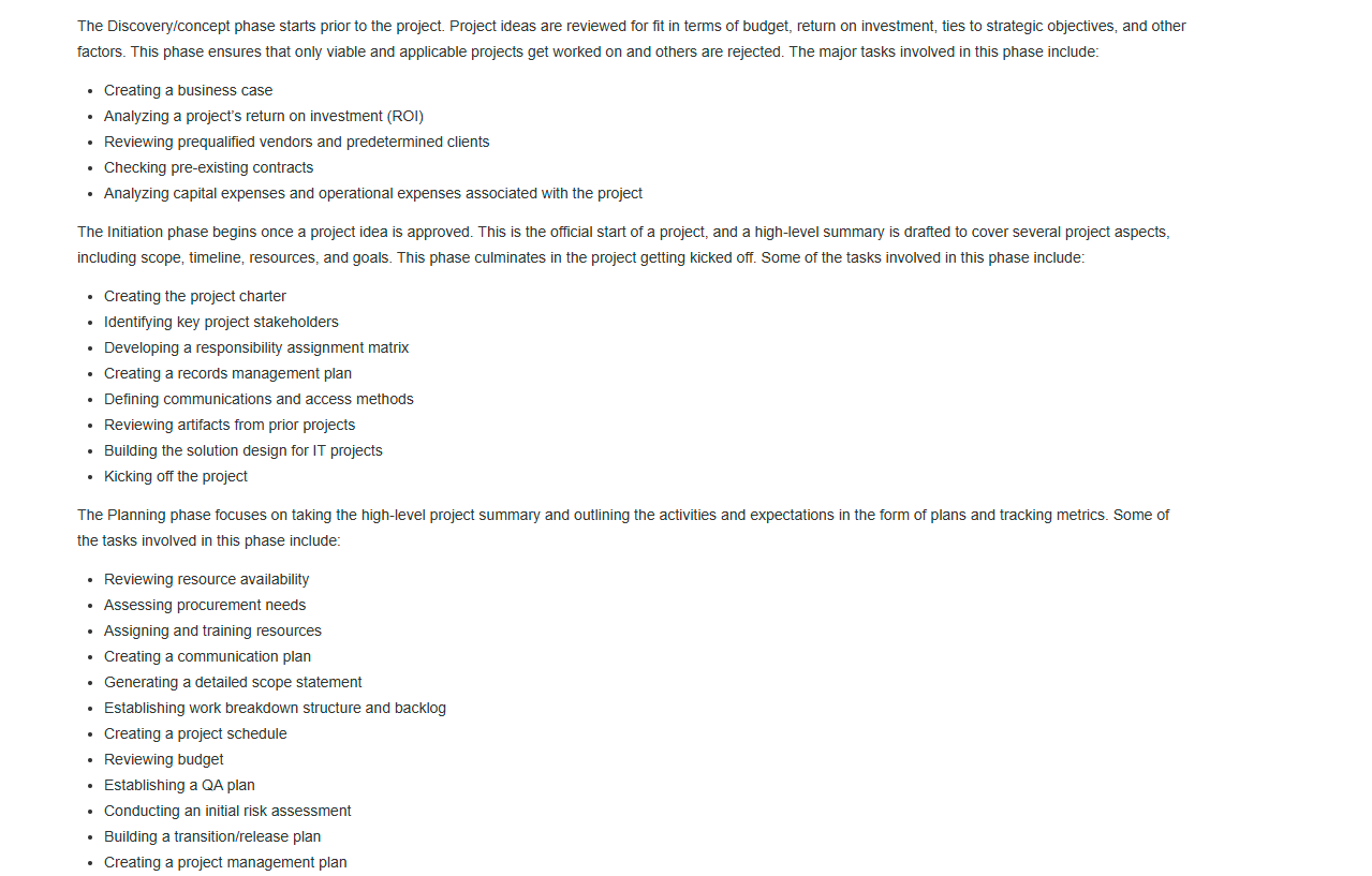 The Discovery/concept phase starts prior to the project. Project ideas are reviewed for fit in terms of budget, return on investment, ties to strategic objectives, and other factors. This phase ensures that only viable and applicable projects get worked on and others are rejected. The major tasks involved in this phase include: Creating a business case Analyzing a project's return on investment (ROI) Reviewing prequalified vendors and predetermined clients Checking pre-existing contracts Analyzing capital expenses and operational expenses associated with the project The Initiation phase begins once a project idea is approved This is the official start of a project, and a high-level summary is drafted to cover several project aspects, including scope, timeline, resources, and goals. This phase culminates in the project getting kicked off. Some of the tasks involved in this phase include: Creating the project charter Identifying key project stakeholders Developing a responsibility assignment matrix Creating a records management plan Defining communications and access methods Reviewing artifacts from prior projects Building the solution design for IT projects Kicking off the project The Planning phase focuses on taking the high-level project summary and outlining the activities and expectations in the form of plans and tracking Some of the tasks involved in this phase include: Reviewing resource availability Assessing procurement needs Assigning and training resources Creating a communication plan Generating a detailed scope statement Establishing work breakdown structure and backlog Creating a project schedule Reviewing budget Establishing a QA plan Conducting an initial risk assessment Building a transition/release plan Creating a project management plan
