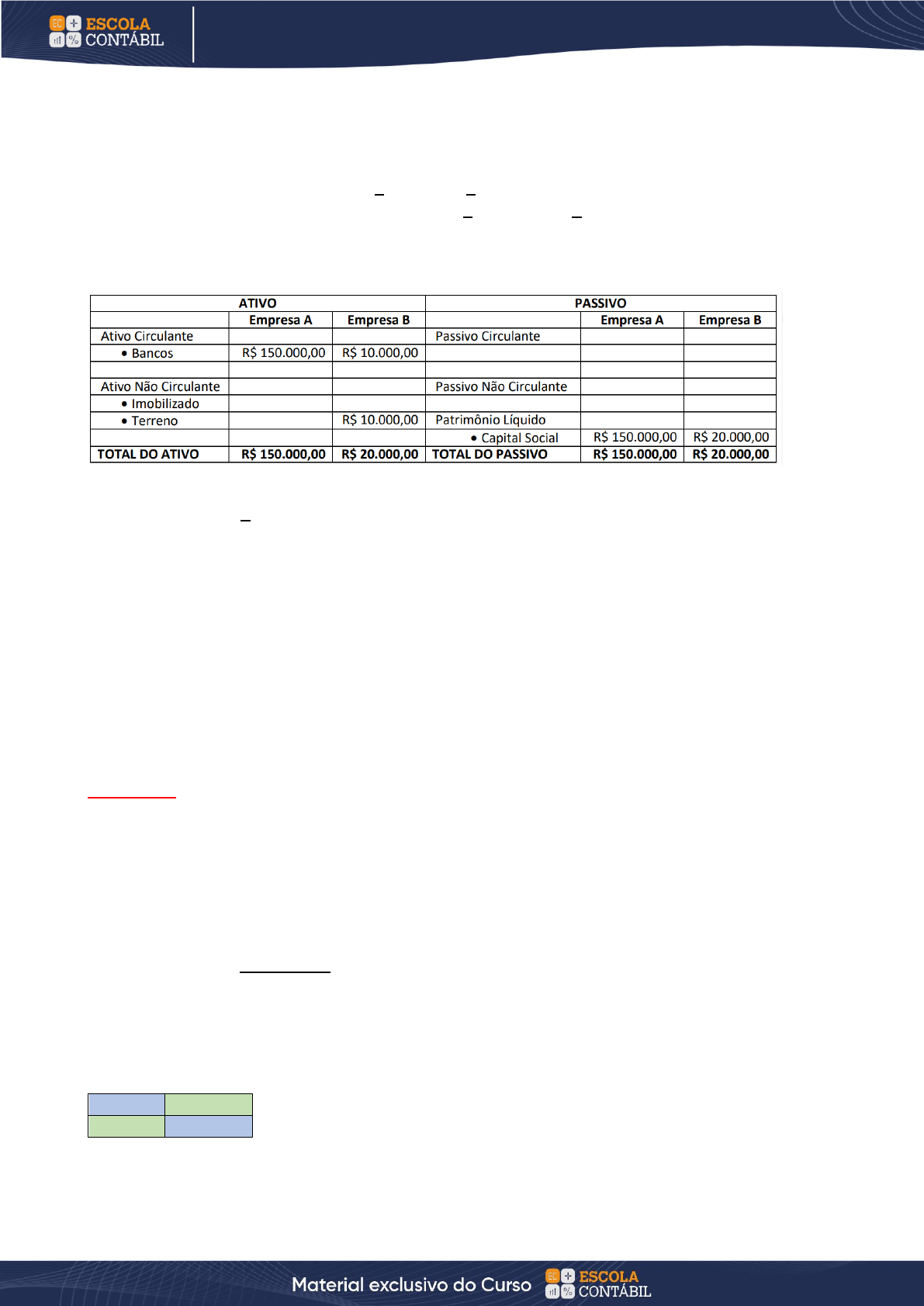 85 CADERNO 300 QUESTÕES COMENTADAS COMENTADAS CADERNO 300 QUESTÕES COMENTADAS COMENTADAS CADERNO 300 QUESTÕES EXAME DE SUFICIÊNCIA 63. (Consulplan/Exame CFC/2022.2) Duas sociedades empresárias – empresa A e empresa B – realizaram uma operação conjunta no ano de X2. Essa operação se referiu à compra de 80% da empresa B pela empresa A, no valor de R$ 50.000,00. O Balanço Patrimonial das duas empresas, no ano de X1, encontra-se disponibilizado a seguir: Na data da compra, o valor de mercado do terreno era R$ 20.000,00. Há, também, o valor de mercado da marca da empresa B, que era de R$ 8.000,00. Nesse sentido, considerando exclusivamente tais informações, qual o valor do ágio por expectativa de rentabilidade futura na combinação de negócio (também chamado de goodwill) total contabilizado no Balanço Patrimonial consolidado ao final de X2? (Considerar que o valor justo da parcela dos não controladores é igual ao do valor pago pelo novo controlador.) A) R$ 12.500,00 B) R$ 24.500,00 C) R$ 38.000,00 D) R$ 50.000,00 Comentário: CIA: B ATIVO VALOR JUSTO = R$ 10.000,00 + 20.000,00 + R$ 8.000,00 ATIVO VALOR JUSTO = R$ 38.000,00 MAS, TEMOS QUE APLICAR 80% SOBRE PARTICIPAÇÃO R$ 38.000,00 x 80% = R$ 30.400,00 GOODWILL = V.P – VJ GOODWILL = R$ 50.000,00 – R$ 30.400,00 GOODWILL = R$ 19.600,00 19.600 80% x 100%