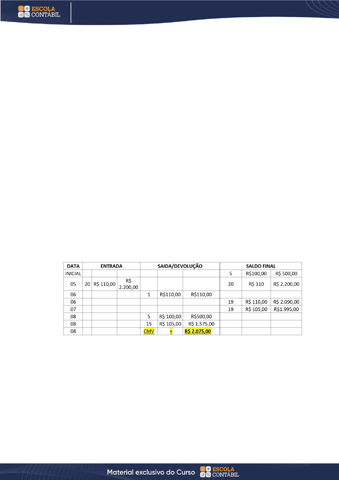123 CADERNO 300 QUESTÕES COMENTADAS COMENTADAS CADERNO 300 QUESTÕES COMENTADAS COMENTADAS CADERNO 300 QUESTÕES EXAME DE SUFICIÊNCIA 2 – O valor do Custo da Mercadoria que foi vendida no dia 08.01. Neste caso, consideraríamos a devolução das unidades vendidas. As mercadorias foram vendidas no dia 08, mas o CMV foi afetado pelos fatos subsequentes. Desta feita, um candidato mais atento à língua portuguesa poderia simplesmente errar a questão pela ambiguidade do enunciado. Na sequência iremos desconsiderar esses aspectos e seguir com a resolução da questão de acordo com o entendimento da banca: A questão nos pede o valor do CMV em 08/01, ou seja, já podemos iniciar desconsiderando os acontecimentos dos dias 09/01 e 10/01. Sendo assim, teremos as seguintes informações a considerar: O nosso estoque inicial é de 5 unidades a custo de R$ 100,00 (cada) = R$ 500.00 05/01 – Realizamos uma compra de 20 unidades (R$ 110,00 cada) = R$ 2.200,00 06/01 – Devolução de 1 das unidades R$ 2.200,00 – R$ 110,00 = R$ 2.090 07/01 – Abatimento de R$ 5,00 em cada umas das 19 unidades restantes R$ 2.090,00 – 95 (19 x R$ 5,00) = R$ 1.995,00 08/01 – Venda de 20 unidades (pelo PEPS deve sair primeiro as que já estavam no estoque inicial) 5 unidades a R$ 100,00 = R$ 500,00 15 unidades a R$ 105,00 (valor ajustado por unidade com o abatimento do dia 07/01) = R$ 1.575,00 Logo temos: R$ 500,00 + R$ 1.575,00 = R$ 2.075,00 ESTOQUE INICIAL: 5 X 100 = R$ 500,00 Esses são os cálculos de acordo com o entendimento da banca na questão. Gabarito: B. Controle, Registro Contábil, Apuração e Alocação de Custos 92. (Consulplan/Exame CFC/2019.2) A empresa Fabrica por Processos PM S/A, em 01/01/2019, apresentou as seguintes informações contábeis em suas contas de estoque: Valor (em R$)
