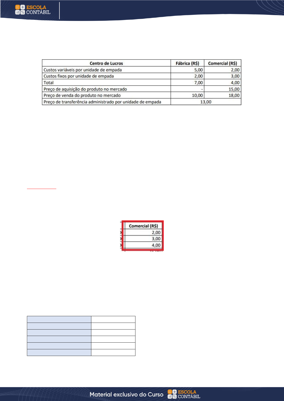 131 CADERNO 300 QUESTÕES COMENTADAS COMENTADAS CADERNO 300 QUESTÕES COMENTADAS COMENTADAS CADERNO 300 QUESTÕES EXAME DE SUFICIÊNCIA sociedade empresária apresentou as seguintes informações sobre a fabricação e comercialização de seus produtos: Considerando somente as informações apresentadas e utilizando a metodologia do preço de transferência baseado no preço corrente de mercado, assinale a alternativa que apresenta o lucro operacional do centro de lucro comercial quando a empresa comercializa 100 empadas. A) R$ 300,00 B) R$ 400,00 C) R$ 600,00 D) R$ 700,00 Comentários: Essa é outra questão que provavelmente será anulada, pois na parte comercial, a banca deu que 2 + 3 = 4 (lembre-se de que escrevemos essa correção ainda sem o gabarito definitivo). Aqui: Isso está errado. Mas vamos à solução, que também acredito estar errada. São dois centros de lucros. Então, a fábrica transfere para o setor comercial. A transferência é feita pelo preço corrente de mercado, e não pelo valor de custo. A questão pergunta o lucro para 100 empadas. 100 empadas, na fábrica, são vendidas por R$ 10 x 100 = R$ 1.000,00, que é o preço de venda do produto no mercado. Agora, o centro comercial possui os seguintes custos: Custo da Fábrica R$ 1.000,00 Custo Variável (2 x 100) R$ 200,00 Custo Fixo (3 x 100) R$ 300,00 Total dos custos R$ 1.500,00 Venda (18 x 100) R$ 1.800,00 Lucro R$ 300,00