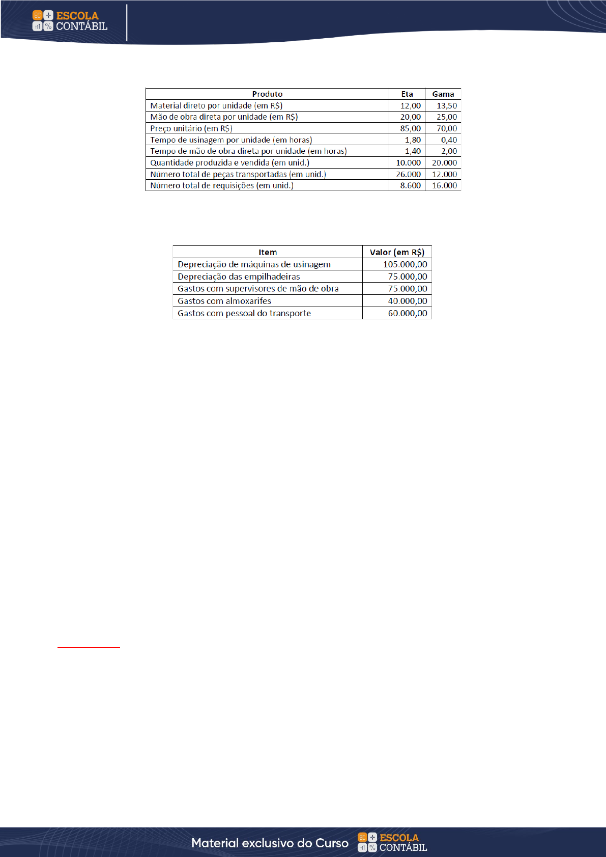 140 CADERNO 300 QUESTÕES COMENTADAS COMENTADAS CADERNO 300 QUESTÕES COMENTADAS COMENTADAS CADERNO 300 QUESTÕES EXAME DE SUFICIÊNCIA Sabe-se que a empresa incorreu nos seguintes custos indiretos em X1: Recentemente, a empresa Etagama implementou um projeto piloto do Custeio Baseado em Atividades (ABC) em sua fábrica. Ao analisar o seu processo produtivo, a empresa identificou quatro atividades, quais sejam: - Transportar materiais: realizada por meio de empilhadeiras pelo pessoal do transporte (direcionador de custos da atividade – número de peças transportadas por produto). - Usinar materiais: realizada por meio das máquinas de usinagem (direcionador de custos da atividade – número de horas de usinagem por produto). - Fornecer insumos: realizada pelos almoxarifes (direcionador de custos da atividade – número de requisições por produto). - Supervisionar produção: realizada pelos funcionários que supervisionam a mão de obra (direcionador de custos da atividade – número de horas de mão de obra direta por produto). Com base apenas nessas informações, é INCORRETO afirmar que, em X1: A) Pelo custeio ABC, o custo total do produto Eta seria superior a R$ 500.000,00. B) Pelo custeio ABC, o custo total do produto Gama seria superior a R$ 900.000,00. C) Pelo custeio ABC, o valor dos custos indiretos alocados ao produto Eta seria superior a R$ 200.000,00. D) Pelo custeio ABC, o valor dos custos indiretos alocados ao produto Gama seria superior a R$ 150.000,00. Comentários: Talvez a questão mais difícil da prova 2019.2. Vamos resolver? Sabemos que um produto é formado por custos diretos, que podem ser diretamente atribuídos aos produtos, e custos indiretos, que precisam de um critério de rateio. Correto? Então, resolver nossa questão começa por aí! Temos dois produtos: Eta e Gama.