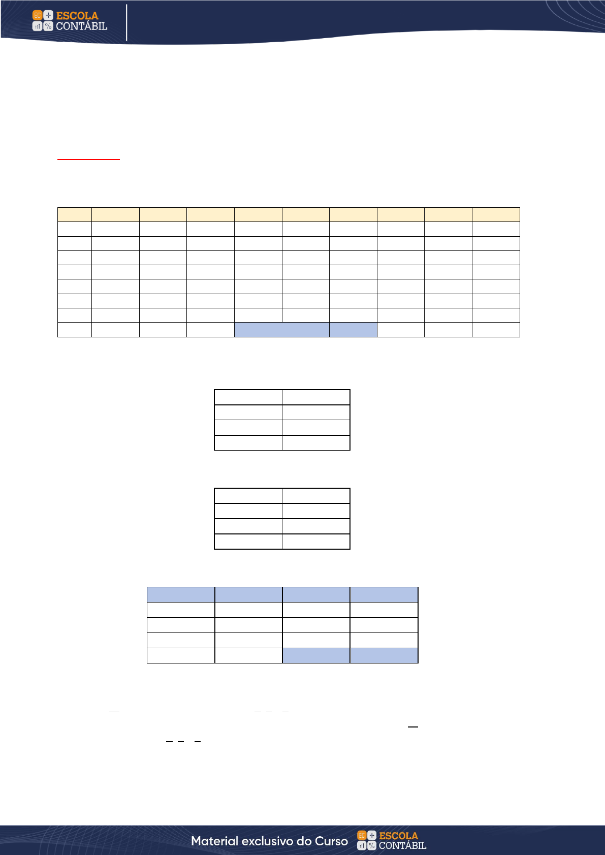 146 CADERNO 300 QUESTÕES COMENTADAS COMENTADAS CADERNO 300 QUESTÕES COMENTADAS COMENTADAS CADERNO 300 QUESTÕES EXAME DE SUFICIÊNCIA B) R$ 6.650,00 C) R$ 6.943,75 D) R$ 8.150,00 Comentários: Aqui, temos de simplesmente montar a tabela de controle de estoques. Data Quant Valor Unit Saldo Quant Valor Unit Saldo Quant Valor Unit Saldo 8 1.000 R$ 2,00 R$ 2.000,00 1.000 R$ 2,00 R$ 2.000,00 10 500 R$ 2,30 R$ 1.150,00 1.500 R$ 2,10 R$ 3.150,00 11 R$ - 1.000 R$ 2,10 R$ 2.100,00 500 R$ 2,10 R$ 1.050,00 16 1.250 R$ 2,80 R$ 3.500,00 1.750 R$ 2,60 R$ 4.550,00 17 R$ - 500 R$ 2,60 R$ 1.300,00 1.250 R$ 2,60 R$ 3.250,00 24 R$ - 1.250 R$ 2,60 R$ 3.250,00 25 500 R$ 3,00 R$ 1.500,00 500 R$ 3,00 R$ 1.500,00 R$ - CMV R$ 6.650,00 Existe, contudo, uma forma mais rápida de resolver essa questão. Basta ver quantas mercadorias saíram ao todo: 11 1.000 17 500 24 1.250 Total 2.750 Se pegarmos as entradas dos dias 8 a 16, veremos que dá exatamente a mesma quantia: 8 1000,00 10 500,00 16 1250,00 Total 2750,00 Assim, todas as mercadorias adquiridas foram vendidas. E, para calcular o CMV, basta fazer: Dia Quantidade Valor Aquis. Total 8 1000,00 R$ 2,00 2.000 10 500,00 R$ 2,30 1.150 16 1250,00 R$ 2,80 3.500 Total 2750,00 CMV 6.650 GABARITO: B. 108. (Consulplan/Exame CFC/2022.2) A Indústria W produz somente os produtos A, B e C e trabalhou com sua capacidade normal de produção. As informações seguintes foram coletadas na gerência de custos da Indústria W e se referem aos dados de produção dos produtos A, B e C no mês de abril/2022.