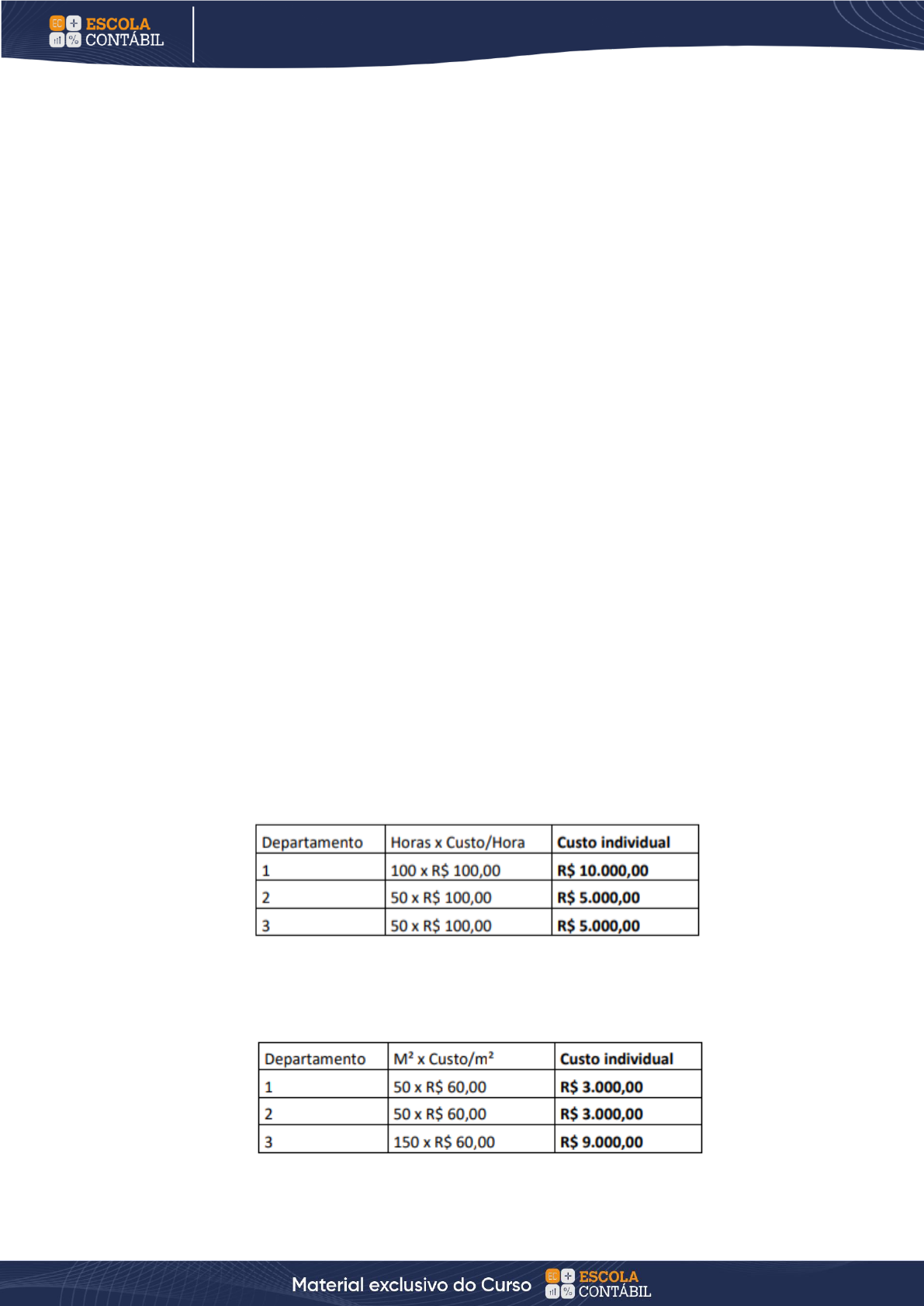 148 CADERNO 300 QUESTÕES COMENTADAS COMENTADAS CADERNO 300 QUESTÕES COMENTADAS COMENTADAS CADERNO 300 QUESTÕES EXAME DE SUFICIÊNCIA unidades de cada produto produzidos neste mês. Mas, em provas, os candidatos devem trabalhar pela convicção do enunciado e não por inferências. No entanto, para a resolução da questão didaticamente vamos desconsiderar estes aspectos e considerar que nos foram passadas todas as informações corretamente. Questão de Contabilidade de Custos, na qual cabe um recurso. Pode ser resolvida com raciocínio lógico. O enunciado cita três Produtos (A, B e C) e três Departamentos (1, 2 e 3), e dá os custos com mão de obra e matéria-prima para os produtos. Além disso, o enunciado também dá os custos combinados dos 3 departamentos com Manutenção, Aluguel e Energia, além da participação de cada departamento nesses custos. Todos os produtos passam por todos os departamentos. O enunciado também nos diz o percentual de custos de cada produto dentro de cada departamento. Com isso, conseguimos chegar ao custo de cada produto dentro de cada departamento, e discriminar o custo total de cada produto no mês. O exercício pode ser resolvido considerando 1.000 unidades de cada produto produzidos neste mês, e, portanto, a aceitação de um recurso pela banca é improvável. Vamos à resolução: Primeiro vamos encontrar os gastos totais de cada departamento (passo 1), depois encontrar quanto cada produto gastou em cada departamento (passo 2), para, por fim, somar esse custo ao custo de mão de obra e o de matéria-prima (passo 3). Assim, chegaremos à resposta pedida pelo enunciado: o custo de produção de cada produto no mês em referência. Vamos lá: Encontrar os gastos totais de cada departamento Gastos por Departamento com Manutenção – O custo total de manutenção foi de R$ 20.000,00. O Departamento 1 (D1) gastou 100 horas, enquanto os Departamentos 2 (D2) e 3 (D3) gastaram 50 horas cada. O total de horas de manutenção gasto foi de 200 horas, a um custo de R$ 100,00/hora. Temos então os seguintes gastos de cada Departamento com a Manutenção: Gasto por Departamento com Aluguel – Fazendo o mesmo processo de 1.a, temos: custo total de aluguel igual a R$ 15.000,00; D1 ocupando 50 m², D2 ocupando 50 m² e D3 ocupando 150 m²; totalizando um espaço de 250 m² a um preço de R$ 60,00/m². Fazendo os cálculos na tabela: