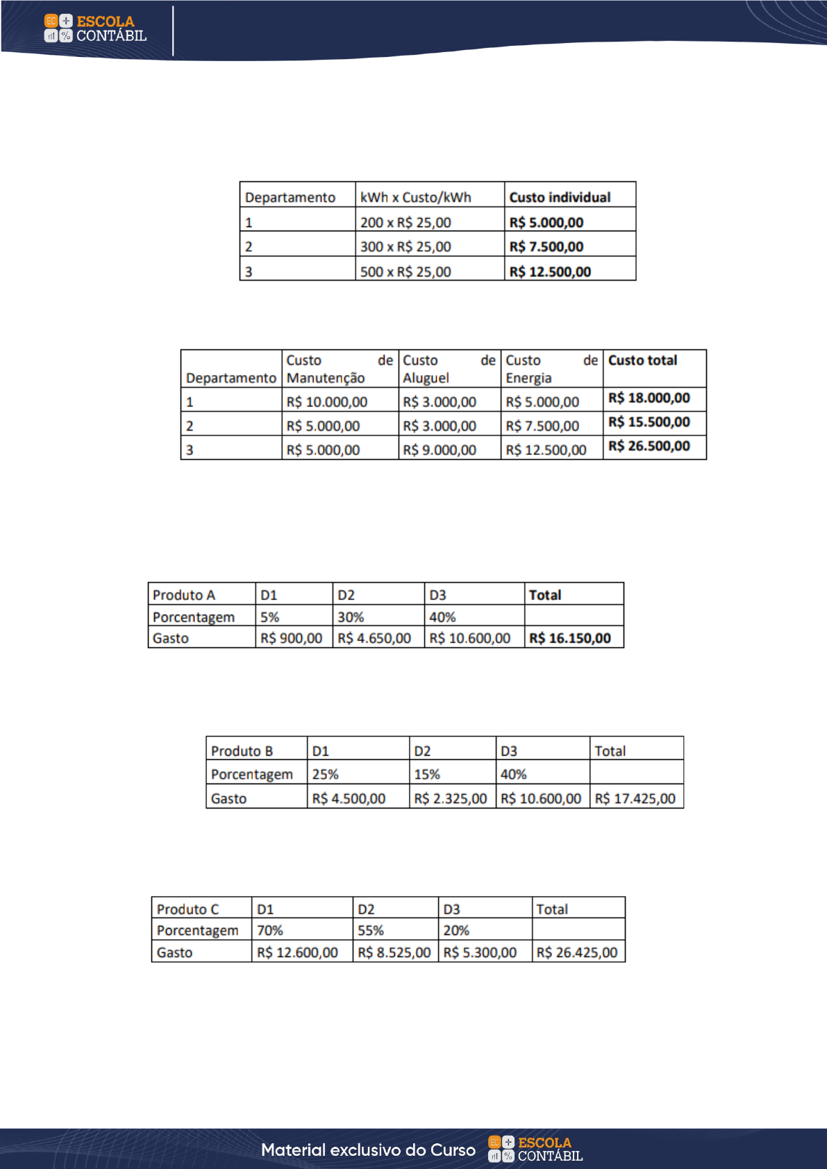 149 CADERNO 300 QUESTÕES COMENTADAS COMENTADAS CADERNO 300 QUESTÕES COMENTADAS COMENTADAS CADERNO 300 QUESTÕES EXAME DE SUFICIÊNCIA Gasto por Departamento com Energia Elétrica – Fazendo novamente o mesmo processo de 1.a, temos: custo total de Energia de R$ 25.000,00; D1 gastando 200 kWh, D2 gastando 300 kWh e D3 gastando 500 kWh; totalizando então 1.000 kWh gastos, a R$ 25,00/kWh. Colocando na tabela temos: Agora que temos o gasto de cada departamento nos Custos Indiretos, podemos calcular o total gasto por departamento, concluindo assim a etapa 1: Encontrar quanto cada produto gastou em cada departamento Produto A – Sabemos que o Produto A (PA) foi responsável por 5% dos gastos do D1, 30% dos gastos do D2 e 40% dos gastos do D3. Multiplicando essas porcentagens pelos custos totais de cada Departamento, chegamos a: Produto B – Sabemos que o Produto B (PB) foi responsável por 25% dos gastos de D1, 15% dos gastos de D2 e 40% dos gastos de D3. Multiplicando essas porcentagens pelos custos totais de cada Departamento, chegamos a: Produto C – Sabemos que o Produto C (PC) foi responsável por 70% dos gastos de D1, 55% dos gastos de D2 e 20% dos gastos de D3. Multiplicando essas porcentagens pelos custos totais de cada Departamento, chegamos a: Com isso, obtivemos os custos que cada Produto teve nos Departamentos, e podemos prosseguir para o passo 3: encontrar o custo total de cada produto no mês em questão. Encontrar o custo total de cada produto no mês
