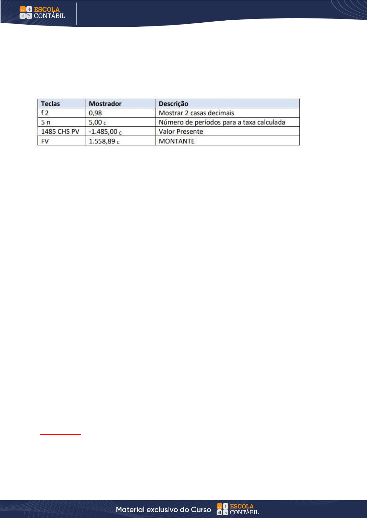 232 CADERNO 300 QUESTÕES EXAME DE SUFICIÊNCIA Aplicação = 1500 - (1% x 1500) = 1500 - 15 = 1485 PV = 1485 n = 5 meses Continuando após o cálculo da taxa: Com a fórmula: M = C ( 1 + i )n M = 1.485 ( 1 + 0,009758794 )5 M = 1.485 ( 1,009758794 )5 M = 1.485 x 1,049755650 M = 1.558,89 GABARITO: A. 182. (Consulplan/Exame CFC/2021.2) Um empresário deseja fazer uma aplicação financeira no valor de R$50.000,00. Considerando os sistemas de juros simples e compostos, o tempo de aplicação e a taxa de juros correspondente, é INCORRETO afirmar que: a) Para obter um montante de R$82.500,00 sob um regime de juros simples após dez semestres, a taxa de juros anual é de 13%. b) Sob o regime de juros compostos com uma taxa de 10% ao ano, o tempo para receber um rendimento de R$23.205,00 é quatro anos. c) Se a aplicação for feita sob um regime de juros compostos com uma taxa de 9% ao ano, por um período de dois anos, o empresário obterá um rendimento que representa 14,5% do capital original. d) Se a aplicação for feita sob um regime de juros simples com uma taxa de 13,2% ao ano, por um período de cinco semestres, o empresário obterá um montante de 33% maior que o capital original. Comentários: A questão pede a alternativa INCORRETA. Vamos testar cada uma das alternativas para encontrar a resposta. a) Para obter um montante de R$82.500,00 sob um regime de juros simples após dez semestres, a taxa de juros anual é de 13%.