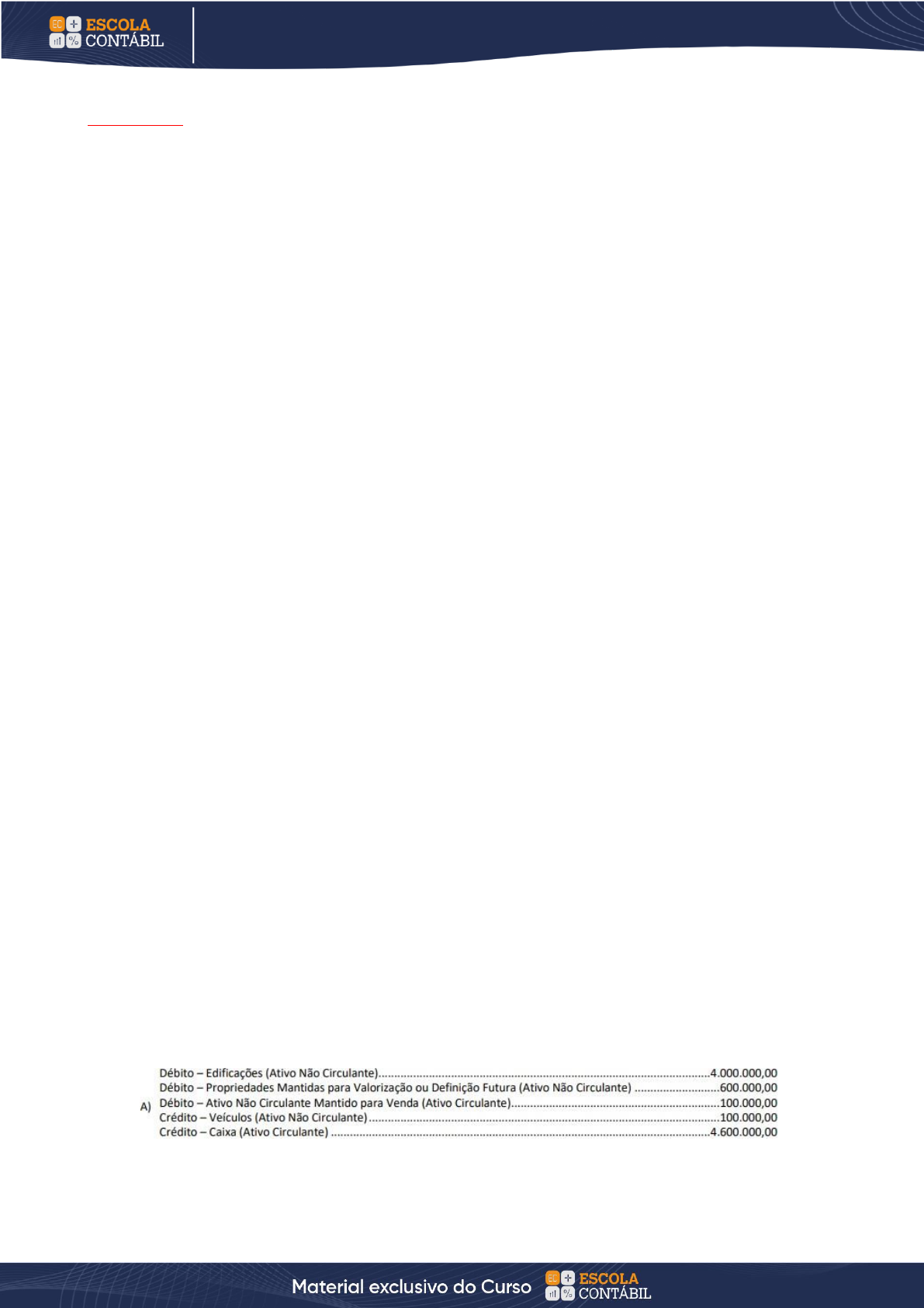 339 CADERNO 300 QUESTÕES COMENTADAS COMENTADAS CADERNO 300 QUESTÕES COMENTADAS COMENTADAS CADERNO 300 QUESTÕES EXAME DE SUFICIÊNCIA Comentários: Questão que, com um pouco de bom senso, conseguimos resolver. Vamos ver? Adquiriu uma edificação (imóvel pago à vista, em dinheiro) para instalação de salas a serem utilizadas em seu novo escritório administrativo. O valor pago por esta aquisição foi R$ 4.000.000,00 e a companhia ainda não havia estimado quando faria a mudança de suas instalações administrativas para este novo escritório. Neste caso, trata-se de edificação, adquirida por R$ 4.000.000,00, a ser lançada no imobilizado, já que será utilizada pelo escritório administrativo. D – Edificações (ANC) 4.000.000 C – Caixa (AC) 4.000.000 Como é um prédio, é lançado como edificação. Adquiriu um terreno (pago à vista, em dinheiro) por R$ 600.000,00, mas a administração da companhia ainda não havia determinado o uso futuro deste terreno – por exemplo, se usaria o terreno como propriedade ocupada pelo proprietário ou para a venda. Aqui, foi adquirido um terreno, não se sabendo ainda será utilizado nas atividades da cia ou não, a classificação é como propriedade para investimento, não ativo não circulante. Segundo o CPC 28: 8. O que se segue são exemplos de propriedades para investimento: (b) terrenos mantidos para futuro uso correntemente indeterminado (se a entidade não tiver determinado que usará o terreno como propriedade ocupada pelo proprietário ou para venda a curto prazo no curso ordinário do negócio, o terreno é considerado como mantido para valorização do capital); D – Propriedade mantida para valorização ou definição futura 600.000 C – Caixa 600.000 Colocou à venda veículos antigos que eram utilizados em suas atividades operacionais de atendimento a clientes. Estes veículos estavam disponíveis para a venda imediata em suas condições atuais e a companhia considerava altamente provável a venda ainda no ano 2021, pois havia iniciado um programa firme para localizar comprador e concluir o plano de venda. Estes veículos estavam registrados ao valor contábil de R$ 100.000,00; valor este menor que o valor justo menos as despesas de venda. Nesta situação, o veículo preenche todos os requisitos para ser classificado como ativo não circulante mantido para venda, conforme o CPC 31. Por isso, deve ser transferido para o ativo circulante. D – Ativo não circulante mantido para venda 100.000 C – Veículos 100.000 Portanto, consolidando todos os lançamentos, teremos: GABARITO: A.