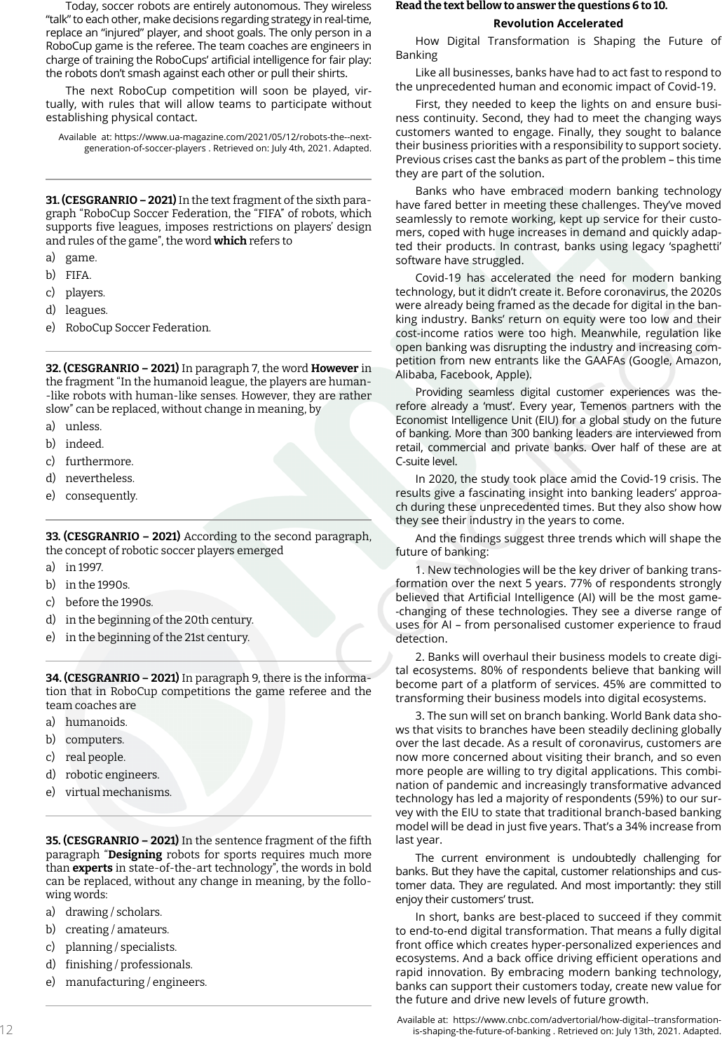 Bru no d a S ilv a R ib eir o - 00 6.3 40 .83 2- 52 12 Today, soccer robots are entirely autonomous. They wireless “talk” to each other, make decisions regarding strategy in real-time, replace an “injured” player, and shoot goals. The only person in a RoboCup game is the referee. The team coaches are engineers in charge of training the RoboCups’ artificial intelligence for fair play: the robots don’t smash against each other or pull their shirts. The next RoboCup competition will soon be played, vir- tually, with rules that will allow teams to participate without establishing physical contact. Available at: https://www.ua-magazine.com/2021/05/12/robots-the--next- generation-of-soccer-players . Retrieved on: July 4th, 2021. Adapted. 31. (CESGRANRIO – 2021) In the text fragment of the sixth para- graph “RoboCup Soccer Federation, the “FIFA” of robots, which supports five leagues, imposes restrictions on players’ design and rules of the game”, the word which refers to a) game. b) FIFA. c) players. d) leagues. e) RoboCup Soccer Federation. 32. (CESGRANRIO – 2021) In paragraph 7, the word However in the fragment “In the humanoid league, the players are human- -like robots with human-like senses. However, they are rather slow” can be replaced, without change in meaning, by a) unless. b) indeed. c) furthermore. d) nevertheless. e) consequently. 33. (CESGRANRIO – 2021) According to the second paragraph, the concept of robotic soccer players emerged a) in 1997. b) in the 1990s. c) before the 1990s. d) in the beginning of the 20th century. e) in the beginning of the 21st century. 34. (CESGRANRIO – 2021) In paragraph 9, there is the informa- tion that in RoboCup competitions the game referee and the team coaches are a) humanoids. b) computers. c) real people. d) robotic engineers. e) virtual mechanisms. 35. (CESGRANRIO – 2021) In the sentence fragment of the fifth paragraph “Designing robots for sports requires much more than experts in state-of-the-art technology”, the words in bold can be replaced, without any change in meaning, by the follo- wing words: a) drawing / scholars. b) creating / amateurs. c) planning / specialists. d) finishing / professionals. e) manufacturing / engineers. Read the text bellow to answer the questions 6 to 10. Revolution Accelerated How Digital Transformation is Shaping the Future of Banking Like all businesses, banks have had to act fast to respond to the unprecedented human and economic impact of Covid-19. First, they needed to keep the lights on and ensure busi- ness continuity. Second, they had to meet the changing ways customers wanted to engage. Finally, they sought to balance their business priorities with a responsibility to support society. Previous crises cast the banks as part of the problem – this time they are part of the solution. Banks who have embraced modern banking technology have fared better in meeting these challenges. They’ve moved seamlessly to remote working, kept up service for their custo- mers, coped with huge increases in demand and quickly adap- ted their products. In contrast, banks using legacy ‘spaghetti’ software have struggled. Covid-19 has accelerated the need for modern banking technology, but it didn’t create it. Before coronavirus, the 2020s were already being framed as the decade for digital in the ban- king industry. Banks’ return on equity were too low and their cost-income ratios were too high. Meanwhile, regulation like open banking was disrupting the industry and increasing com- petition from new entrants like the GAAFAs (Google, Amazon, Alibaba, Facebook, Apple). Providing seamless digital customer experiences was the- refore already a ‘must’. Every year, Temenos partners with the Economist Intelligence Unit (EIU) for a global study on the future of banking. More than 300 banking leaders are interviewed from retail, commercial and private banks. Over half of these are at C-suite level. In 2020, the study took place amid the Covid-19 crisis. The results give a fascinating insight into banking leaders’ approa- ch during these unprecedented times. But they also show how they see their industry in the years to come. And the findings suggest three trends which will shape the future of banking: 1. New technologies will be the key driver of banking trans- formation over the next 5 years. 77% of respondents strongly believed that Artificial Intelligence (AI) will be the most game- -changing of these technologies. They see a diverse range of uses for AI – from personalised customer experience to fraud detection. 2. Banks will overhaul their business models to create digi- tal ecosystems. 80% of respondents believe that banking will become part of a platform of services. 45% are committed to transforming their business models into digital ecosystems. 3. The sun will set on branch banking. World Bank data sho- ws that visits to branches have been steadily declining globally over the last decade. As a result of coronavirus, customers are now more concerned about visiting their branch, and so even more people are willing to try digital applications. This combi- nation of pandemic and increasingly transformative advanced technology has led a majority of respondents (59%) to our sur- vey with the EIU to state that traditional branch-based banking model will be dead in just five years. That’s a 34% increase from last year. The current environment is undoubtedly challenging for banks. But they have the capital, customer relationships and cus- tomer data. They are regulated. And most importantly: they still enjoy their customers’ trust. In short, banks are best-placed to succeed if they commit to end-to-end digital transformation. That means a fully digital front office which creates hyper-personalized experiences and ecosystems. And a back office driving efficient operations and rapid innovation. By embracing modern banking technology, banks can support their customers today, c