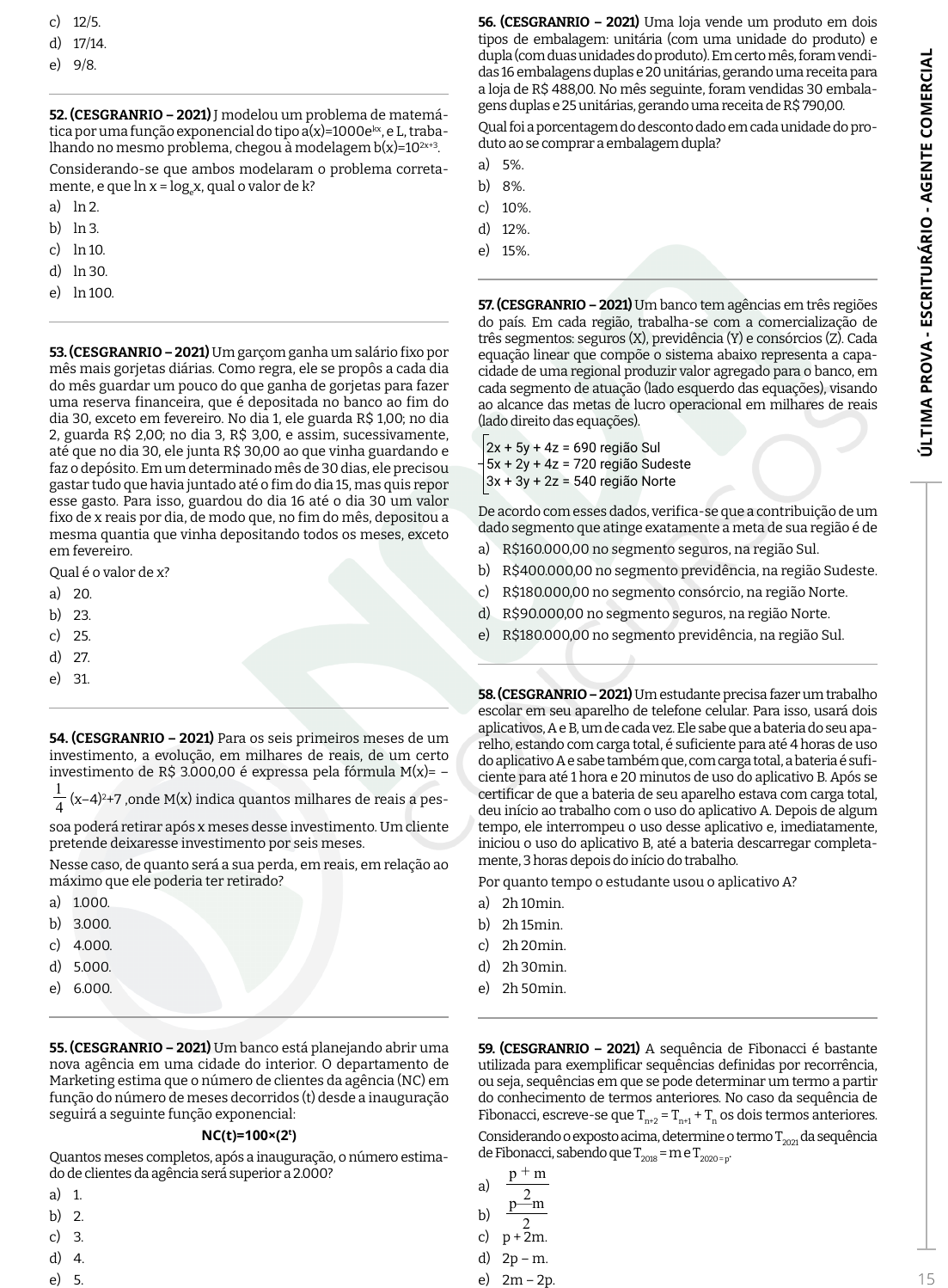 Bru no d a S ilv a R ib eir o - 00 6.3 40 .83 2- 52 Ú LT IM A P RO VA - ES CR IT U RÁ RI O - A G EN TE C O M ER CI A L 15 c) 12/5. d) 17/14. e) 9/8. 52. (CESGRANRIO – 2021) J modelou um problema de matemá- tica por uma função exponencial do tipo a(x)=1000ekx, e L, traba- lhando no mesmo problema, chegou à modelagem b(x)=102x+3. Considerando-se que ambos modelaram o problema correta- mente, e que ln x = logex, qual o valor de k? a) ln 2. b) ln 3. c) ln 10. d) ln 30. e) ln 100. 53. (CESGRANRIO – 2021) Um garçom ganha um salário fixo por mês mais gorjetas diárias. Como regra, ele se propôs a cada dia do mês guardar um pouco do que ganha de gorjetas para fazer uma reserva financeira, que é depositada no banco ao fim do dia 30, exceto em fevereiro. No dia 1, ele guarda R$ 1,00; no dia 2, guarda R$ 2,00; no dia 3, R$ 3,00, e assim, sucessivamente, até que no dia 30, ele junta R$ 30,00 ao que vinha guardando e faz o depósito. Em um determinado mês de 30 dias, ele precisou gastar tudo que havia juntado até o fim do dia 15, mas quis repor esse gasto. Para isso, guardou do dia 16 até o dia 30 um valor fixo de x reais por dia, de modo que, no fim do mês, depositou a mesma quantia que vinha depositando todos os meses, exceto em fevereiro. Qual é o valor de x? a) 20. b) 23. c) 25. d) 27. e) 31. 54. (CESGRANRIO – 2021) Para os seis primeiros meses de um investimento, a evolução, em milhares de reais, de um certo investimento de R$ 3.000,00 é expressa pela fórmula M(x)= – 4 1 (x–4)2+7 ,onde M(x) indica quantos milhares de reais a pes- soa poderá retirar após x meses desse investimento. Um cliente pretende deixaresse investimento por seis meses. Nesse caso, de quanto será a sua perda, em reais, em relação ao máximo que ele poderia ter retirado? a) 1.000. b) 3.000. c) 4.000. d) 5.000. e) 6.000. 55. (CESGRANRIO – 2021) Um banco está planejando abrir uma nova agência em uma cidade do interior. O departamento de Marketing estima que o número de clientes da agência (NC) em função do número de meses decorridos (t) desde a inauguração seguirá a seguinte função exponencial: NC(t)=100×(2t) Quantos meses completos, após a inauguração, o número estima- do de clientes da agência será superior a 2.000? a) 1. b) 2. c) 3. d) 4. e) 5. 56. (CESGRANRIO – 2021) Uma loja vende um produto em dois tipos de embalagem: unitária (com uma unidade do produto) e dupla (com duas unidades do produto). Em certo mês, foram vendi- das 16 embalagens duplas e 20 unitárias, gerando uma receita para a loja de R$ 488,00. No mês seguinte, foram vendidas 30 embala- gens duplas e 25 unitárias, gerando uma receita de R$ 790,00. Qual foi a porcentagem do desconto dado em cada unidade do pro- duto ao se comprar a embalagem dupla? a) 5%. b) 8%. c) 10%. d) 12%. e) 15%. 57. (CESGRANRIO – 2021) Um banco tem agências em três regiões do país. Em cada região, trabalha-se com a comercialização de três segmentos: seguros (X), previdência (Y) e consórcios (Z). Cada equação linear que compõe o sistema abaixo representa a capa- cidade de uma regional produzir valor agregado para o banco, em cada segmento de atuação (lado esquerdo das equações), visando ao alcance das metas de lucro operacional em milhares de reais (lado direito das equações). 2x + 5y + 4z = 690 região Sul 5x + 2y + 4z = 720 região Sudeste 3x + 3y + 2z = 540 região Norte De acordo com esses dados, verifica-se que a contribuição de um dado segmento que atinge exatamente a meta de sua região é de a) R$160.000,00 no segmento seguros, na região Sul. b) R$400.000,00 no segmento previdência, na região Sudeste. c) R$180.000,00 no segmento consórcio, na região Norte. d) R$90.000,00 no segmento seguros, na região Norte. e) R$180.000,00 no segmento previdência, na região Sul. 58. (CESGRANRIO – 2021) Um estudante precisa fazer um trabalho escolar em seu aparelho de telefone celular. Para isso, usará dois aplicativos, A e B, um de cada vez. Ele sabe que a bateria do seu apa- relho, estando com carga total, é suficiente para até 4 horas de uso do aplicativo A e sabe também que, com carga total, a bateria é sufi- ciente para até 1 hora e 20 minutos de uso do aplicativo B. Após se certificar de que a bateria de seu aparelho estava com carga total, deu início ao trabalho com o uso do aplicativo A. Depois de algum tempo, ele interrompeu o uso desse aplicativo e, imediatamente, iniciou o uso do aplicativo B, até a bateria descarregar completa- mente, 3 horas depois do início do trabalho. Por quanto tempo o estudante usou o aplicativo A? a) 2h 10min. b) 2h 15min. c) 2h 20min. d) 2h 30min. e) 2h 50min. 59. (CESGRANRIO – 2021) A sequência de Fibonacci é bastante utilizada para exemplificar sequências definidas por recorrência, ou seja, sequências em que se pode determinar um termo a partir do conhecimento de termos anteriores. No caso da sequência de Fibonacci, escreve-se que Tn+2 = Tn+1 + Tn os dois termos anteriores. Considerando o exposto acima, determine o termo T2021 da sequência de Fibonacci, sabendo que T2018 = m e T2020 = p. a) 2 p m+ b) 2 p—m c) p + 2m. d) 2p – m. e) 2m – 2p. O conteúdo deste livro eletrônico é licenciado para Bruno da Silva Ribeiro - 006.340.832-52, vedada, por quaisquer meios e a qualquer título, a sua reprodução, cópia, divulgação ou distribuição, sujeitando-se aos infratores à responsabilização civil e criminal.