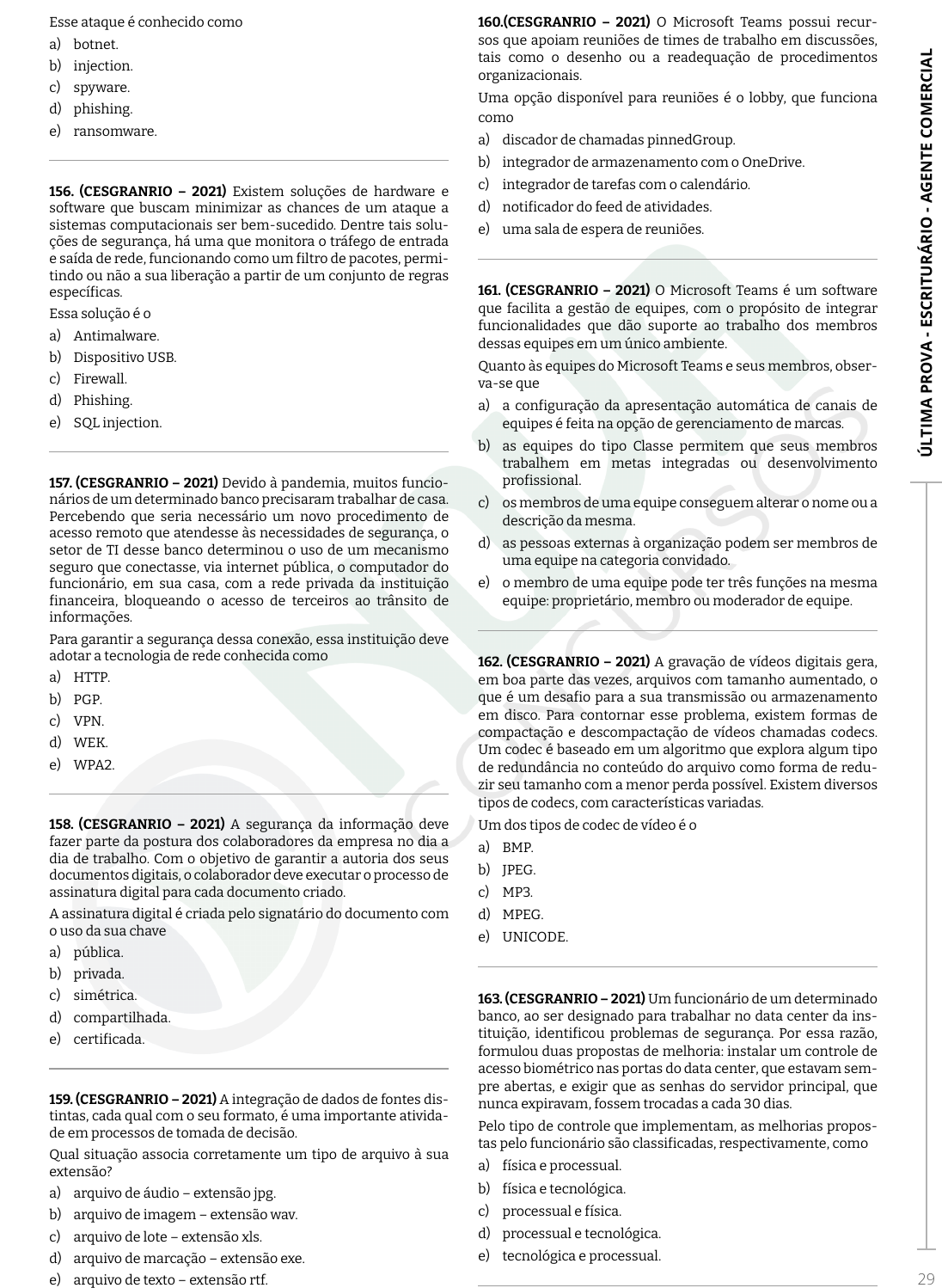 Bru no d a S ilv a R ib eir o - 00 6.3 40 .83 2- 52 Ú LT IM A P RO VA - ES CR IT U RÁ RI O - A G EN TE C O M ER CI A L 29 Esse ataque é conhecido como a) botnet. b) injection. c) spyware. d) phishing. e) ransomware. 156. (CESGRANRIO – 2021) Existem soluções de hardware e software que buscam minimizar as chances de um ataque a sistemas computacionais ser bem-sucedido. Dentre tais solu- ções de segurança, há uma que monitora o tráfego de entrada e saída de rede, funcionando como um filtro de pacotes, permi- tindo ou não a sua liberação a partir de um conjunto de regras específicas. Essa solução é o a) Antimalware. b) Dispositivo USB. c) Firewall. d) Phishing. e) SQL injection. 157. (CESGRANRIO – 2021) Devido à pandemia, muitos funcio- nários de um determinado banco precisaram trabalhar de casa. Percebendo que seria necessário um novo procedimento de acesso remoto que atendesse às necessidades de segurança, o setor de TI desse banco determinou o uso de um mecanismo seguro que conectasse, via internet pública, o computador do funcionário, em sua casa, com a rede privada da instituição financeira, bloqueando o acesso de terceiros ao trânsito de informações. Para garantir a segurança dessa conexão, essa instituição deve adotar a tecnologia de rede conhecida como a) HTTP. b) PGP. c) VPN. d) WEK. e) WPA2. 158. (CESGRANRIO – 2021) A segurança da informação deve fazer parte da postura dos colaboradores da empresa no dia a dia de trabalho. Com o objetivo de garantir a autoria dos seus documentos digitais, o colaborador deve executar o processo de assinatura digital para cada documento criado. A assinatura digital é criada pelo signatário do documento com o uso da sua chave a) pública. b) privada. c) simétrica. d) compartilhada. e) certificada. 159. (CESGRANRIO – 2021) A integração de dados de fontes dis- tintas, cada qual com o seu formato, é uma importante ativida- de em processos de tomada de decisão. Qual situação associa corretamente um tipo de arquivo à sua extensão? a) arquivo de áudio – extensão jpg. b) arquivo de imagem – extensão wav. c) arquivo de lote – extensão xls. d) arquivo de marcação – extensão exe. e) arquivo de texto – extensão rtf. 160.(CESGRANRIO – 2021) O Microsoft Teams possui recur- sos que apoiam reuniões de times de trabalho em discussões, tais como o desenho ou a readequação de procedimentos organizacionais. Uma opção disponível para reuniões é o lobby, que funciona como a) discador de chamadas pinnedGroup. b) integrador de armazenamento com o OneDrive. c) integrador de tarefas com o calendário. d) notificador do feed de atividades. e) uma sala de espera de reuniões. 161. (CESGRANRIO – 2021) O Microsoft Teams é um software que facilita a gestão de equipes, com o propósito de integrar funcionalidades que dão suporte ao trabalho dos membros dessas equipes em um único ambiente. Quanto às equipes do Microsoft Teams e seus membros, obser- va-se que a) a configuração da apresentação automática de canais de equipes é feita na opção de gerenciamento de marcas. b) as equipes do tipo Classe permitem que seus membros trabalhem em metas integradas ou desenvolvimento profissional. c) os membros de uma equipe conseguem alterar o nome ou a descrição da mesma. d) as pessoas externas à organização podem ser membros de uma equipe na categoria convidado. e) o membro de uma equipe pode ter três funções na mesma equipe: proprietário, membro ou moderador de equipe. 162. (CESGRANRIO – 2021) A gravação de vídeos digitais gera, em boa parte das vezes, arquivos com tamanho aumentado, o que é um desafio para a sua transmissão ou armazenamento em disco. Para contornar esse problema, existem formas de compactação e descompactação de vídeos chamadas codecs. Um codec é baseado em um algoritmo que explora algum tipo de redundância no conteúdo do arquivo como forma de redu- zir seu tamanho com a menor perda possível. Existem diversos tipos de codecs, com características variadas. Um dos tipos de codec de vídeo é o a) BMP. b) JPEG. c) MP3. d) MPEG. e) UNICODE. 163. (CESGRANRIO – 2021) Um funcionário de um determinado banco, ao ser designado para trabalhar no data center da ins- tituição, identificou problemas de segurança. Por essa razão, formulou duas propostas de melhoria: instalar um controle de acesso biométrico nas portas do data center, que estavam sem- pre abertas, e exigir que as senhas do servidor principal, que nunca expiravam, fossem trocadas a cada 30 dias. Pelo tipo de controle que implementam, as melhorias propos- tas pelo funcionário são classificadas, respectivamente, como a) física e processual. b) física e tecnológica. c) processual e física. d) processual e tecnológica. e) tecnológica e processual. O conteúdo deste livro eletrônico é licenciado para Bruno da Silva Ribeiro - 006.340.832-52, vedada, por quaisquer meios e a qualquer título, a sua reprodução, cópia, divulgação ou distribuição, sujeitando-se aos infratores à responsabilização civil e criminal.