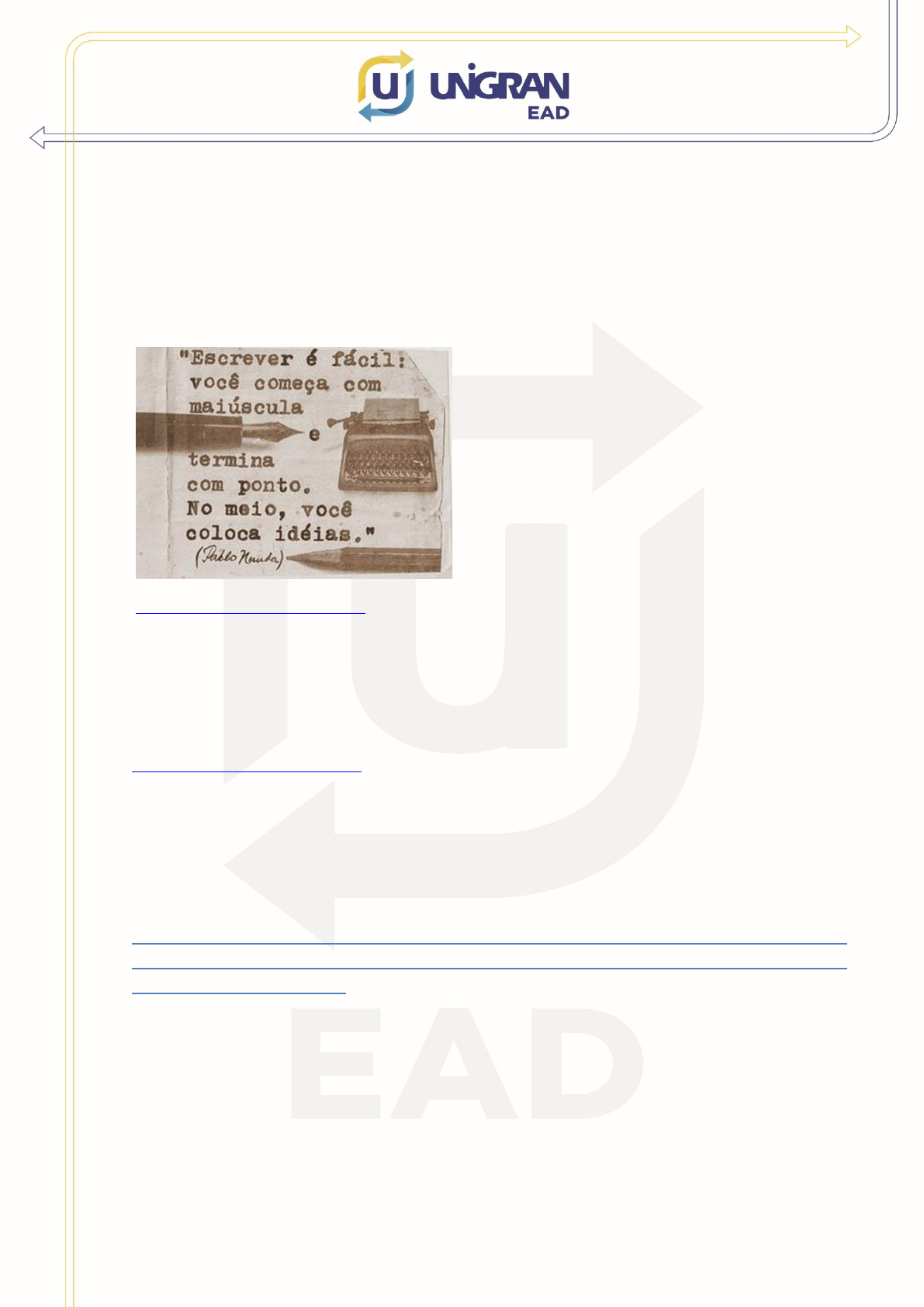 http://mestrechassot.blogspot.com.br/ ATIVIDADE 2 Envie até 26/8 para que tenha a correção antes da prova. http://mestrechassot.blogspot.com.br/ Caro aluno(a), Na aula 2, tratamos sobre o processo da escrita. Para praticar, você deverá fazer um resumo, de 12 a 15 linhas, do artigo a seguir. Lembre-se de que o resumo é uma atividade que exige leitura, compreensão do que leu e escrita. O resumo deve ser feito com suas palavras. Não deve acrescentar informações nem emitir opiniões ou fazer comentários. Copiar trechos do artigo zera a atividade. O valor total da atividade é 10. Envie as respostas no prazo determinado, por meio do Portfólio - ferramenta do ambiente de aprendizagem UNIGRAN Virtual. Em caso de dúvidas, deixe recado no quadro de avisos. A correção da escrita é parte da avaliação. Bons estudos! NOME RGM: POLO: A leitura e a escrita no processo de alfabetização Flávia Lima Ciríaco Doutoranda em Ciência da Educação (Unigrendal) [...] O processo de leitura e escrita emprega uma série de estratégias, isto é, um amplo esquema para obter, avaliar e utilizar informação. A leitura e a escrita, como qualquer atividade humana, são uma conduta inteligente. As pessoas não respondem simplesmente aos estímulos do meio; encontram ordem e estrutura no mundo de tal maneira que podem aprender com base em suas experiências, antecipá-las e compreendê-las. Os leitores desenvolvem estratégias para trabalhar com o texto, construindo significado ou compreendendo-o. Usam-nas tanto na leitura, quando podem se modificar e se desenvolver durante tal processo. É óbvio que isso só ocorre se houver leitura. Algumas considerações fundamentais sobre a leitura e a escrita: são atividades construtivas e criativas com quatro características fundamentais: objetiva, que lê-se por uma razão, com uma finalidade; a seletiva, presta-se atenção naquilo que é relevante aos objetivos que se tem; a antecipatória, os objetivos definem as expectativas diante do texto; e a baseada na compreensão, em que a compreensão é a base e não a consequência da leitura. Conhecimentos especiais que as crianças devem possuir para aprender a ler e não considerar o ensino da leitura absurdo são: a escrita é significativa, e a linguagem escrita não é a mesma coisa que a fala (apesar da relação estreita entre ambas). Ler é extrair sentido dos textos. O objetivo principal da leitura é compreender um texto e, por ela, o que propõe, sugere ou instiga. A compreensão implica conhecer a intenção do autor, identificar mensagens explícitas e implícitas, cotejar o que está no texto com o que o leitor já sabe ou pensa a respeito do assunto. Em outras palavras: ler é um processo permanente, ativo e interativo de análise e síntese. A leitura envolve diversos níveis. O nível mais elementar é o fonológico, o nível de identificação pura e simples da palavra. Ouvimos mentalmente o som da palavra escrita e identificamos em nosso dicionário mental a palavra lida. A rápida identificação da palavra depende de uma série de fatores. Numa leitura, interessa não apenas identificar rapidamente uma palavra, mas identificar rapidamente todas as palavras que compõem uma frase, um parágrafo ou mesmo um conjunto de parágrafos. Daí a importância da fluência, que desempenha papel muito importante para a compreensão até atingir certo limite. A leitura e a escrita são práticas que se relacionam e complementam a formação de um leitor competente, o objetivo maior da escola, pois a leitura e a escrita são os maiores instrumentos para a construção do conhecimento. Despertar no aluno o interesse pela leitura é o maior legado de uma prática constante da leitura de textos variados. O ser humano é capaz de refletir sobre a linguagem e analisá-la, e a linguagem é o próprio instrumento para essa reflexão. Para Kleiman (1993), a linguagem funcionaria, segundo essa perspectiva, como um “repositório” de mensagens. Ao leitor seria dada a tarefa de extraí-las pelo domínio de palavras, numa atitude passiva. Exercícios como os de substituição de palavras do texto por sinônimos ou as famosas questões de compreensão explorando apenas informações óbvias estariam, segundo a autora, fundamentadas nessa teoria, que vê a língua como um instrumento de comunicação. O conceito de leitura mais completo está fundamentado nos estudos reconhecidos genericamente como Linguística Pragmática, os quais, de acordo com Koch (1995), tratam das manifestações linguísticas produzidas por indivíduos concretos em situações concretas, sob determinadas condições de produção. Nessa perspectiva, ler seria igual a construir sentido. Para Fulgênio (1992), a leitura e a escrita são resultadas das interações entre informações visuais e não visuais, ou seja, quem lê e escreve constrói significados unindo todo o seu conhecimento de mundo, seus esquemas mentais relacionados ao conteúdo tratado no texto, às informações oferecidas pelo autor, expressas no papel. Conforme afirma Solé (1998), uma estratégia poderia ser considerada um procedimento, tendo em vista que um procedimento seria um conjunto de ações ordenadas e finalizadas, isto é, dirigidas à consecução de uma meta. Por outro lado, existem vários tipos de procedimento: uns que exigem ações mais automatizadas, como o ato de amarrar o cadarço do sapato, e outras que exigem capacidade de pensamento estratégico. As estratégias usadas na compreensão de um texto estão enquadradas no segundo tipo, ou seja, constituem um conjunto de ações mentais desenvolvidas pelo leitor para construir o sentido. [...] A leitura e a escrita constituem símbolos externos de uma nação, e esta é a razão pela qual os tesouros escritos são o principal alvo de destruição dos conquistadores. Cortez, ao conquistar o México, queimou os livros astecas que podiam trazer à população nativa recordações de seu passado glorioso