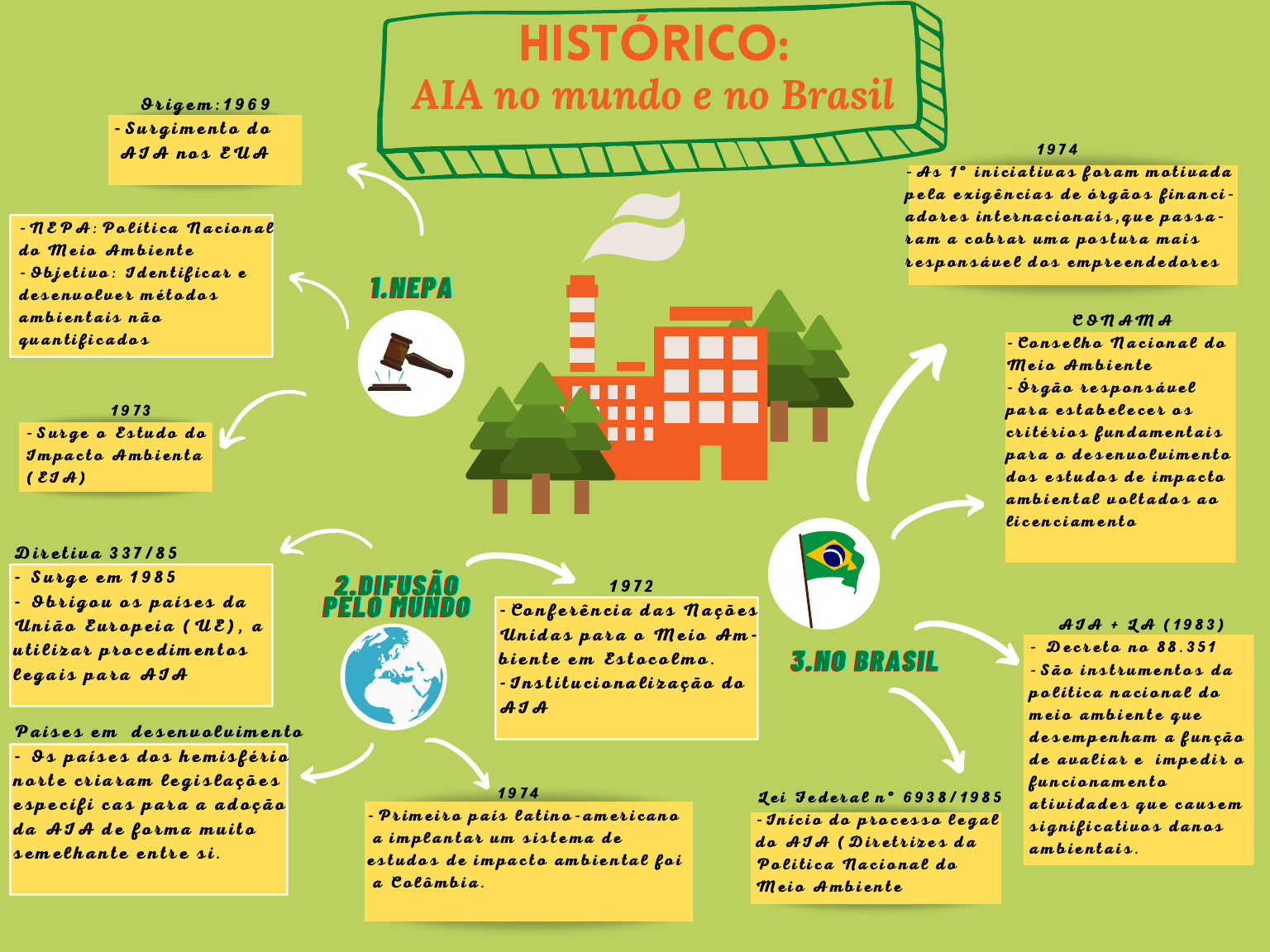 D i r e t i v a 3 3 7 / 8 5 - S u r g e e m 1 9 8 5 - O b r i g o u o s p a í s e s d a U n i ã o E u r o p e i a (U E ) , a u t i l i z a r p r o c e d i m e n t o s l e g a i s p a r a A I A -N E P A :P o l í t i c a N a c i o n a l d o M e i o A m b i e n t e -O b j e t i v o : I d e n t i f i c a r e d e s e n v o l v e r m é t o d o s a m b i e n t a i s n ã o q u a n t i f i c a d o s P a í s e s e m d e s e n v o l v i m e n t o - O s p a í s e s d o s h e m i s f é r i o n o r t e c r i a r a m l e g i s l a ç õ e s e s p e c í f i c a s p a r a a a d o ç ã o d a A I A d e f o r m a m u i t o s e m e l h a n t e e n t r e s i . C O N A M A -C o n s e l h o N a c i o n a l d o M e i o A m b i e n t e -Ó r g ã o r e s p o n s á v e l p a r a e s t a b e l e c e r o s c r i t é r i o s f u n d a m e n t a i s p a r a o d e s e n v o l v i m e n t o d o s e s t u d o s d e i m p a c t o a m b i e n t a l v o l t a d o s a o l i c e n c i a m e n t o HistóriCo: AIA no mundo e no Brasil A I A + L A ( 1 9 8 3 ) - D e c r e t o n o 8 8 . 3 5 1 -S ã o i n s t r u m e n t o s d a p o l í t i c a n a c i o n a l d o m e i o a m b i e n t e q u e d e s e m p e n h a m a f u n ç ã o d e a v a l i a r e i m p e d i r o f u n c i o n a m e n t o a t i v i d a d e s q u e c a u s e m s i g n i f i c a t i v o s d a n o s a m b i e n t a i s . 1 9 7 4 -A s 1 ° i n i c i a t i v a s f o r a m m o t i v a d a p e l a e x i g ê n c i a s d e ó r g ã o s f i n a n c i - a d o r e s i n t e r n a c i o n a i s ,q u e p a s s a - r a m a c o b r a r u m a p o s t u r a m a i s r e s p o n s á v e l d o s e m p r e e n d e d o r e s O r i g e m : 1 9 69 -S u r g i m e n t o d o A I A n o s E U A 1 9 7 3 -S u r g e o E s t u d o d o I m p a c t o A m b i e n t a (E I A ) L e i F e d e r a l n ° 693 8 / 1 9 8 5 -I n í c i o d o p r o c e s s o l e g a l d o A I A (D i r e t r i z e s d a P o l i t i c a N a c i o n a l d o M e i o A m b i e n t e 1 9 7 4 -P r i m e i r o p a í s l a t i n o -a m e r i c a n o a i m p l a n t a r u m s i s t e m a d e e s t u d o s d e i m p a c t o a m b i e n t a l f o i a C o l ô m b i a . 1 9 7 2 -C o n f e r ê n c i a d a s N a ç õ e s U n i d a s p a r a o M e i o A m - b i e n t e e m E s t o c o l m o . -I n s t i t u c i o n a l i z a ç ã o d o A I A