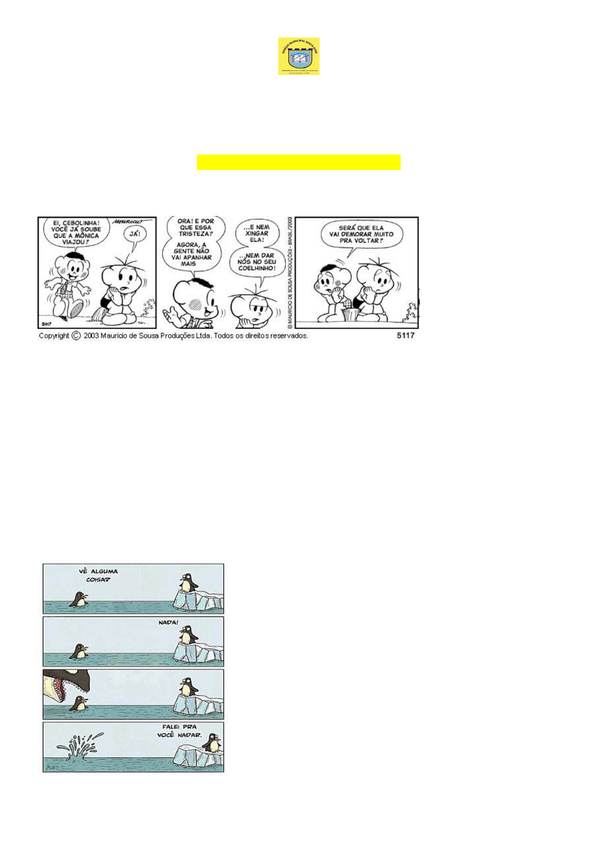 Escola:_____________________________________________________________ Aluno(a):___________________________________________________________ Professora:_________________________________________________________ Data:___/____/______ Ano:_____ Turma:______ Avaliação de Língua Portuguesa Leia a tirinha para responder às questões 1-3. 1º) A frase: “Ei, Cebolinha!” da fala do Cascão no primeiro quadrinho revela: a) indagação. b) entusiasmo. c) dúvida. d) raiva. 2º) Observe que no segundo, na fala do Cascão, está faltando a pontuação no final. Que pontuação abaixo se adequa ao contexto do balão? a) Vírgula. b) Ponto de interrogação. c) Reticências. d) Ponto de exclamação. 3º) Retire da tirinha uma frase interrogativa. ________________________________________________________________________ Leia e responda às questões 4-6. 4º) No primeiro quadrinho há uma frase: a) exclamativa b) negativa c) declarativa d) interrogativa 5º) O ponto de exclamação na fala do pinguim do segundo quadrinho indica: a) uma admiração b) uma ordem c) uma indagação d) um entusiasmo 6º) Conforme os elementos não verbais, o pinguim que estava na água conseguiu entender a mensagem do outro pinguim? ________________________________________________________________________ 7º) Qual pontuação indica que a frase terminou? a) dois pontos b) interrogação c) ponto final 8º) Qual pontuação fala de alguém? a) ponto de exclamação b) aspas c) travessão 9º) Escreva uma frase interrogativa. ___________________________________________________________________ 10º) Em qual das frases abaixo, a pontuação foi empregada corretamente? a) O cachorro latiu correu e pulou no sofá. b) O cachorro latiu, correu, e pulou no sofá. c) O cachorro latiu, correu e pulou no sofá. d) O cachorro, latiu, correu e pulou no sofá. Bo� Sort�!