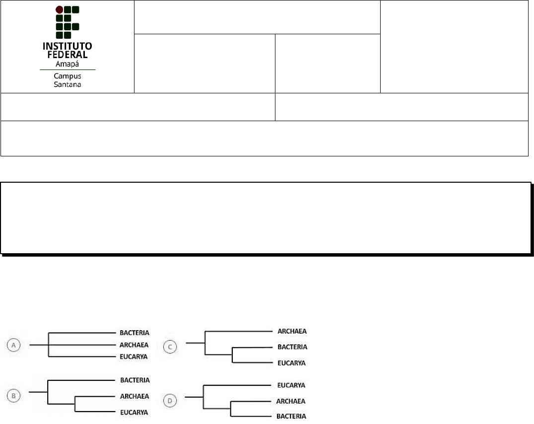 AVALIAÇÃO - 1ª ETAPA ____________________ NOTA Data: ______/04/ 2024 100 pontos Professora: Hanna Patrícia da Silva Bezerra Disciplina: Biologia Discente: ___________________________________________________ Turma:___________________ 01 – Analise as árvores filogenéticas a seguir e indique a representação correta sobre as relações de parentesco entre os domínios de seres vivos (10pt.): 02 – (BEZERRA, 2024) “Esta é uma espécie nova”, explicou. Ao longo da trilha, Silman e seus alunos encontraram trinta espécies de árvores desconhecidas pela ciência. (Só esse grupo de árvores descoberto representa uma vez e meia o número de espécies na floresta boreal do Canadá). E há ainda trezentas outras espécies que eles suspeitam serem novas, mas que ainda precisam ser formalmente classificadas. Além disso, descobriram um gênero inteiro que não era conhecido (Trecho do livro A Sexta Extinção, Elizabeth Kolbert, 2015). Sobre a importância da descrição de novas espécies encontradas e a formalização da sua classificação, marque a alternativa correta (10pt.): a) O processo de classificação dos seres vivos auxilia nos estudos das espécies e seus respectivos grupos, padronizando as nomenclaturas entre cientistas do mundo inteiro. b) A caracterização e a descrição de espécies para classificação formal é realizada considerando apenas características anatômicas. c) As características filogenéticas não são importantes para classificação das espécies. d) A classificação de espécies é realizada pelos cientistas como um hobby, pois não contribui para o avanço do conhecimento. 03 – (BEZERRA, 2024) Em razão das diversas mudanças causadas pelo homem no planeta Terra, várias espécies de seres vivos têm sido extintas ou se encontro em processo de extinção. Entre estas espécies, grupos como o dos anfíbios correm sérios riscos de desaparecerem em um futuro próximo. Espécies de rãs e pererecas como Rana muscosa, Craugastor megacephalus, Gastrotheca cornuta, Hemiphractus fasciatus e Atelopus zeteki, já são raras ou desapareceram completamente dos seus ambientes naturais. Analisando as espécies citadas, é correto afirmar (10pt.): ATENÇÃO: Esta avaliação possui 10 questões, distribuídas em 03 páginas. Verifique a quantidade de páginas e se todas as questões e imagens estão visíveis. A prova deverá ser respondido a caneta AZUL ou PRETA e questões a lápis, em branco, rasuradas e/ou com corretivo serão anuladas, assim como questões de múltipla escolha com mais de uma alternativa marcada. Boa prova!!! a) Todas elas fazem parte do domínio Bacteria, pois são eucariontes pluricelulares. b) Todas elas pertencem ao mesmo gênero, embora sejam espécies diferentes. c) Cada espécie citada pertence a um gênero diferente. d) A Atelopus zeteki, conhecida como rã-dourada-do-Panamá, não pode ser considerada do grupo dos anfíbios. 04 - Em relação às bactérias e arqueas, marque a alternativa correta (10pt.): a) As bactérias causam muitas infecções sexualmente transmissíveis, como o herpes simples, a meningite e a sífilis. b) A principal característica das arqueas é o fato de transmitirem diversas doenças aos animais e plantas. c) Arqueas e bactérias são seres procariontes, mas que pertencem à Domínios diferentes, em razão das diferenças genéticas que apresentam. d) Bactérias são classificadas como termoacidófilas, halófitas e metanogênicas. 05 - (PUC-SP) O filo Protozoa é subdividido em quatro classes: Sarcodínea, Mastigophora, Sporozoa e Ciliophora. A característica considerada para tal classificação é (10pt.): a) o modo de reprodução. b) a estrutura de locomoção. c) a presença ou ausência de carioteca. d) a composição química do pigmento fotossintetizante. 06 - Para se fazer uma prevenção de doenças parasitárias, precisamos conhecer o ciclo dos parasitas humanos. Sobre o ciclo e prevenção dos parasitas humanos marque a alternativa correta (10pt.): a) No ciclo da malária, uma forma infectante do Plasmodium sp. invade células do sistema respiratório, causando sua destruição. b) A prevenção da amebíase e giardíase exige a construção de uma adequada rede de esgoto que possa destinar as fezes para lugar seguro, controle da qualidade da água, correta lavagem de verduras com água não contaminada e hábitos de higiene pessoal. c) A prevenção da leptospirose seria o controle dos insetos transmissores, além de medidas que impeçam o contato entre as pessoas. d) Para erradicar a doença de Chagas é necessário combater o mosquito Aedes aegypti com inseticidas e evitar locais de alojamento do mesmo, construindo casas de alvenaria. 07 - (PUC - RJ) Durante um exame de uma criança enferma, o médico explica aos pais que o paciente tem uma doença causada por um organismo, unicelular, procarionte e que pode ser combatido com uso de medicamento conhecido genericamente como um antibiótico. O médico descreveu um organismo classificado como (10pt.): a) Fungo. b) Animal. c) Protozoário. d) Vírus. e) Bactéria. 08 – (OBB, 2020) Embora extremamente simples, acredita-se que os vírus tenham surgido no planeta após os primeiros seres vivos celulares. A característica que suporta essa hipótese é que os vírus (10pt.): a) possuem bioquímica complexa. b) mineralizam fora de seu hospedeiro. c) não sofrem processos evolutivos. d) reproduzem somente de forma assexuada. e) reproduzem somente em células hospedeiras. 09 - (OBB, 2020) O COVID – 19 é uma nova variante de coronavírus, descoberta em 2019. Pode-se afirmar que uma característica deste organismo é (10pt.): a) ribossomo 70 S. b) procarionte. c) DNA como material genético. d) não possui metabolismo próprio. e) alta resistência fora do hospedeiro. 10 – Analise as afirmações da coluna A e relacione-as com os termos da coluna B. Em seguida, marque a alternativa correta (10pt.). COLUNA A COLUNA B A) Doença que ocorre p