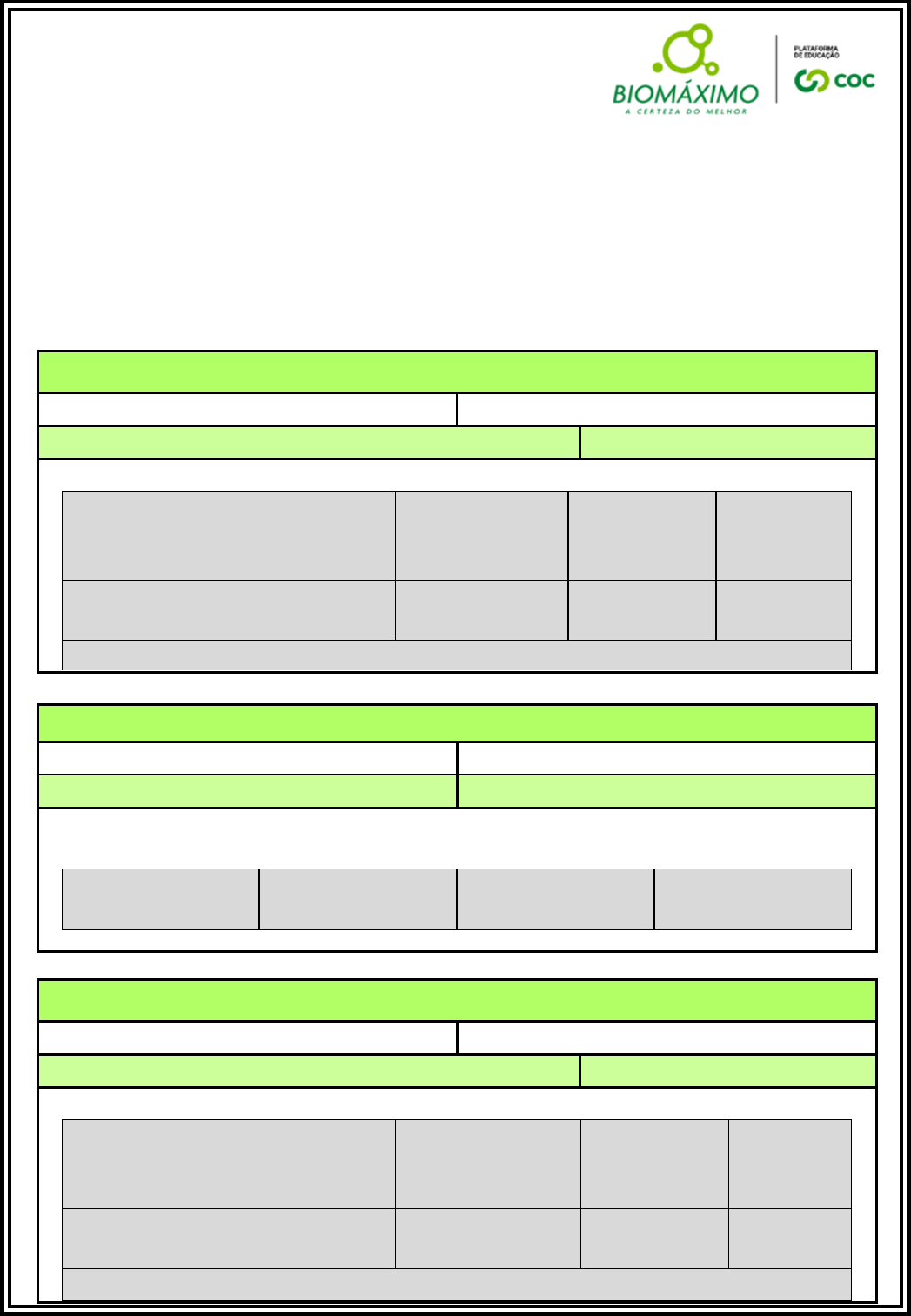 CALENDÁRIO DE AVALIAÇÕES E ATIVIDADE PORTAL COC 1º TRIMESTRE – 2024 – 3º CONVENCIONAL DISTRIBUIÇÃO DE PONTOS Para este trimestre serão distribuídos 30 pontos. Média do trimestre: 18 pontos. SIMULADO ENEM / 1º DIA – LINGUAGENS E CIÊNCIAS HUMANAS • Data: 09 DE MARÇO / 2024 – Sábado • Horário: 7h às 12h30min • Total de questões: 90 QUESTÕES + 01 REDAÇÃO • Valor: 9,0 Pts. • Quantidade de questões por disciplina: PORTUGUÊS Interpretação de Texto – 15 questões Semântica Gramatical – 10 questões GEOGRAFIA 16 questões HISTÓRIA 16 questões FILOSOFIA 06 questões LITERATURA 07 questões INGLÊS 06 questões SOCIOLOGIA 07 questões ARTE 07 questões REDAÇÃO SIMULADO ENEM / 2º DIA – EXATAS E CIÊNCIAS DA NATUREZA • Data: 23 DE MARÇO / 2024 – Sábado • Horário: 7h às 12h • Total de questões: 90 QUESTÕES • Valor: 9,0 Pts. • Quantidade de questões por disciplina: MATEMÁTICA 45 questões BIOLOGIA 17 questões FÍSICA 13 questões QUÍMICA 15 questões SIMULADO ENEM / 1º DIA – LINGUAGENS E CIÊNCIAS HUMANAS • Data: 06 DE ABRIL / 2024 – Sábado • Horário: 7h às 12h30min • Total de questões: 90 QUESTÕES + 01 REDAÇÃO • Valor: 9,0 Pts. • Quantidade de questões por disciplina: PORTUGUÊS Interpretação de Texto – 15 questões Semântica Gramatical – 10 questões GEOGRAFIA 16 questões HISTÓRIA 16 questões FILOSOFIA 06 questões LITERATURA 07 questões INGLÊS 06 questões SOCIOLOGIA 07 questões ARTE 07 questões REDAÇÃO SIMULADO ENEM / 2º DIA – EXATAS E CIÊNCIAS DA NATUREZA • Data: 20 DE ABRIL / 2024 – Sábado • Horário: 7h às 12h • Total de questões: 90 QUESTÕES • Valor: 9,0 Pts. • Quantidade de questões por disciplina: MATEMÁTICA 45 questões BIOLOGIA 17 questões FÍSICA 13 questões QUÍMICA 15 questões SIMULADO UNIMONTES • Data: 25 DE ABRIL / 2024 – Quinta-feira • Horário: 7h às 11h • Total de questões: 45 QUESTÕES + REDAÇÃO • Valor: 7,0 Pts. • Quantidade de questões por área: ÁREA 01 – 45 QUESTÕES + REDAÇÃO PORTUGUÊS 10 questões HISTÓRIA 10 questões INGLÊS 04 questões SOCIOLOGIA 03 questões LITERATURA 05 questões GEOGRAFIA 10 questões FILOSOFIA 03 questões REDAÇÃO ÁREA 02 – 45 QUESTÕES + REDAÇÃO PORTUGUÊS 10 questões HISTÓRIA 10 questões INGLÊS 04 questões SOCIOLOGIA 03 questões LITERATURA 05 questões MATEMÁTICA 10 questões FILOSOFIA 03 questões REDAÇÃO ÁREA 03 – 45 QUESTÕES + REDAÇÃO PORTUGUÊS 10 questões QUÍMICA 10 questões INGLÊS 04 questões SOCIOLOGIA 03 questões LITERATURA 05 questões BIOLOGIA 10 questões FILOSOFIA 03 questões REDAÇÃO ÁREA 04 – 45 QUESTÕES + REDAÇÃO PORTUGUÊS 10 questões MATEMÁTICA 10 questões INGLÊS 04 questões SOCIOLOGIA 03 questões LITERATURA 05 questões FÍSICA 10 questões FILOSOFIA 03 questões REDAÇÃO ATIVIDADE PORTAL COC - ÁREA: LINGUAGENS E CIÊNCIAS HUMANAS • Valor: 3,0 Pts. • Data da publicação no Portal: 25 de março (2ª-feira) – às 18 horas. • Data de fechamento da atividade do Portal: 12 de abril (6ª-feira) – às 18 horas. • Quantidade de questões: 06 questões ÁREA: CIÊNCIAS EXATAS E CIÊNCIAS DA NATUREZA • Valor: 3,0 Pts. • Data da publicação no Portal: 15 de abril (2ª-feira) – às 18 horas. • Data de fechamento da atividade do Portal: 03 de maio (6ª-feira) – às 18 horas. • Quantidade de questões: 06 questões AVALIAÇÃO FORMATIVA – 2,0 Pts. SEGUNDA CHAMADA – 1ª ETAPA DATA DISCIPLINA 27/04/2024 – Sábado Simulado ENEM – 1º Dia Linguagens e Ciências Humanas 29/04/2024 – Segunda-feira Simulado ENEM – 2º Dia Ciências Exatas e Ciências da Natureza 30/04/2024 – Terça-feira Simulado UNIMONTES – Todas as áreas