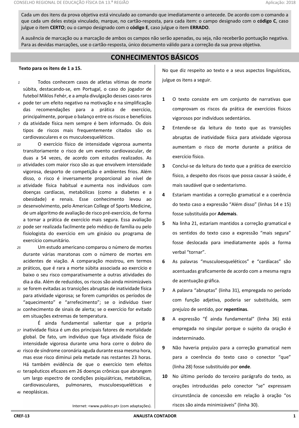 pcimarkpci MDAwMDowMDAwOjAwMDA6MDAwMDowMDAwOmZmZmY6OTU0ZTpiOTcw:VGh1LCAxOSBKdW4gMjAyNSAxMDo1NTowMiAtMDMwMA== www.pciconcursos.com.br CONSELHO REGIONAL DE EDUCAÇÃO FÍSICA DA 13.ª REGIÃO Aplicação: 2018 CREF‐13 ANALISTA CONTADOR 1 Cada um dos itens da prova objetiva está vinculado ao comando que imediatamente o antecede. De acordo com o comando a que cada um deles esteja vinculado, marque, no cartão‐resposta, para cada item: o campo designado com o código C, caso julgue o item CERTO; ou o campo designado com o código E, caso julgue o item ERRADO. A ausência de marcação ou a marcação de ambos os campos não serão apenadas, ou seja, não receberão pontuação negativa. Para as devidas marcações, use o cartão‐resposta, único documento válido para a correção da sua prova objetiva. CONHECIMENTOS BÁSICOS Texto para os itens de 1 a 15. 1 4 7 10 13 16 19 22 25 28 31 34 37 40 43 46 Todos conhecem casos de atletas vítimas de morte súbita, destacando‐se, em Portugal, o caso do jogador de futebol Miklos Fehér, e a ampla divulgação desses casos raros pode ter um efeito negativo na motivação e na simplificação das recomendações para a prática de exercício, principalmente, porque o balanço entre os riscos e benefícios da atividade física nem sempre é bem informado. Os dois tipos de riscos mais frequentemente citados são os cardiovasculares e os musculoesqueléticos. O exercício físico de intensidade vigorosa aumenta transitoriamente o risco de um evento cardiovascular, de duas a 54 vezes, de acordo com estudos realizados. As atividades com maior risco são as que envolvem intensidade vigorosa, desporto de competição e ambientes frios. Além disso, o risco é inversamente proporcional ao nível de atividade física habitual e aumenta nos indivíduos com doenças cardíacas, metabólicas (como a diabetes e a obesidade) e renais. Esse conhecimento levou ao desenvolvimento, pelo American College of Sports Medicine, de um algoritmo de avaliação de risco pré‐exercício, de forma a tornar a prática de exercício mais segura. Essa avaliação pode ser realizada facilmente pelo médico de família ou pelo fisiologista do exercício em um ginásio ou programa de exercício comunitário. Um estudo americano comparou o número de mortes durante várias maratonas com o número de mortes em acidentes de viação. A comparação mostrou, em termos práticos, que é rara a morte súbita associada ao exercício e baixo o seu risco comparativamente a outras atividades do dia a dia. Além de reduzidos, os riscos são ainda minimizáveis se forem evitadas as transições abruptas de inatividade física para atividade vigorosa; se forem cumpridos os períodos de “aquecimento” e “arrefecimento”; se o indivíduo tiver conhecimento de sinais de alerta; se o exercício for evitado em situações extremas de temperatura. É ainda fundamental salientar que a própria inatividade física é um dos principais fatores de mortalidade global. De fato, um indivíduo que faça atividade física de intensidade vigorosa durante uma hora corre o dobro do risco de síndrome coronária aguda durante essa mesma hora, mas esse risco diminui pela metade nas restantes 23 horas. Há também evidência de que o exercício tem efeitos terapêuticos eficazes em 26 doenças crônicas que abrangem um largo espectro de condições psiquiátricas, metabólicas, cardiovasculares, pulmonares, musculoesqueléticas e neoplásicas. Internet: (com adaptações). No que diz respeito ao texto e a seus aspectos linguísticos, julgue os itens a seguir. 1 O texto consiste em um conjunto de narrativas que comprovam os riscos da prática de exercícios físicos vigorosos por indivíduos sedentários. 2 Entende‐se da leitura do texto que as transições abruptas de inatividade física para atividade vigorosa aumentam o risco de morte durante a prática de exercício físico. 3 Conclui‐se da leitura do texto que a prática de exercício físico, a despeito dos riscos que possa causar à saúde, é mais saudável que o sedentarismo. 4 Estariam mantidas a correção gramatical e a coerência do texto caso a expressão “Além disso” (linhas 14 e 15) fosse substituída por Ademais. 5 Na linha 21, estariam mantidos a correção gramatical e os sentidos do texto caso a expressão “mais segura” fosse deslocada para imediatamente após a forma verbal “tornar”. 6 As palavras “musculoesqueléticos” e “cardíacas” são acentuadas graficamente de acordo com a mesma regra de acentuação gráfica. 7 A palavra “abruptas” (linha 31), empregada no período com função adjetiva, poderia ser substituída, sem prejuízo de sentido, por repentinas. 8 A expressão “É ainda fundamental” (linha 36) está empregada no singular porque o sujeito da oração é indeterminado. 9 Não haveria prejuízo para a correção gramatical nem para a coerência do texto caso o conector “que” (linha 28) fosse substituído por onde. 10 No último período do terceiro parágrafo do texto, as orações introduzidas pelo conector “se” expressam circunstância de concessão em relação à oração “os riscos são ainda minimizáveis” (linha 30). pcimarkpci MDAwMDowMDAwOjAwMDA6MDAwMDowMDAwOmZmZmY6OTU0ZTpiOTcw:VGh1LCAxOSBKdW4gMjAyNSAxMDo1NTowMiAtMDMwMA== www.pciconcursos.com.br CONSELHO REGIONAL DE EDUCAÇÃO FÍSICA DA 13.ª REGIÃO Aplicação: 2018 CREF‐13 ANALISTA CONTADOR 2 Julgue os próximos itens no que se refere à correção gramatical e à coerência da proposta de reescrita para cada um dos trechos destacados do texto. 11 “O exercício físico de intensidade vigorosa aumenta transitoriamente o risco de um evento cardiovascular, de duas a 54 vezes, de acordo com estudos realizados” (linhas de 10 a 12): De acordo com estudos realizados, o risco de um evento cardiovascular aumentar, transitoriamente, entre 2 a 54 vezes, em razão do exercício físico de intensidade vigorosa 12 “De 