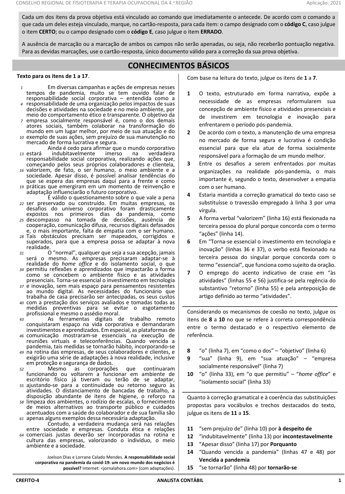 pcimarkpci MDAwMDowMDAwOjAwMDA6MDAwMDowMDAwOmZmZmY6OTU0ZTpiOTcw:VGh1LCAxOSBKdW4gMjAyNSAxMDo1MzozNyAtMDMwMA== www.pciconcursos.com.br CONSELHO REGIONAL DE FISIOTERAPIA E TERAPIA OCUPACIONAL DA 4.a REGIÃO Aplicação: 2021 CREFITO-4 ANALISTA CONTÁBIL 1 Cada um dos itens da prova objetiva está vinculado ao comando que imediatamente o antecede. De acordo com o comando a que cada um deles esteja vinculado, marque, no cartão-resposta, para cada item: o campo designado com o código C, caso julgue o item CERTO; ou o campo designado com o código E, caso julgue o item ERRADO. A ausência de marcação ou a marcação de ambos os campos não serão apenadas, ou seja, não receberão pontuação negativa. Para as devidas marcações, use o cartão-resposta, único documento válido para a correção da sua prova objetiva. CONHECIMENTOS BÁSICOS Texto para os itens de 1 a 17. 1 4 7 10 13 16 19 22 25 28 31 34 37 40 43 46 49 52 55 58 61 64 Em diversas campanhas e ações de empresas nesses tempos de pandemia, muito se tem ouvido falar de responsabilidade social corporativa – entendida como a responsabilidade de uma organização pelos impactos de suas decisões e atividades na sociedade e no meio ambiente, por meio do comportamento ético e transparente. O objetivo da empresa socialmente responsável é, como o dos demais atores sociais, também colaborar na transformação do mundo em um lugar melhor, por meio de sua atuação e do exemplo de suas ações, sem prejuízo de sua manutenção no mercado de forma lucrativa e segura. Ainda é cedo para afirmar que o mundo corporativo estará indubitavelmente imerso na verdadeira responsabilidade social corporativa, realizando ações que, começando pelos seus próprios colaboradores e clientela, valorizem, de fato, o ser humano, o meio ambiente e a sociedade. Apesar disso, é possível analisar tendências do que se espera das empresas daqui para a frente e como práticas que emergiram em um momento de reinvenção e adaptação influenciarão o futuro corporativo. É válido o questionamento sobre o que vale a pena ser preservado ou construído. Em muitas empresas, os desafios do universo corporativo foram drasticamente expostos nos primeiros dias da pandemia, como descompasso na tomada de decisões, ausência de cooperação, comunicação difusa, recursos digitais defasados e, o mais importante, falta de empatia com o ser humano. Tais obstáculos precisam ser mapeados, corrigidos e superados, para que a empresa possa se adaptar à nova realidade. O “normal”, qualquer que seja a sua acepção, jamais será o mesmo. As empresas precisaram adaptar-se à realidade do home office e do isolamento social, o que permitiu reflexões e aprendizados que impactarão a forma como se concebem o ambiente físico e as atividades presenciais. Torna-se essencial o investimento em tecnologia e inovação, sem mais espaço para pensamentos resistentes ao mundo digital. As necessidades do funcionário que trabalha de casa precisarão ser antecipadas, os seus custos com a prestação dos serviços avaliados e tomadas todas as medidas preventivas para se evitar o esgotamento profissional e mesmo o assédio moral. As ferramentas digitais de trabalho remoto conquistaram espaço na vida corporativa e demandaram investimentos e aprendizados. Em especial, as plataformas de comunicação mostraram-se essenciais na execução de reuniões virtuais e teleconferências. Quando vencida a pandemia, tais medidas se tornarão hábito, incorporando-se na rotina das empresas, de seus colaboradores e clientes, e exigirão uma série de adaptações à nova realidade, inclusive em proteção e segurança de dados. Mesmo as corporações que continuaram funcionando ou voltarem a funcionar em ambiente de escritório físico já tiveram ou terão de se adaptar, ajustando-se para a continuidade ou retorno seguro às atividades. O distanciamento de bancadas de trabalho, a disposição abundante de itens de higiene, o reforço na limpeza dos ambientes, o rodízio de escalas, o fornecimento de meios alternativos ao transporte público e cuidados acentuados com a saúde do colaborador e de sua família são apenas alguns exemplos dessa necessária adaptação. Contudo, a verdadeira mudança será nas relações entre sociedade e empresas. Conduta ética e relações comerciais justas deverão ser incorporadas na rotina e cultura das empresas, valorizando o indivíduo, o meio ambiente e a sociedade. Joelson Dias e Lorrane Calado Mendes. A responsabilidade social corporativa na pandemia da covid-19: um novo mundo dos negócios é possível? Internet: (com adaptações). Com base na leitura do texto, julgue os itens de 1 a 7. 1 O texto, estruturado em forma narrativa, expõe a necessidade de as empresas reformularem sua concepção de ambiente físico e atividades presenciais e de investirem em tecnologia e inovação para enfrentarem o período pós-pandemia. 2 De acordo com o texto, a manutenção de uma empresa no mercado de forma segura e lucrativa é condição essencial para que ela atue de forma socialmente responsável para a formação de um mundo melhor. 3 Entre os desafios a serem enfrentados por muitas organizações na realidade pós-pandemia, o mais importante é, segundo o texto, desenvolver a empatia com o ser humano. 4 Estaria mantida a correção gramatical do texto caso se substituísse o travessão empregado à linha 3 por uma vírgula. 5 A forma verbal “valorizem” (linha 16) está flexionada na terceira pessoa do plural porque concorda com o termo “ações” (linha 14). 6 Em “Torna-se essencial o investimento em tecnologia e inovação” (linhas 36 e 37), o verbo está flexionado na terceira pessoa do singular porque concorda com o termo “essencial”, que funciona como sujeito da oração. 7 O emprego do acento indicativo de crase em “às atividades” (linhas 55 e 56) justifica-se pela regência do substantivo “retorno” (linha 55) e pela anteposiçã