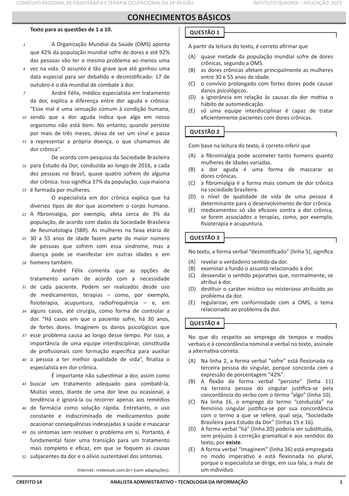 pcimarkpci MDAwMDowMDAwOjAwMDA6MDAwMDowMDAwOmZmZmY6OTU0ZTpiOTcw:VGh1LCAxOSBKdW4gMjAyNSAxMDo1MjoxMCAtMDMwMA== www.pciconcursos.com.br ANALISTA ADMINISTRATIVO – TECNOLOGIA DA INFORMAÇÃOCREFITO-14 CONSELHO REGIONAL DE FISIOTERAPIA E TERAPIA OCUPACIONAL DA 14a REGIÃO INSTITUTO QUADRIX – APLICAÇÃO: 2023 1 CONHECIMENTOS BÁSICOS Texto para as questões de 1 a 10. A Organização Mundial da Saúde (OMS) aponta que 42% da população mundial sofre de dores e até 92% das pessoas vão ter o mesmo problema ao menos uma vez na vida. O assunto é tão grave que até ganhou uma data especial para ser debatido e desmistificado: 17 de outubro é o dia mundial de combate à dor. André Félix, médico especialista em tratamento da dor, explica a diferença entre dor aguda e crônica: “Esse mal é uma sensação comum à condição humana, sendo que a dor aguda indica que algo em nosso organismo não está bem. No entanto, quando persiste por mais de três meses, deixa de ser um sinal e passa a representar a própria doença, o que chamamos de dor crônica”. De acordo com pesquisa da Sociedade Brasileira para Estudo da Dor, conduzida ao longo de 2016, a cada dez pessoas no Brasil, quase quatro sofrem de alguma dor crônica. Isso significa 37% da população, cuja maioria é formada por mulheres. O especialista em dor crônica explica que há diversos tipos de dor que acometem o corpo humano. A fibromialgia, por exemplo, afeta cerca de 3% da população, de acordo com dados da Sociedade Brasileira de Reumatologia (SBR). As mulheres na faixa etária de 30 a 55 anos de idade fazem parte do maior número de pessoas que sofrem com essa síndrome, mas a doença pode se manifestar em outras idades e em homens também. André Félix comenta que as opções de tratamento variam de acordo com a necessidade de cada paciente. Podem ser realizados desde uso de medicamentos, terapias – como, por exemplo, fisioterapia, acupuntura, radiofrequência – e, em alguns casos, até cirurgia, como forma de controlar a dor. “Há casos em que o paciente sofre, há 30 anos, de fortes dores. Imaginem os danos psicológicos que esse problema causa ao longo desse tempo. Por isso, a importância de uma equipe interdisciplinar, constituída de profissionais com formação específica para auxiliar a pessoa a ter melhor qualidade de vida”, finaliza o especialista em dor crônica. É importante não subestimar a dor, assim como buscar um tratamento adequado para combatê‑la. Muitas vezes, diante de uma dor leve ou ocasional, a tendência é ignorá‑la ou recorrer apenas aos remédios de farmácia como solução rápida. Entretanto, o uso constante e indiscriminado de medicamentos pode ocasionar consequências indesejadas à saúde e mascarar os sintomas sem resolver o problema em si. Portanto, é fundamental fazer uma transição para um tratamento mais completo e eficaz, em que se foquem as causas subjacentes da dor e o alívio sustentável dos sintomas. Internet: (com adaptações). QUESTÃO 1 A partir da leitura do texto, é correto afirmar que (A) quase metade da população mundial sofre de dores crônicas, segundo a OMS. (B) as dores crônicas afetam principalmente as mulheres entre 30 e 55 anos de idade. (C) o convívio prolongado com fortes dores pode causar danos psicológicos. (D) a ignorância em relação às causas da dor motiva o hábito de automedicação. (E) só uma equipe interdisciplinar é capaz de tratar eficientemente pacientes com dores crônicas. QUESTÃO 2 Com base na leitura do texto, é correto inferir que (A) a fibromialgia pode acometer tanto homens quanto mulheres de idades variadas. (B) a dor aguda é uma forma de mascarar as dores crônicas. (C) a fibromialgia é a forma mais comum de dor crônica na sociedade brasileira. (D) o nível de qualidade de vida de uma pessoa é determinante para o desenvolvimento de dor crônica. (E) medicamentos só são eficazes contra a dor crônica, se forem associados a terapias, como, por exemplo, fisioterapia e acupuntura. QUESTÃO 3 No texto, a forma verbal “desmistificado” (linha 5), significa (A) revelar o verdadeiro sentido da dor. (B) examinar a fundo o assunto relacionado à dor. (C) desvendar o sentido pejorativo que, normalmente, se atribui à dor. (D) destituir o caráter místico ou misterioso atribuído ao problema da dor. (E) regularizar, em conformidade com a OMS, o tema relacionado ao problema da dor. QUESTÃO 4 No que diz respeito ao emprego de tempos e modos verbais e à concordância nominal e verbal no texto, assinale a alternativa correta. (A) Na linha 2, a forma verbal “sofre” está flexionada na terceira pessoa do singular, porque concorda com a expressão de porcentagem “42%”. (B) A flexão da forma verbal “persiste” (linha 11) na terceira pessoa do singular justifica‑se pela concordância do verbo com o termo “algo” (linha 10). (C) Na linha 16, o emprego do termo “conduzida” no feminino singular justifica‑se por sua concordância com o termo a que se refere, qual seja, “Sociedade Brasileira para Estudo da Dor” (linhas 15 e 16). (D) A forma verbal “há” (linha 20) poderia ser substituída, sem prejuízo à correção gramatical e aos sentidos do texto, por existe. (E) A forma verbal “Imaginem” (linha 36) está empregada no modo imperativo e está flexionada no plural, porque o especialista se dirige, em sua fala, a mais de um indivíduo. 1 4 7 10 13 16 19 22 25 28 31 34 37 40 43 46 49 52 pcimarkpci MDAwMDowMDAwOjAwMDA6MDAwMDowMDAwOmZmZmY6OTU0ZTpiOTcw:VGh1LCAxOSBKdW4gMjAyNSAxMDo1MjoxMCAtMDMwMA== www.pciconcursos.com.br ANALISTA ADMINISTRATIVO – TECNOLOGIA DA INFORMAÇÃOCREFITO-14 CONSELHO REGIONAL DE FISIOTERAPIA E TERAPIA OCUPACIONAL DA 14a REGIÃO INSTITUTO QUADRIX – APLICAÇÃO: 2023 2 QUESTÃO 5 No que se refere à pontuação, estaria mantida a correção gramatical do texto, caso (A) fosse inserida uma vírgula após “realizados” (linha 31). (B) o sinal de dois pontos empr