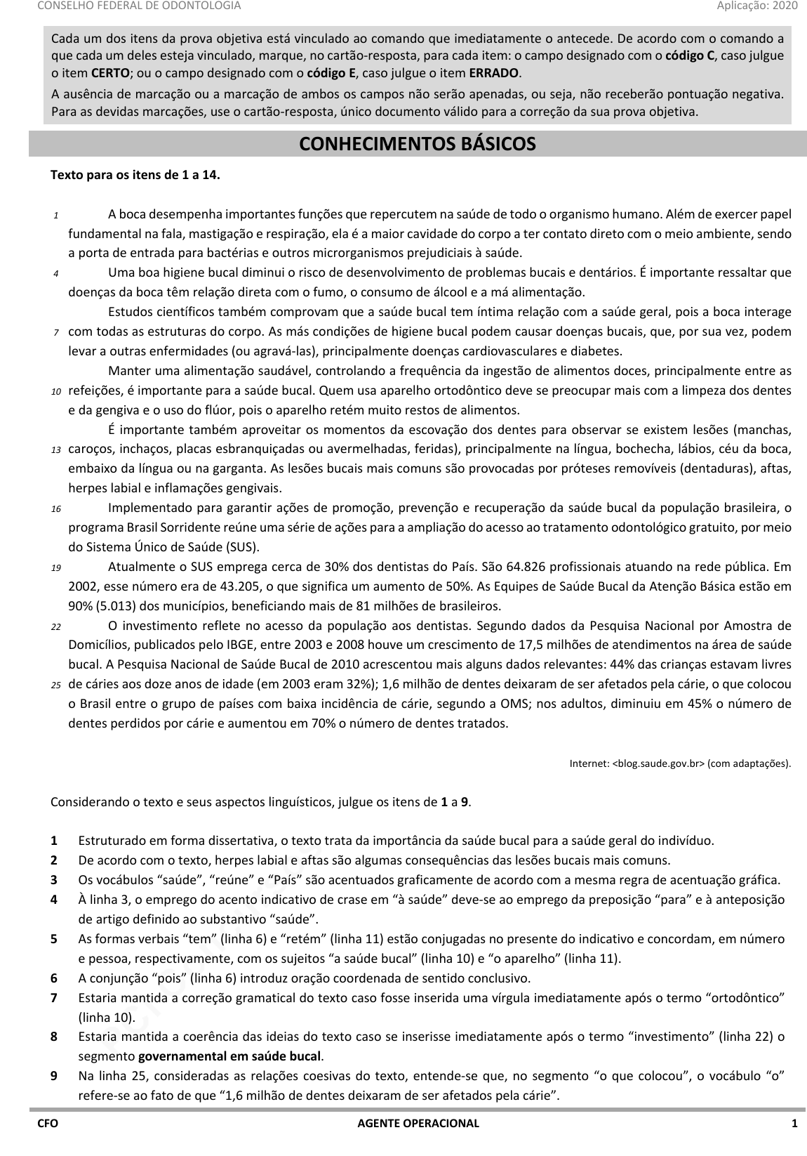 pcimarkpci MDAwMDowMDAwOjAwMDA6MDAwMDowMDAwOmZmZmY6OTU0ZTpiOTcw:VGh1LCAxOSBKdW4gMjAyNSAxMDozMzo1MiAtMDMwMA== www.pciconcursos.com.br CONSELHO FEDERAL DE ODONTOLOGIA Aplicação: 2020 CFO AGENTE OPERACIONAL 1 Cada um dos itens da prova objetiva está vinculado ao comando que imediatamente o antecede. De acordo com o comando a que cada um deles esteja vinculado, marque, no cartão‐resposta, para cada item: o campo designado com o código C, caso julgue o item CERTO; ou o campo designado com o código E, caso julgue o item ERRADO. A ausência de marcação ou a marcação de ambos os campos não serão apenadas, ou seja, não receberão pontuação negativa. Para as devidas marcações, use o cartão‐resposta, único documento válido para a correção da sua prova objetiva. CONHECIMENTOS BÁSICOS Texto para os itens de 1 a 14. 1 4 7 10 13 16 19 22 25 A boca desempenha importantes funções que repercutem na saúde de todo o organismo humano. Além de exercer papel fundamental na fala, mastigação e respiração, ela é a maior cavidade do corpo a ter contato direto com o meio ambiente, sendo a porta de entrada para bactérias e outros microrganismos prejudiciais à saúde. Uma boa higiene bucal diminui o risco de desenvolvimento de problemas bucais e dentários. É importante ressaltar que doenças da boca têm relação direta com o fumo, o consumo de álcool e a má alimentação. Estudos científicos também comprovam que a saúde bucal tem íntima relação com a saúde geral, pois a boca interage com todas as estruturas do corpo. As más condições de higiene bucal podem causar doenças bucais, que, por sua vez, podem levar a outras enfermidades (ou agravá‐las), principalmente doenças cardiovasculares e diabetes. Manter uma alimentação saudável, controlando a frequência da ingestão de alimentos doces, principalmente entre as refeições, é importante para a saúde bucal. Quem usa aparelho ortodôntico deve se preocupar mais com a limpeza dos dentes e da gengiva e o uso do flúor, pois o aparelho retém muito restos de alimentos. É importante também aproveitar os momentos da escovação dos dentes para observar se existem lesões (manchas, caroços, inchaços, placas esbranquiçadas ou avermelhadas, feridas), principalmente na língua, bochecha, lábios, céu da boca, embaixo da língua ou na garganta. As lesões bucais mais comuns são provocadas por próteses removíveis (dentaduras), aftas, herpes labial e inflamações gengivais. Implementado para garantir ações de promoção, prevenção e recuperação da saúde bucal da população brasileira, o programa Brasil Sorridente reúne uma série de ações para a ampliação do acesso ao tratamento odontológico gratuito, por meio do Sistema Único de Saúde (SUS). Atualmente o SUS emprega cerca de 30% dos dentistas do País. São 64.826 profissionais atuando na rede pública. Em 2002, esse número era de 43.205, o que significa um aumento de 50%. As Equipes de Saúde Bucal da Atenção Básica estão em 90% (5.013) dos municípios, beneficiando mais de 81 milhões de brasileiros. O investimento reflete no acesso da população aos dentistas. Segundo dados da Pesquisa Nacional por Amostra de Domicílios, publicados pelo IBGE, entre 2003 e 2008 houve um crescimento de 17,5 milhões de atendimentos na área de saúde bucal. A Pesquisa Nacional de Saúde Bucal de 2010 acrescentou mais alguns dados relevantes: 44% das crianças estavam livres de cáries aos doze anos de idade (em 2003 eram 32%); 1,6 milhão de dentes deixaram de ser afetados pela cárie, o que colocou o Brasil entre o grupo de países com baixa incidência de cárie, segundo a OMS; nos adultos, diminuiu em 45% o número de dentes perdidos por cárie e aumentou em 70% o número de dentes tratados. Internet: (com adaptações). Considerando o texto e seus aspectos linguísticos, julgue os itens de 1 a 9. 1 Estruturado em forma dissertativa, o texto trata da importância da saúde bucal para a saúde geral do indivíduo. 2 De acordo com o texto, herpes labial e aftas são algumas consequências das lesões bucais mais comuns. 3 Os vocábulos “saúde”, “reúne” e “País” são acentuados graficamente de acordo com a mesma regra de acentuação gráfica. 4 À linha 3, o emprego do acento indicativo de crase em “à saúde” deve‐se ao emprego da preposição “para” e à anteposição de artigo definido ao substantivo “saúde”. 5 As formas verbais “tem” (linha 6) e “retém” (linha 11) estão conjugadas no presente do indicativo e concordam, em número e pessoa, respectivamente, com os sujeitos “a saúde bucal” (linha 10) e “o aparelho” (linha 11). 6 A conjunção “pois” (linha 6) introduz oração coordenada de sentido conclusivo. 7 Estaria mantida a correção gramatical do texto caso fosse inserida uma vírgula imediatamente após o termo “ortodôntico” (linha 10). 8 Estaria mantida a coerência das ideias do texto caso se inserisse imediatamente após o termo “investimento” (linha 22) o segmento governamental em saúde bucal. 9 Na linha 25, consideradas as relações coesivas do texto, entende‐se que, no segmento “o que colocou”, o vocábulo “o” refere‐se ao fato de que “1,6 milhão de dentes deixaram de ser afetados pela cárie”. pcimarkpci MDAwMDowMDAwOjAwMDA6MDAwMDowMDAwOmZmZmY6OTU0ZTpiOTcw:VGh1LCAxOSBKdW4gMjAyNSAxMDozMzo1MiAtMDMwMA== www.pciconcursos.com.br CONSELHO FEDERAL DE ODONTOLOGIA Aplicação: 2020 CFO AGENTE OPERACIONAL 2 Com relação à correção gramatical e à coerência das substituições propostas para vocábulos e trechos destacados do texto, julgue os itens de 10 a 14. 10 “o meio ambiente, sendo” (linha 2) por o meio ambiente e 11 “que” (linha 7) por as quais 12 “deve se preocupar” (linha 10) por deve preocupar‐se 13 “se” (linha 12) por caso 14 “houve” (linha 21) por tiveram ____________________________________________________ Julgue os itens 15