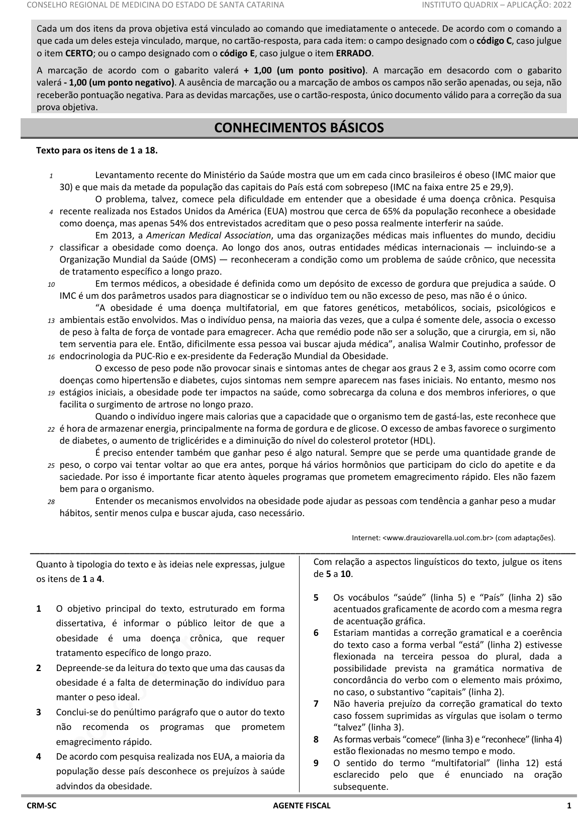 pcimarkpci MDAwMDowMDAwOjAwMDA6MDAwMDowMDAwOmZmZmY6OTU0ZTpiOTcw:VGh1LCAxOSBKdW4gMjAyNSAxMDozMDoyOSAtMDMwMA== www.pciconcursos.com.br CONSELHO REGIONAL DE MEDICINA DO ESTADO DE SANTA CATARINA INSTITUTO QUADRIX – APLICAÇÃO: 2022 CRM-SC AGENTE FISCAL 1 Cada um dos itens da prova objetiva está vinculado ao comando que imediatamente o antecede. De acordo com o comando a que cada um deles esteja vinculado, marque, no cartão-resposta, para cada item: o campo designado com o código C, caso julgue o item CERTO; ou o campo designado com o código E, caso julgue o item ERRADO. A marcação de acordo com o gabarito valerá + 1,00 (um ponto positivo). A marcação em desacordo com o gabarito valerá - 1,00 (um ponto negativo). A ausência de marcação ou a marcação de ambos os campos não serão apenadas, ou seja, não receberão pontuação negativa. Para as devidas marcações, use o cartão-resposta, único documento válido para a correção da sua prova objetiva. CONHECIMENTOS BÁSICOS Texto para os itens de 1 a 18. 1 4 7 10 13 16 19 22 25 28 Levantamento recente do Ministério da Saúde mostra que um em cada cinco brasileiros é obeso (IMC maior que 30) e que mais da metade da população das capitais do País está com sobrepeso (IMC na faixa entre 25 e 29,9). O problema, talvez, comece pela dificuldade em entender que a obesidade é uma doença crônica. Pesquisa recente realizada nos Estados Unidos da América (EUA) mostrou que cerca de 65% da população reconhece a obesidade como doença, mas apenas 54% dos entrevistados acreditam que o peso possa realmente interferir na saúde. Em 2013, a American Medical Association, uma das organizações médicas mais influentes do mundo, decidiu classificar a obesidade como doença. Ao longo dos anos, outras entidades médicas internacionais — incluindo-se a Organização Mundial da Saúde (OMS) — reconheceram a condição como um problema de saúde crônico, que necessita de tratamento específico a longo prazo. Em termos médicos, a obesidade é definida como um depósito de excesso de gordura que prejudica a saúde. O IMC é um dos parâmetros usados para diagnosticar se o indivíduo tem ou não excesso de peso, mas não é o único. “A obesidade é uma doença multifatorial, em que fatores genéticos, metabólicos, sociais, psicológicos e ambientais estão envolvidos. Mas o indivíduo pensa, na maioria das vezes, que a culpa é somente dele, associa o excesso de peso à falta de força de vontade para emagrecer. Acha que remédio pode não ser a solução, que a cirurgia, em si, não tem serventia para ele. Então, dificilmente essa pessoa vai buscar ajuda médica”, analisa Walmir Coutinho, professor de endocrinologia da PUC-Rio e ex-presidente da Federação Mundial da Obesidade. O excesso de peso pode não provocar sinais e sintomas antes de chegar aos graus 2 e 3, assim como ocorre com doenças como hipertensão e diabetes, cujos sintomas nem sempre aparecem nas fases iniciais. No entanto, mesmo nos estágios iniciais, a obesidade pode ter impactos na saúde, como sobrecarga da coluna e dos membros inferiores, o que facilita o surgimento de artrose no longo prazo. Quando o indivíduo ingere mais calorias que a capacidade que o organismo tem de gastá-las, este reconhece que é hora de armazenar energia, principalmente na forma de gordura e de glicose. O excesso de ambas favorece o surgimento de diabetes, o aumento de triglicérides e a diminuição do nível do colesterol protetor (HDL). É preciso entender também que ganhar peso é algo natural. Sempre que se perde uma quantidade grande de peso, o corpo vai tentar voltar ao que era antes, porque há vários hormônios que participam do ciclo do apetite e da saciedade. Por isso é importante ficar atento àqueles programas que prometem emagrecimento rápido. Eles não fazem bem para o organismo. Entender os mecanismos envolvidos na obesidade pode ajudar as pessoas com tendência a ganhar peso a mudar hábitos, sentir menos culpa e buscar ajuda, caso necessário. Internet: (com adaptações). _____________________________________________________________________________________________________________ Quanto à tipologia do texto e às ideias nele expressas, julgue os itens de 1 a 4. 1 O objetivo principal do texto, estruturado em forma dissertativa, é informar o público leitor de que a obesidade é uma doença crônica, que requer tratamento específico de longo prazo. 2 Depreende-se da leitura do texto que uma das causas da obesidade é a falta de determinação do indivíduo para manter o peso ideal. 3 Conclui-se do penúltimo parágrafo que o autor do texto não recomenda os programas que prometem emagrecimento rápido. 4 De acordo com pesquisa realizada nos EUA, a maioria da população desse país desconhece os prejuízos à saúde advindos da obesidade. Com relação a aspectos linguísticos do texto, julgue os itens de 5 a 10. 5 Os vocábulos “saúde” (linha 5) e “País” (linha 2) são acentuados graficamente de acordo com a mesma regra de acentuação gráfica. 6 Estariam mantidas a correção gramatical e a coerência do texto caso a forma verbal “está” (linha 2) estivesse flexionada na terceira pessoa do plural, dada a possibilidade prevista na gramática normativa de concordância do verbo com o elemento mais próximo, no caso, o substantivo “capitais” (linha 2). 7 Não haveria prejuízo da correção gramatical do texto caso fossem suprimidas as vírgulas que isolam o termo “talvez” (linha 3). 8 As formas verbais “comece” (linha 3) e “reconhece” (linha 4) estão flexionadas no mesmo tempo e modo. 9 O sentido do termo “multifatorial” (linha 12) está esclarecido pelo que é enunciado na oração subsequente. pcimarkpci MDAwMDowMDAwOjAwMDA6MDAwMDowMDAwOmZmZmY6OTU0ZTpiOTcw:VGh1LCAxOSBKdW4gMjAyNSAxMDozMDoyOSAtMDMwMA== www.pciconcursos.com.br CONSELHO REGIONAL DE MEDICINA DO ESTADO DE SANTA CATARINA INSTITUTO QUADRIX – APLICAÇÃO: 