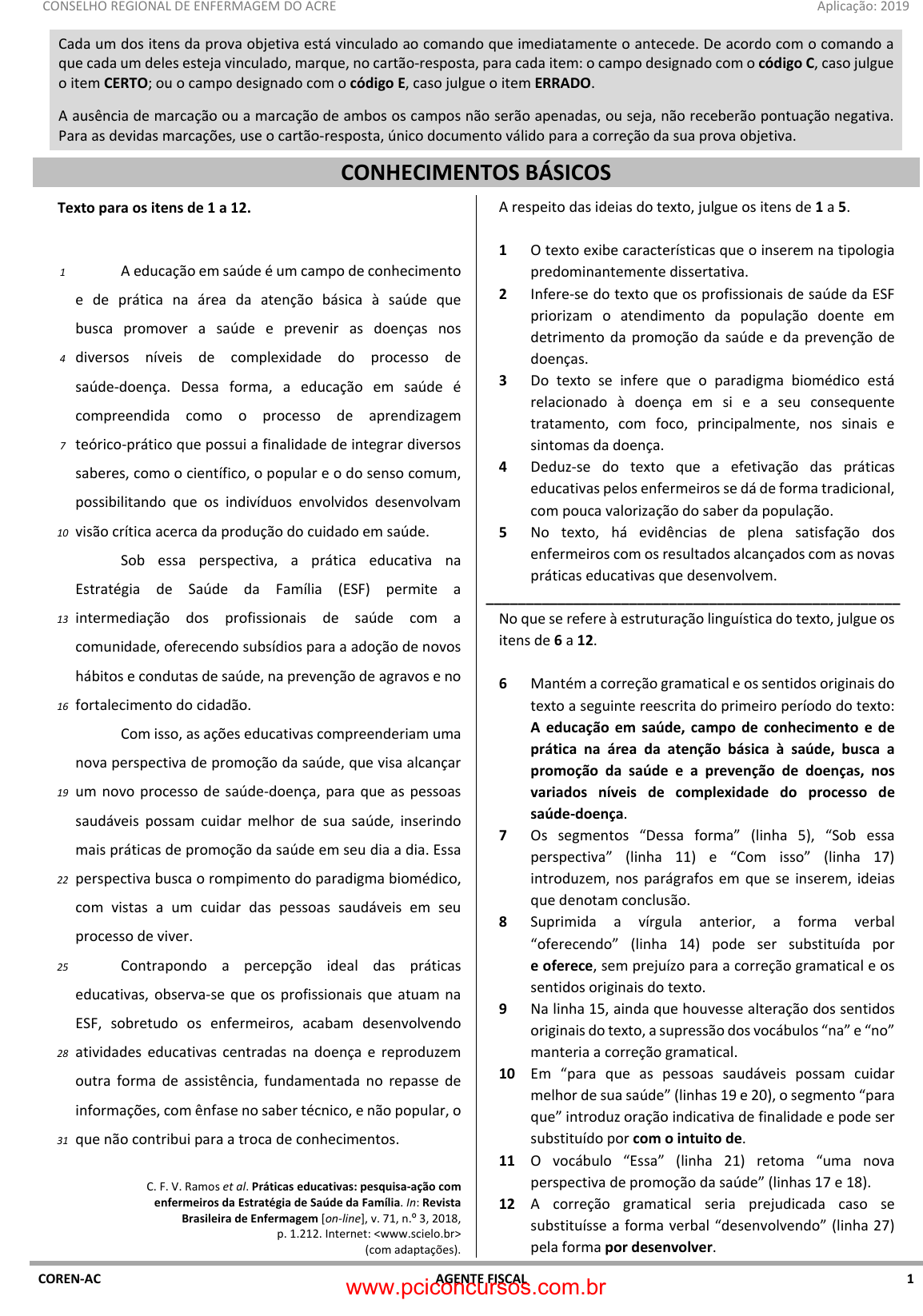 pcimarkpci MDAwMDowMDAwOjAwMDA6MDAwMDowMDAwOmZmZmY6OTU0ZTpiOTcw:VGh1LCAxOSBKdW4gMjAyNSAxMDozMjozMiAtMDMwMA== www.pciconcursos.com.br Cada um dos itens da prova objetiva está vinculado ao comando que imediatamente o antecede. De acordo com o comando a que cada um deles esteja vinculado, marque, no cartão‐resposta, para cada item: o campo designado com o código C, caso julgue o item CERTO; ou o campo designado com o código E, caso julgue o item ERRADO. A ausência de marcação ou a marcação de ambos os campos não serão apenadas, ou seja, não receberão pontuação negativa. Para as devidas marcações, use o cartão‐resposta, único documento válido para a correção da sua prova objetiva. CONSELHO REGIONAL DE ENFERMAGEM DO ACRE Aplicação: 2019 COREN‐AC AGENTE FISCAL 1 CONHECIMENTOS BÁSICOS Texto para os itens de 1 a 12. 1 4 7 10 13 16 19 22 25 28 31 A educação em saúde é um campo de conhecimento e de prática na área da atenção básica à saúde que busca promover a saúde e prevenir as doenças nos diversos níveis de complexidade do processo de saúde‐doença. Dessa forma, a educação em saúde é compreendida como o processo de aprendizagem teórico‐prático que possui a finalidade de integrar diversos saberes, como o científico, o popular e o do senso comum, possibilitando que os indivíduos envolvidos desenvolvam visão crítica acerca da produção do cuidado em saúde. Sob essa perspectiva, a prática educativa na Estratégia de Saúde da Família (ESF) permite a intermediação dos profissionais de saúde com a comunidade, oferecendo subsídios para a adoção de novos hábitos e condutas de saúde, na prevenção de agravos e no fortalecimento do cidadão. Com isso, as ações educativas compreenderiam uma nova perspectiva de promoção da saúde, que visa alcançar um novo processo de saúde‐doença, para que as pessoas saudáveis possam cuidar melhor de sua saúde, inserindo mais práticas de promoção da saúde em seu dia a dia. Essa perspectiva busca o rompimento do paradigma biomédico, com vistas a um cuidar das pessoas saudáveis em seu processo de viver. Contrapondo a percepção ideal das práticas educativas, observa‐se que os profissionais que atuam na ESF, sobretudo os enfermeiros, acabam desenvolvendo atividades educativas centradas na doença e reproduzem outra forma de assistência, fundamentada no repasse de informações, com ênfase no saber técnico, e não popular, o que não contribui para a troca de conhecimentos. C. F. V. Ramos et al. Práticas educativas: pesquisa‐ação com enfermeiros da Estratégia de Saúde da Família. In: Revista Brasileira de Enfermagem [on‐line], v. 71, n.º 3, 2018, p. 1.212. Internet: ____________________________________________________ (com adaptações). A respeito das ideias do texto, julgue os itens de 1 a 5. 1 O texto exibe características que o inserem na tipologia predominantemente dissertativa. 2 Infere‐se do texto que os profissionais de saúde da ESF priorizam o atendimento da população doente em detrimento da promoção da saúde e da prevenção de doenças. 3 Do texto se infere que o paradigma biomédico está relacionado à doença em si e a seu consequente tratamento, com foco, principalmente, nos sinais e sintomas da doença. 4 Deduz‐se do texto que a efetivação das práticas educativas pelos enfermeiros se dá de forma tradicional, com pouca valorização do saber da população. 5 No texto, há evidências de plena satisfação dos enfermeiros com os resultados alcançados com as novas práticas educativas que desenvolvem. No que se refere à estruturação linguística do texto, julgue os itens de 6 a 12. 6 Mantém a correção gramatical e os sentidos originais do texto a seguinte reescrita do primeiro período do texto: A educação em saúde, campo de conhecimento e de prática na área da atenção básica à saúde, busca a promoção da saúde e a prevenção de doenças, nos variados níveis de complexidade do processo de saúde‐doença. 7 Os segmentos “Dessa forma” (linha 5), “Sob essa perspectiva” (linha 11) e “Com isso” (linha 17) introduzem, nos parágrafos em que se inserem, ideias que denotam conclusão. 8 Suprimida a vírgula anterior, a forma verbal “oferecendo” (linha 14) pode ser substituída por e oferece, sem prejuízo para a correção gramatical e os sentidos originais do texto. 9 Na linha 15, ainda que houvesse alteração dos sentidos originais do texto, a supressão dos vocábulos “na” e “no” manteria a correção gramatical. 10 Em “para que as pessoas saudáveis possam cuidar melhor de sua saúde” (linhas 19 e 20), o segmento “para que” introduz oração indicativa de finalidade e pode ser substituído por com o intuito de. 11 O vocábulo “Essa” (linha 21) retoma “uma nova perspectiva de promoção da saúde” (linhas 17 e 18). 12 A correção gramatical seria prejudicada caso se substituísse a forma verbal “desenvolvendo” (linha 27) pela forma por desenvolver. www.pciconcursos.com.br pcimarkpci MDAwMDowMDAwOjAwMDA6MDAwMDowMDAwOmZmZmY6OTU0ZTpiOTcw:VGh1LCAxOSBKdW4gMjAyNSAxMDozMjozMiAtMDMwMA== www.pciconcursos.com.br CONSELHO REGIONAL DE ENFERMAGEM DO ACRE Aplicação: 2019 COREN‐AC AGENTE FISCAL 2 Nos itens que avaliem conhecimentos de informática, a menos que seja explicitamente informado o contrário, considere que: todos os programas mencionados estejam em configuração‐padrão, em português; o mouse esteja configurado para pessoas destras; expressões como clicar, clique simples e clique duplo refiram‐se a cliques com o botão esquerdo do mouse; e teclar corresponda à operação de pressionar uma tecla e, rapidamente, liberá‐la, acionando‐a apenas uma vez. Considere também que não haja restrições de proteção, de funcionamento e de uso em relação aos programas, arquivos, diretórios, recursos e equipamentos mencionados. operacional Windows 8 e do programa de correio 
