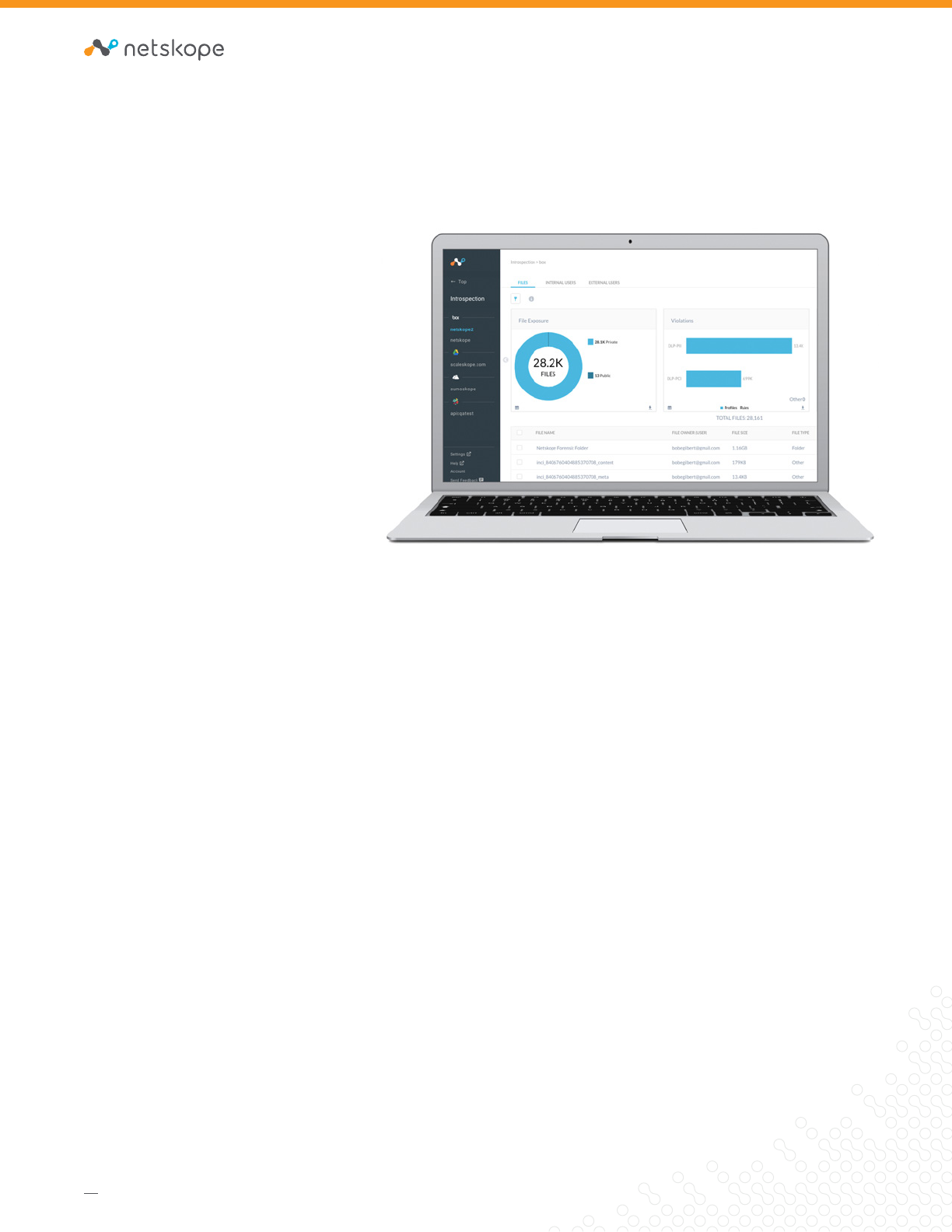 of Netskope, Inc. All other trademarks are trademarks of their respective owners. 06/18 DS-10-8 REAL-TIME AND API PROTECTION Options More than 3,000 pre-defined data identifiers Fingerprinting and Exact Match capabilities* Perform secondary DLP analysis for content leveraging on-premises DLP solution Custom profiles & regular expressions Rules support global identifiers and severity levels Multi-data identifier classification with Boolean operations Pattern & keyword matching Hundreds of industry standard DLP categories Further increase coverage with OCR to extend DLP policies to images* File Types Inspection for more than 1,000 file types Supported Regulations Leverage dozens of pre-defined policy templates to identify sensitive data in accordance with regulations. Templates include (but are not limited to): AMRA, EC Directive, EU-GDPR, GLBA, HIPAA, PCI-DSS, PHI, PII, PHIPA,PIPEDA, SSN Confidentiality Act, US FTC Rules, etc. Non-regulated Data Types Intellectual property data Financial and legal terms National ID numbers International Bank Account Numbers (IBAN) CONTEXT AWARE Policy Is Enforced On Users, user groups, organization unit, custom user list Applications, application instances, application categories File sharing options File types and size Activity types: Upload, download, view, post, send and share Device types: Desktop or mobile Device classification: Managed and unmanaged devices Location types: On-premises and remote Geo location: Source and destination Operating system and browser Sync client INCIDENT MANAGEMENT AND REMEDIATION Complete Context and Visibility of the Violation Forensic information of excerpts of the violation Get granular alerts of violations in SkopeIT DLP and Compliance based reports Incident Workflow Assign incidents to investigate override severity Customizable status for workflows Remediation Workflow Contact the owner Quarantine and restore Restrict file permissions Automatic Policy Actions Alert, Block, Encrypt User Notification and Coaching (redirect to custom notice) Quarantine and Legal Hold Netskope DLP Features Netskope DLP is sold as a separate SKU and requires the purchase of the Netskope Security Cloud or at least one of Netskope’s API Protection SKUs (e.g., Netskope for Office 365). Netskope DLP is available in standard and advanced options. Features marked with an * are not available in standard. DATA VISIBILITY Whether it’s to satisfy auditing requirements, compliance, or just corporate security policies, it’s important to understand where your most sensitive data is flowing and how it’s being used. Netskope gives you a comprehensive understanding of not only all cloud activity, regardless of device, network, or location, but also allows you to identify all sensitive data flowing in the cloud and detect DLP violations with an all-mode architecture capable of covering all cloud traffic whether users are on premises or remote or on a web browser, mobile app, or sync client. This includes discovering sensitive data at rest in sanctioned services and en route to and from all services, sanctioned or unsanctioned.of Netskope, Inc. All other trademarks are trademarks of their respective owners. 06/18 DS-10-8 REAL-TIME AND API PROTECTION Options More than 3,000 pre-defined data identifiers Fingerprinting and Exact Match capabilities* Perform secondary DLP analysis for content leveraging on-premises DLP solution Custom profiles & regular expressions Rules support global identifiers and severity levels Multi-data identifier classification with Boolean operations Pattern & keyword matching Hundreds of industry standard DLP categories Further increase coverage with OCR to extend DLP policies to images* File Types Inspection for more than 1,000 file types Supported Regulations Leverage dozens of pre-defined policy templates to identify sensitive data in accordance with regulations. Templates include (but are not limited to): AMRA, EC Directive, EU-GDPR, GLBA, HIPAA, PCI-DSS, PHI, PII, PHIPA,PIPEDA, SSN Confidentiality Act, US FTC Rules, etc. Non-regulated Data Types Intellectual property data Financial and legal terms National ID numbers International Bank Account Numbers (IBAN) CONTEXT AWARE Policy Is Enforced On Users, user groups, organization unit, custom user list Applications, application instances, application categories File sharing options File types and size Activity types: Upload, download, view, post, send and share Device types: Desktop or mobile Device classification: Managed and unmanaged devices Location types: On-premises and remote Geo location: Source and destination Operating system and browser Sync client INCIDENT MANAGEMENT AND REMEDIATION Complete Context and Visibility of the Violation Forensic information of excerpts of the violation Get granular alerts of violations in SkopeIT DLP and Compliance based reports Incident Workflow Assign incidents to investigate override severity Customizable status for workflows Remediation Workflow Contact the owner Quarantine and restore Restrict file permissions Automatic Policy Actions Alert, Block, Encrypt User Notification and Coaching (redirect to custom notice) Quarantine and Legal Hold Netskope DLP Features Netskope DLP is sold as a separate SKU and requires the purchase of the Netskope Security Cloud or at least one of Netskope’s API Protection SKUs (e.g., Netskope for Office 365). Netskope DLP is available in standard and advanced options. Features marked with an * are not available in standard. DATA VISIBILITY Whether it’s to satisfy auditing requirements, compliance, or just corporate security policies, it’s important to understand where your most sensitive data is flowing and how it’s being used. Netskope gives you a comprehensive understanding of not only all cloud activity, regardless of device, network, or location, but also allows you to identify all sensitive data flowing in the cloud and detect DLP violations with an all-mode architecture capable of covering