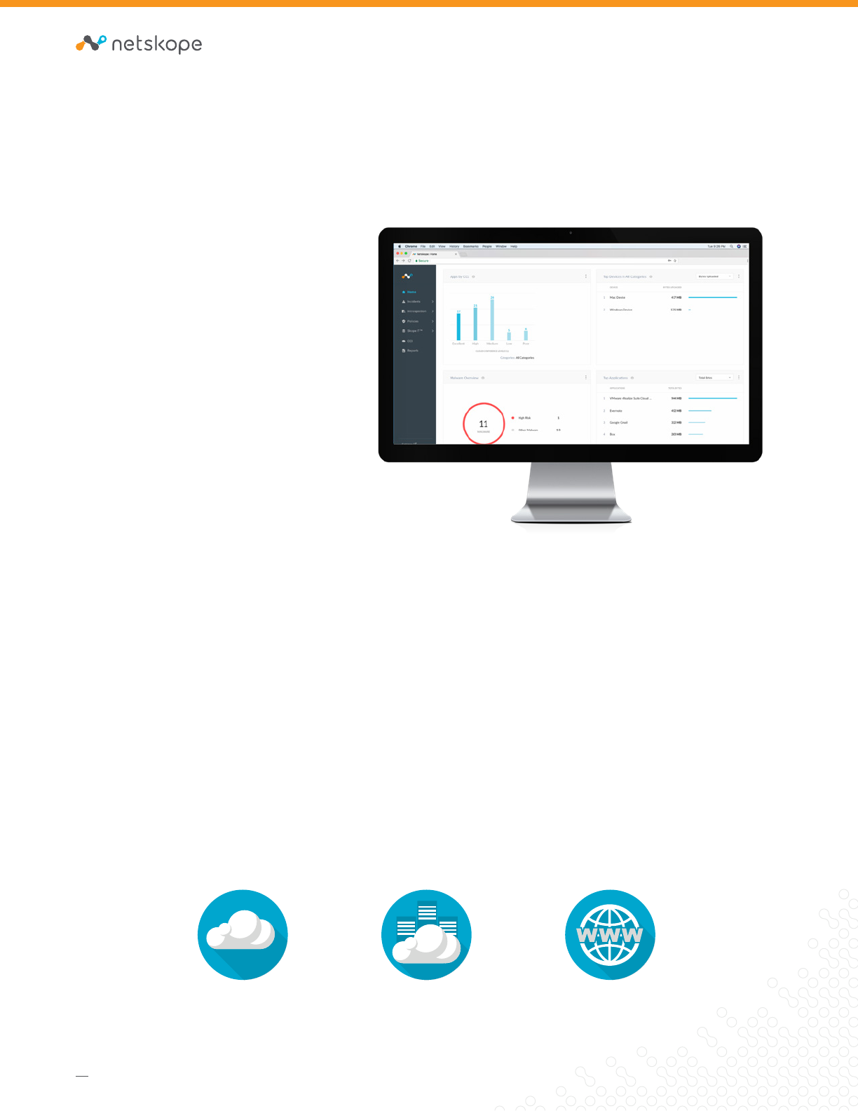 Netskope Security Cloud Data Sheet 1 PRODUCT OVERVIEW Using patented technology called Netskope Cloud XD™, the Netskope Security Cloud eliminates blind spots by going deeper than any other security provider to quickly target and control activities across thousands of cloud (SaaS and IaaS) services and millions of websites. With full control from one cloud, our customers benefit from 360-degree data protection that guards data everywhere and advanced threat protection that stops elusive attacks. At Netskope, we call this smart cloud security. The cloud is transforming your organization. It’s changing how you work as everything is becoming more intuitive, connected, open, and collaborative, and that change is rippling across SaaS, IaaS, and the web. This creates new challenges and risks that legacy security vendors can’t address. You need security that can. • Discover SaaS, IaaS, and web use details and assess risk • Secure your sanctioned cloud services such as Office 365, Box, and AWS • Safely enable unsanctioned, business-led cloud services instead of being forced to block them • Govern cloud and web use for users on- premises, mobile, and remote • Guard sensitive data with award-winning DLP • Stop elusive cloud threats and malware TOP USE CASES AT A GLANCE SaaS IaaS Web The Netskope Security Cloud works across thousands of SaaS and IaaS services —whether sanctioned or unsanctioned—and millions of websites. Unlike any other provider, with Netskope you get full control, all from one cloud architecture that scales automatically. 2 Netskope deployment options support any use case, from an API-only deployment mode to several real-time options. Get complete visibility of all SaaS, IaaS, and web traffic, including from sync clients, mobile apps and TLS-encrypted traffic. Deploy 100% in the cloud, with an on-premises appliance, or a hybrid option. Cloud XD Data Protection Threat Protection Analytics Any User Any Device Any Location SaaS IaaS Web Policy Smart Cloud Security Eliminate blind spots Netskope Cloud XD™ understands SaaS, IaaS, and web in extreme definition to eliminate blind spots Guard data everywhere 360º data protection guards data everywhere through award-winning DLP and encryption Stop elusive attacks Advanced threat protection stops elusive attacks that traverse SaaS, IaaS, and web to inflict damage Full control, one cloud Full control of SaaS, IaaS, and web, from one cloud- native platform that scales automatically THE NETSKOPE DIFFERENCE N EA R R EA L- TI M E RE A L- TI M E Sanctioned cloud Unsanctioned cloud Browser, remote, mobile and desktop apps, sync clients Browser WebBrowser and remote Reverse proxy Forward proxy API Logs Discover Govern usage Secure data Protect against threats Access method 3 Netskope Security Cloud Features SAAS, IAAS, WEB DISCOVERY AND RISK ASSESSMENT Customizable Dashboard A customizable view of all SaaS, IaaS, and web, activities, users, and devices. Granular enough to differentiate between instances of the same SaaS or IaaS service. Netskope Cloud Confidence Index (CCI) The enterprise-readiness of SaaS and IaaS services based on 50+ criteria like security, auditability, and business continuity. Serves as a guidepost to mitigate risk, influence usage and reduce costs. Forensic analysis Deep visibility to understand user activities in SaaS, IaaS, and web. Drill down into granular details including identity, device, browser, time, location, activity (e.g., ‘share’), content, and more for a full audit trail. Ad hoc queries and dynamic reports Perform ad-hoc queries for on-demand analytics and reports, save queries as custom search results, or generate detailed custom reports using natural language inputs and Boolean operators. GRANULAR VISIBILITY AND CONTROL OF SAAS, IAAS, AND WEB Netskope Cloud XD™ Netskope Cloud XD understands all inputs in extreme definition (XD) and performs big data analytics to eliminate blind spots and make policy enforcement simple across all SaaS, IaaS, and web. Real-time policies for all SaaS, IaaS, and web Security and access policies in context (e.g., service, activity, device). Policies can block, alert, bypass, encrypt, quarantine, and coach. Works with web and sanctioned or unsanctioned SaaS and IaaS services. Unified policies for SaaS, IaaS, and web security Simplify deployment and ongoing management by orchestrating all SaaS, IaaS, and web policies from one interface. Web classification and content filtering Govern web use with comprehensive web classification and content filtering. Best-in-class URL database covers 99.9% of the web, intelligence that comes from a dedicated in-house web and cloud application research team, and machine learning-based content analysis for classification of uncategorized URLs. User and remediation workflows Use built-in workflows such as quarantine, legal hold, and user coaching with custom messages. Workflows are specific to policies and capabilities, like automatic tombstoning of malware. ENCRYPTION AND TOKENIZATION Encrypt structured data Encrypt structured data at rest or in real time in sanctioned services through native format-preserving encryption w/ AES-256 encryption and a FIPS 140-2 Level 3-certified KMS and the option of using your on-prem HSM. Encrypt structured data via BYOK Leverage pre-built integrations with CSP’s bring your own key (BYOK) capabilities with AES-256 encryption and a FIPS 140-2 Level 3-certified KMS and the option of using your on-premises HSM. Encrypt unstructured data Encrypt unstructured data at rest in sanctioned services or in real-time activities with AES-256 encryption and a FIPS 140-2 Level 3-certified KMS and the option of using your on-premises HSM. THE NETSKOPE CONSOLE The industry’s only SaaS, IaaS, and web security platform built from the start in one cloud that’s easy-to-use. Unlike cobbled- together tools, Netskope eliminates policy conflict through standardized categories across SaaS, IaaS and web. Save
