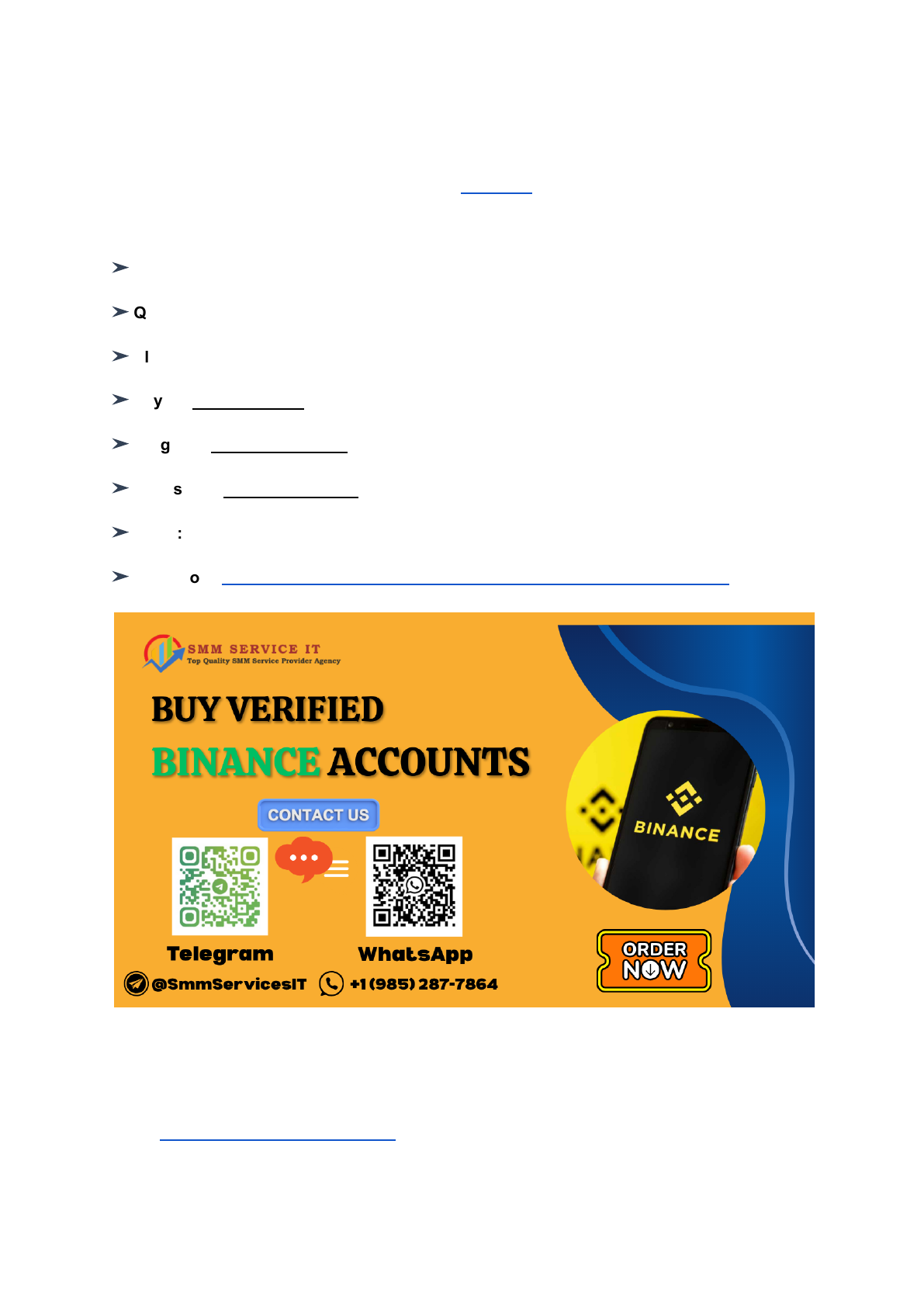 Are you looking to make your mark in the world of cryptocurrency trading, but overwhelmed by the initial hurdles? Imagine having a secure and hassle-free entry into one of the leading crypto exchanges—Binance. If you want to more information just contact now. ➤ We Are Online 24/7 Hours ➤ Quick Delivery ➤ Please Contact Us: ⬇⬇⬇ ➤ Skype: SmmServiceIT ➤Telegram: @SmmServicesIT ➤ WhatsApp: +1 (985) 287-7864 ➤ Email: smmserviceit@gmail.com ➤Order Now: https://smmserviceit.com/product/buy-verified-binance-accounts/ With a verified Binance account, you can skip the time-consuming verification process and dive straight into trading. But before you jump in, it's crucial to understand why buying a verified Binance account could be your game-changer. Let’s explore how this decision can streamline your trading experience and provide you with the security and efficiency you need. Buy Verified Binance Accounts. https://smmserviceit.com/product/buy-verified-binance-accounts/ https://join.skype.com/invite/wmLhDRzAtTvK https://t.me/smmservicesit https://api.whatsapp.com/send?phone=19852877864 https://smmserviceit.com/product/buy-verified-binance-accounts/ https://smmserviceit.com/product/buy-verified-binance-accounts/ By the end of this article, you’ll have a clear understanding of the benefits, the potential pitfalls, and how to make a smart purchase that aligns with your trading ambitions. Ready to unlock the full potential of your crypto journey? Let's get started! What Are Verified Binance Accounts Verified Binance accounts offer enhanced security and access. They provide users with additional features on the Binance platform. Verification ensures compliance with regulations and protects user funds. What Is A Verified Binance Account? A verified Binance account has completed identity verification. This process confirms the user's identity and personal details. Verification involves submitting government-issued ID and a selfie. The process ensures the account holder's authenticity and legality. Benefits Of Using A Verified Binance Account Verified accounts enjoy higher withdrawal limits. Users can access advanced trading features and secure their transactions. Verification also boosts trust among traders and investors. Steps To Verify Your Binance Account First, log into your Binance account. Navigate to the account settings page. Select "Identity Verification" and follow the prompts. Submit the required documents for review. Common Issues During Verification Some users face delays in the verification process. Ensure your documents are clear and readable. Double-check that the information matches your account details. Contact Binance support if issues persist. Why Verification Matters Verification strengthens the platform's security framework. It helps prevent fraud and illegal activities. Verified users experience smoother transactions and a safer trading environment. Benefits Of Verified Accounts Buying a verified Binance account can be a game-changer for anyone looking to step into the world of cryptocurrency with confidence. The perks that come with verified accounts are not just limited to trust and security; they open up a realm of possibilities for seamless transactions and advanced trading features. But what exactly makes a verified Binance account so beneficial? Let's dive into the specific advantages. https://smmserviceit.com/product/buy-verified-binance-accounts/ Enhanced Security Security is a major concern for any online transaction. With a verified Binance account, you get an extra layer of protection. Verified accounts are equipped with advanced security measures like two-factor authentication and encrypted transactions. Buy Verified Binance Accounts. This means that your assets are safer, and you can trade with peace of mind. Higher Withdrawal Limits Have you ever felt restricted by low withdrawal limits? Verified accounts come with significantly higher limits, allowing you to access more of your funds when you need them. This is especially beneficial for those dealing with large volumes of cryptocurrency. You won't have to wait for days to access your money. Access To Advanced Trading Features A verified account on Binance is like having a VIP pass. You get access to advanced trading features not available to unverified users. From margin trading to futures contracts, verified users can use tools that maximize their trading strategies. This is a huge advantage if you want to take your trading to the next level. Buy Verified Binance Accounts. Increased Trustworthiness Imagine you're trading with someone new. Would you prefer a verified account or an unverified one? A verified account instantly boosts your credibility in the crypto community. This trustworthiness can lead to better trading relationships and offers. People are more likely to engage with you when they know you're verified. Streamlined Customer Support Ever had an issue you needed resolved quickly? Verified accounts often receive priority in customer support. This means faster responses and quicker resolutions to any issues you might encounter. If you value timely help, this benefit cannot be overstated. Are you ready to enjoy these benefits? Remember, verified accounts are not just about having a badge; they're about enhancing your trading experience. Make the smart choice for a safer and more efficient trading journey. Risks Of Buying Accounts Purchasing verified Binance accounts might seem convenient. But there are hidden dangers. Many overlook these risks. They can lead to severe consequences. Understanding these risks is crucial. Legal Consequences https://smmserviceit.com/product/buy-verified-binance-accounts/ Buying accounts can breach terms of service. This might lead to account suspension. Legal actions could follow. It's important to read terms carefully. Violating rules can be costly. Buy Verified Binance Accounts. Purchased accounts may have weak security. Hackers target these accoun
