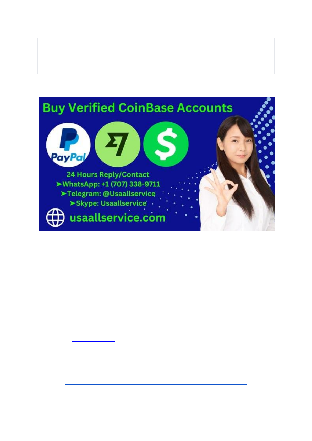 Top Sites To Buy Verified Coinbase Accounts in 2025: Trusted Picks In 2025, buying verified Coinbase accounts can save time and effort. Verified accounts offer quick access and added security for cryptocurrency trading. The demand for verified Coinbase accounts is rising. Many prefer buying these accounts to avoid the hassle of verification. This guide will explore the top sites for purchasing verified Coinbase accounts. These platforms are reliable and cater to the growing needs of crypto enthusiasts. Whether you are a beginner or an experienced trader, having a verified account is crucial. It ensures smooth transactions and peace of mind. Stay tuned to discover the best places to buy verified Coinbase accounts in 2025. This will help you make informed choices and enhance your trading experience. If you want to more information just contact now- 24 Hours Reply/Contact ➤WhatsApp: +1 (707) 338-9711 ➤Telegram: @Usaallservice ➤Skype: Usaallservice ➤Email:usaallservice24@gmail.com VISIT OUR SITE Visit Now:https://usaallservice.com/product/buy-verified-coinbase-accounts/ https://wa.me/qr/4LCERTXN3I7HI1 https://t.me/Usaallservice https://usaallservice.com/product/buy-verified-coinbase-accounts/ Why Verified Accounts Matter Verified accounts offer extra security for your money. They help protect against fraud and unauthorized access. This makes your transactions safer. Your personal information stays safe too. Verified accounts follow strict rules. This adds another layer of protection. In short, they help keep your money and information secure. Verified accounts make transactions quick and easy. You can buy and sell faster. No delays. More trust between buyers and sellers. Transactions go smoothly. Less stress for you. Having a verified account helps you enjoy a better experience. It saves time and effort. Risks Of Unverified Accounts Unverified accounts can be risky. Many scammers use them. They pretend to be real. They steal money or data. This can be scary. Without checks, fraud is easier. Verified accounts are safer. They protect users better. Always check account status. Avoid unverified accounts. Unverified accounts may cause delays. Banks may stop them. Security checks take time. Buying or selling gets slow. This frustrates users. Verified accounts process faster. They have fewer delays. Users like quick transactions. Choose accounts wisely. Criteria For Trusted Sites Reputation indicators help in finding trusted sites. Check user reviews. Positive reviews show trust. Look for sites with high ratings. A site with many good reviews is likely reliable. User reviews are important. Read what others say. Pay attention to the details. Reviews with specific details are more helpful. Look for reviews about account quality. Good reviews mean the site is trustworthy. Top Site: Site A Site A offers many features. You can buy verified Coinbase accounts easily. Their process is quick and simple. They ensure accounts are secure and reliable. Each account comes with full verification. This helps in smooth transactions. You can get accounts at a fair price. There are options for bulk purchases too. This is useful for businesses. Site A also provides excellent customer support. They are available 24/7 for help. Many users trust Site A. They share positive reviews online. Users say the buying process is easy. They receive accounts fast. People like the support team. They find them friendly and helpful. Satisfaction levels are high. Most users recommend Site A to others. They feel safe while using this site. The experience is smooth and hassle-free. Top Site: Site B Site B ensures top-notch security for all transactions. Every account on this site is verified. This means extra safety for buyers. They use advanced encryption to protect user data. Two-step verification is a must here. It adds an extra layer of protection. Site B also conducts regular security audits. This keeps their systems updated and safe. Buying accounts from this site is both secure and reliable. The pricing on Site B is straightforward. They offer competitive rates for verified accounts. Each account has a fixed price. No hidden fees are involved. You pay what you see. The site also provides discounts for bulk purchases. This is great for businesses or multiple buyers. Payments can be made in various ways. This includes credit cards and digital wallets. Site B ensures a smooth buying experience with clear pricing. Top Site: Site C Site C makes buying Coinbase accounts easy. First, visit the website. Choose the account type you need. Make sure to check the prices. Add the account to your cart. Proceed to checkout. Fill in your payment details. Confirm your purchase. Receive the account details in your email. The process is simple and quick. Site C offers great customer support. Live chat is available on the site. Send questions directly to the team. Email support is also an option. Responses are quick. Help is available 24/7. Easy to reach and friendly service. Solve issues with ease. Ensure you get help when needed. Comparative Analysis Buying verified Coinbase accounts has both advantages and disadvantages. The main benefit is easy access to digital currency. You can start trading right away. A verified account saves time. You skip the long verification process. But there are risks involved. You may face security issues. Some accounts might be fake. Always check the site's reputation. Look for user reviews. Verified accounts cost more. Always weigh the pros and cons before buying. It's crucial to make safe choices. Cost matters when buying Coinbase accounts. Prices vary by site. Some offer affordable rates. Others might be expensive. Always compare costs. Check if the price matches the benefits. A cheap account might lack features. Expensive ones could offer more security. Ensure you get good value. Choose wisely for the best deal. Balance cost and quality for the best outcome. Navigating Reviews Discover the best websites to