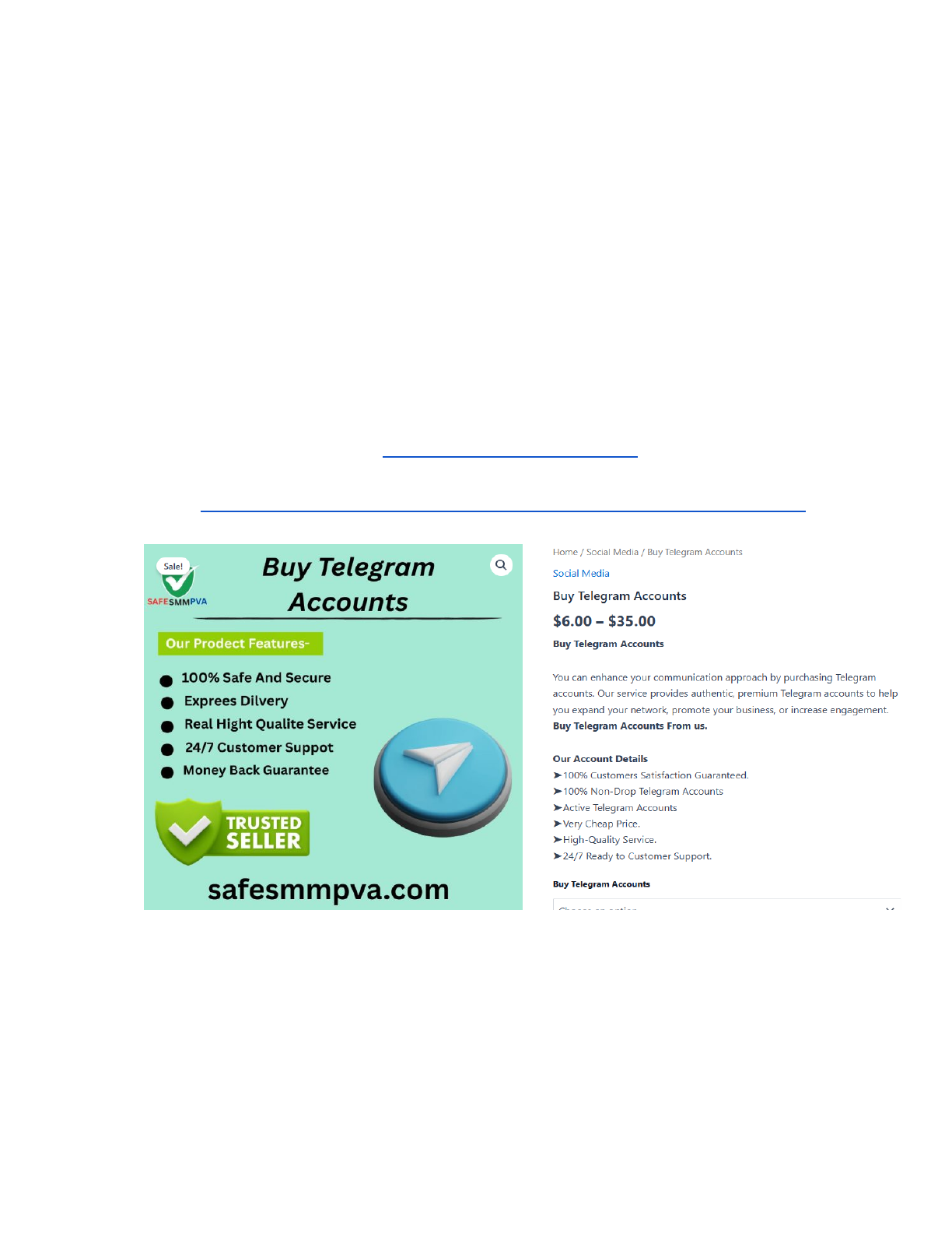 13 Top Verified Accounts Buying 100$ Only If you want to more information just contact now Telegram:@safesmmpva WhatsApp: +1 (312)375-3129 Email: safesmmpva@gmail.com Visit:https://safesmmpva.com/product/buy-telegram-accounts/ Buy Telegram Accounts Are you looking to enhance your social media presence? If Telegram is part of your strategy, buying Telegram accounts from Safesmmpva might be the game-changer you need. mailto:safesmmpva@gmail.com https://safesmmpva.com/product/buy-telegram-accounts/ 2 Imagine skyrocketing your engagement and expanding your reach effortlessly. This is not just about numbers; it's about creating influence and driving conversations that matter. Picture your brand gaining traction, with followers who are genuinely interested in what you have to say. Dive into this article to explore how Safesmmpva can help you achieve these goals, and why investing in Telegram accounts is a smart move for your digital growth. Your next step in social media success starts here. The Rise Of Telegram In Social Media Telegram has become a significant platform in social media. It offers privacy and unique features. This app has gained global popularity. More users are joining every day. Many businesses and influencers are leveraging its potential. The Emergence Of Telegram 13 Top Verified Accounts Buying 100$ Only If you want to more information just contact now ➤➤Telegram:@safesmmpva ➤➤WhatsApp: +1 (312)375-3129 ➤➤Email: safesmmpva@gmail.com Visit:https://safesmmpva.com/product/buy-telegram-accounts/ Telegram is known for its secure messaging. Its encryption keeps messages private. People trust it for safe communication. The app also supports large groups. This makes it suitable for community building. Features That Drive Popularity mailto:safesmmpva@gmail.com https://safesmmpva.com/product/buy-telegram-accounts/ 3 Telegram offers more than just messaging. Users can create channels for broadcasting. Channels allow sharing content with large audiences. Bots enhance user experience by automating tasks. This adds convenience and efficiency. Why Businesses Choose Telegram Businesses find value in Telegram's features. They use it for customer engagement. Direct communication builds trust and loyalty. Promotions reach many users instantly. This boosts brand visibility and interaction. How Telegram Stands Out Telegram is different from other apps. Its focus on security is crucial. Users enjoy freedom from ads. The app is also fast and reliable. These factors contribute to its growing user base. Telegram's rise in social media is notable. Its unique features attract diverse users. Businesses and individuals benefit from its offerings. The platform continues to grow and evolve. Importance Of Telegram Accounts Telegram has emerged as a vital communication tool. It connects millions worldwide. Businesses use Telegram to reach audiences efficiently. It's not just a messaging app. It's a platform for marketing, networking, and customer engagement. Telegram accounts are valuable for businesses. They help in expanding reach and increasing engagement. Understanding their importance can lead to significant growth in digital presence. Telegram accounts are crucial for brand visibility. They allow businesses to share updates instantly. Companies can send messages directly to their audience. This direct communication builds trust. It enhances customer relationships and fosters loyalty. Benefits Of Owning Multiple Telegram Accounts Having multiple accounts diversifies your reach. It targets different audience segments effectively. Each account can cater to specific interests. This personalized approach boosts engagement. It also allows businesses to test different strategies. Experimenting with content can lead to better results. Telegram Accounts For Business Promotion Businesses promote products easily through Telegram. They share promotions, discounts, and special offers. Engaging content keeps the audience interested. Telegram's features support various content types. Videos, images, and text can all be shared. This versatility makes Telegram a powerful promotional tool. 4 Security And Privacy With Telegram Telegram is known for its security features. It offers end-to-end encryption for messages. This ensures privacy for users and businesses. Secure communication builds trust. Customers feel safe sharing information. Businesses benefit from this secure environment. 13 Top Verified Accounts Buying 100$ Only If you want to more information just contact now ➤➤Telegram:@safesmmpva ➤➤WhatsApp: +1 (312)375-3129 ➤➤Email: safesmmpva@gmail.com Visit:https://safesmmpva.com/product/buy-telegram-accounts/ Safesmmpva: A Trusted Source Buying Telegram accounts can boost your online presence. Safesmmpva is a trusted source for this service. Their reputation for reliability and quality is well-known. Choosing the right provider is crucial. Safesmmpva ensures safety and security. Why Choose Safesmmpva? Safesmmpva offers verified Telegram accounts. These accounts are ready to use. Each account is authentic and active. They prioritize customer satisfaction. This makes them a preferred choice. High-quality Accounts Each account undergoes a verification process. This ensures genuine and active users. You get real engagement, not bots. Quality is never compromised. mailto:safesmmpva@gmail.com https://safesmmpva.com/product/buy-telegram-accounts/ 5 Secure Transactions Safesmmpva guarantees secure transactions. Your information remains confidential. They use advanced security measures. You can trust them with your data. Excellent Customer Support Their customer support is available 24/7. Any issues are promptly addressed. Queries are resolved quickly. They ensure a smooth buying experience. Affordable Pricing Prices are competitive and fair. You get value for your money. Quality service at an affordable cost. No hidden fees or charges. Easy Purchase Process The purchase process is simple and fast. N