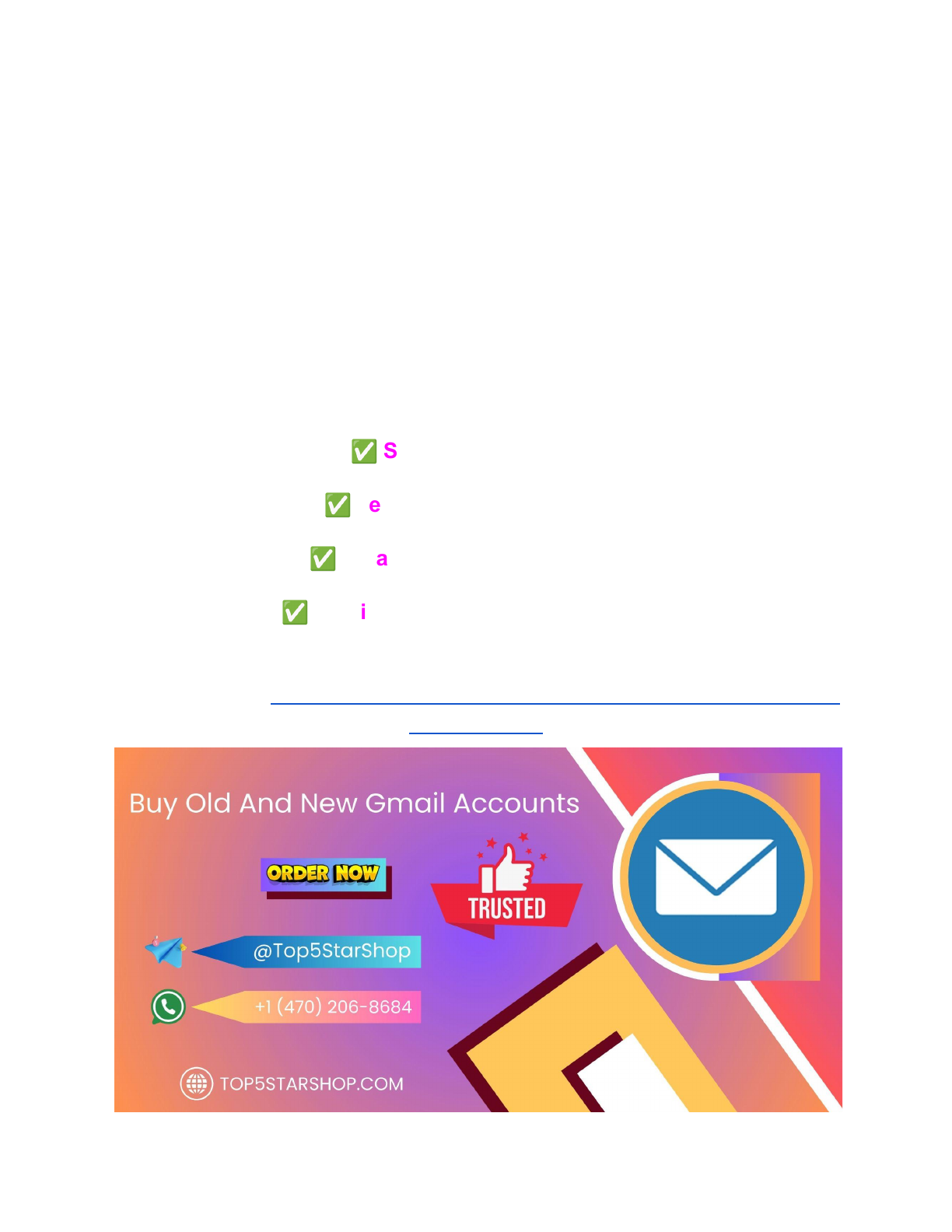 Buy Old Gmail Accounts – 100% PVA Old & Best Quality Our Gmail accounts act as virtual time capsules in the fast-paced world of digital communication, archiving conversations, memories, and a record of our online existence. Today, let’s embark on a journey through the corridors of buy old Gmail accounts, unraveling the timeless charms embedded within. ➤ 24/7 Hours Reply/Contact ✅ Skype:Top5StarShop ✅ Telegram:@Top5StarShop ✅WhatsApp: +1 (470) 206-8684 ✅ Email:top5starshop99@gmail.com MORE INFORMATION:https://top5starshop.com/product/buy-old-and-new-gm ail-accounts/ https://top5starshop.com/product/buy-old-and-new-gmail-accounts/ https://top5starshop.com/product/buy-old-and-new-gmail-accounts/ Inbox Chronicles: Messages that Tell Stories The inbox is a sacred space where messages from the past and present converge. Each email carries with it a piece of history—a heartfelt note from a friend, a crucial work update, or the joyous news of a long-awaited reunion. As we scroll through the messages, we are reminded of the diverse tapestry of experiences woven into the fabric of our lives. Sent Items: A Trail of Digital Footprints The “Sent Items” folder stands as a testament to our communication journey. From business proposals to casual banter, every sent email represents a moment in time when words were carefully chosen, and ideas were shared. It’s a trail of digital footprints, marking our growth, connections, and the evolution of our relationships. Labels and Folders: The Organized Chaos In an attempt to bring order to the ever-expanding digital universe, we create labels and folders—tiny galaxies within the Gmail cosmos. “Work,” “Personal,” and “Travel,” each category meticulously organized, reflecting not just our emails but the structure we crave in our online existence. Buy Old Gmail Account Attachments: Digital Artifacts Nestled within the attachments folder are digital artifacts—photos, documents, and files that encapsulate moments frozen in time. A visual journey through shared memories, family gatherings, and the occasional funny meme. Each attachment is a snapshot of the emotions and experiences we’ve shared with others. Buy Old Gmail Accounts Drafts: Unfinished Stories The drafts folder is a canvas of creativity and unfinished tales. Ideas are left in suspended animation, messages never sent, and thoughts half-formed. It’s a space that reminds us of the transient nature of inspiration, capturing the essence of creativity in its raw, unpolished form. Settings: The Silent Guardian Beyond the visible folders and emails, the settings page stands as the silent guardian of our digital fortress. From security configurations to personalized preferences, it reflects our ➤ 24/7 Hours Reply/Contact ✅ Skype:Top5StarShop ✅ Telegram:@Top5StarShop ✅WhatsApp: +1 (470) 206-8684 ✅ Email:top5starshop99@gmail.com MORE INFORMATION:https://top5starshop.com/product/buy-old-and-new-gmail-accounts/ commitment to maintaining a secure and tailored online presence. An old Gmail Accounts is not just a repository of emails; it’s a living archive of our experiences, connections, and the evolution of our digital selves. As we navigate through its virtual landscapes, we are reminded of the enduring significance of these accounts in shaping our past and influencing our future. So, here’s to the old Gmail account—a keeper of memories, a witness to our journey, and a reflection of the stories that make us who we are. Why Gmail accounts important ? Gmail accounts are highly important and widely used for various reasons, contributing to their significance in the digital landscape. Here are some key aspects highlighting the importance of Gmail accounts: Buy Old Gmail Accounts Professional Email Communication: Gmail is extensively used for professional communication. Many businesses and individuals rely on Gmail for sending and receiving emails, sharing important information, and managing work-related correspondence. Personal Correspondence: Buy Old Gmail Accounts serves as a primary platform for personal email communication. People use it to connect with friends, family, and acquaintances, maintain relationships, and stay informed about personal matters. https://top5starshop.com/product/buy-old-and-new-gmail-accounts/ Integration with Google Services: Buy Old Gmail Accounts Unified Ecosystem: A Gmail account is the gateway to various Google services such as Google Drive, Google Calendar, Google Docs, and more. This integration allows users to seamlessly access and manage a suite of productivity tools from a single account. Cloud Storage and File Sharing with Google Drive: Gmail users benefit from integrated cloud storage through Google Drive. This enables the storage and sharing of documents, photos, and files, fostering collaboration and providing a secure backup for important data. Authentication and Sign-In: Universal Sign-In: A Gmail account serves as a universal sign-in credential for various online platforms and services. This simplifies the user experience by allowing individuals to access multiple websites and applications with a single set of credentials. Security and Spam Protection: Advanced Security Features: Gmail is equipped with robust security features, including two-factor authentication, spam filtering, and phishing detection. This helps protect users from unauthorized access and malicious activities. Accessibility Across Devices: Sync Across Devices: Gmail accounts offer seamless synchronization across different devices. Users can access their emails, contacts, and calendar events from smartphones, tablets, and computers, providing flexibility and convenience. User-Friendly Interface: Intuitive Design: Gmail is known for its user-friendly interface. The clean design and intuitive features make it easy for users to navigate their inboxes, compose emails, and manage their communication efficiently. Customization and Organization: Labels and Filt