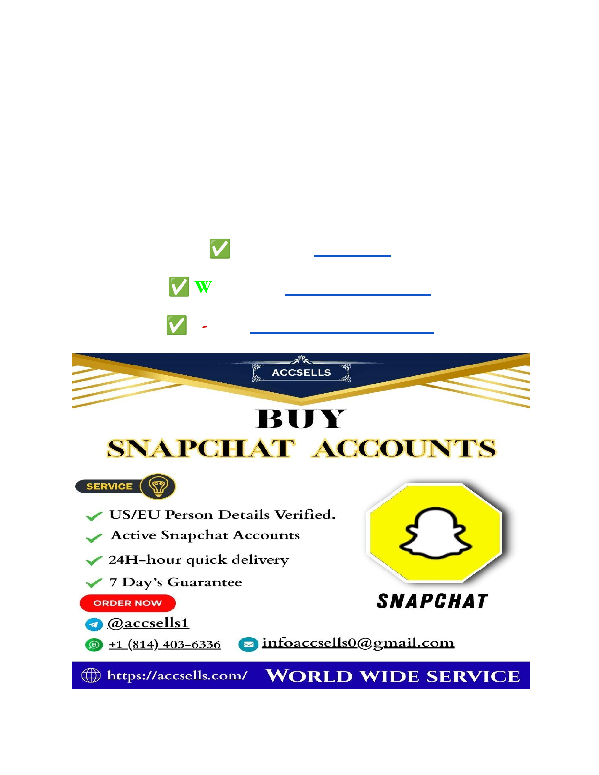 The Ultimate Step-by-Step Guide to Buying Snapchat Accounts Safely and Effectively If You want to more information just contact now 24 Hours Reply/ Contact : – ✅ Telegram: @accsells1 ✅ WhatsApp: +1 (814) 403–6336 ✅ E-mail: infoaccsells0@gmail.com https://t.me/accsells1 https://api.whatsapp.com/send?phone=18144036336 mailto:infoaccsells0@gmail.com Snapchat offers unique ways to connect with audiences. Its rapid growth among younger users makes it a strong tool for brands and influencers. Building a following from nothing takes a lot of time. This often leads people to consider buying an existing Snapchat account. Yet, this path has many hidden dangers. This guide gives you a clear, step-by-step plan. It helps you get a good Snapchat account safely. You can then get the best out of your purchase while avoiding risks. Knowing why you want to buy a Snapchat account is important. Maybe you're an influencer wanting more reach. Perhaps your brand needs to connect with a certain group. Or maybe you just want a ready-made network. This process needs careful thought. This guide will teach you how to spot real sellers. You'll learn how to check an account's true value and how to make a safe deal. This way, you can make smart choices in this unique market. Understanding the Landscape of Snapchat Account Acquisition Thinking about buying a Snapchat account is a big step. What makes someone choose this route? Most folks want to save time and get straight to a bigger audience. This section looks at the main reasons people buy these accounts. It also covers the major risks you must know about before you act. Why Buy a Snapchat Account? Businesses and individuals often find good reasons to buy Snapchat accounts. It’s not just about getting more followers. It’s about smart, quick growth. ● Expanding Reach and Audience: An account with many followers instantly boosts your visibility. Imagine reaching thousands right away instead of waiting months. This jump-starts your brand's presence on Snapchat. You can share your message with a wide group from day one. ● Niche Marketing and Targeted Audiences: Some accounts already have followers interested in a specific thing. Buying one like this means your marketing hits the right people. You can find accounts focused on fashion, gaming, or local interests. This makes your campaigns much more effective. Your content reaches an audience ready to engage. ● Brand Building and Credibility: A new brand can struggle to gain trust. An established Snapchat account can change that. It gives your brand instant credit. People see an active, popular account and think you’re more trustworthy. This helps build a solid foundation for your online identity. The Risks and Considerations Buying a Snapchat account isn't without its challenges. You need to be aware of the possible problems. Some risks can even lead to losing your account or money. ● Violation of Snapchat's Terms of Service: Did you know that transferring Snapchat accounts goes against their rules? This is a big deal. Breaking these terms can lead to your account being shut down. Snapchat can suspend or even delete accounts found to be bought or sold. Always remember this risk. ● Scams and Fraudulent Sellers: The internet has many dishonest people. Scammers might sell you an account that isn't real. They could take your money and disappear. Or they might sell an account that quickly gets banned. Knowing how to spot these fake sellers is very important. ● Account Authenticity and Engagement Verification: Not all followers are real. Some sellers use bots to inflate follower numbers. This makes the account look better than it is. You need to check if the followers are genuine. Real engagement means people actually watch and interact with stories. Fake engagement doesn't help your goals. Finding Reputable Sources for Snapchat Accounts Where do you even start looking for a Snapchat account? Finding a trustworthy source is key. You want to avoid scams and ensure you get what you pay for. This section helps you find safe places to shop. Trusted Marketplaces and Platforms Some online places act as middlemen for buying and selling social media accounts. These platforms can offer some protection. They often have rules to keep both buyers and sellers safe. Look for specific features when checking out these sites. ● Features of Reputable Marketplaces: Good platforms offer services like escrow. Escrow holds your payment until the account transfer is complete. They also verify sellers, which adds a layer of trust. Dispute resolution helps if things go wrong. These features protect your money and your purchase. ● Examples of Platforms: While specific examples of widely vetted marketplaces for Snapchat accounts can be hard to pin down due to the platform's terms of service, the principle applies to any platform claiming to facilitate such sales. Always research any marketplace thoroughly. Look for reviews and independent verification. Avoid sites with no clear contact info or poor security. Direct Seller Outreach and Due Diligence Sometimes you might find sellers directly. This could be through online communities or word-of-mouth. When you go this route, you must do your own homework. It’s all about checking things out thoroughly. ● Identifying Potential Sellers: Look in online forums or social media groups dedicated to digital assets. You might find people openly listing their accounts for sale. Networking within your industry can also reveal sellers. Always start by asking around for recommendations. ● Vetting Sellers and Account History: Once you find a potential seller, dig into their past. Do they have a good online reputation? Check their other social media profiles. Ask for the Snapchat account's history. Has it ever been banned? How old is it? A clear history means less risk. Verifying Account Authenticity and Value You’ve found a possible account to buy. Now, how do you know if it’s tru