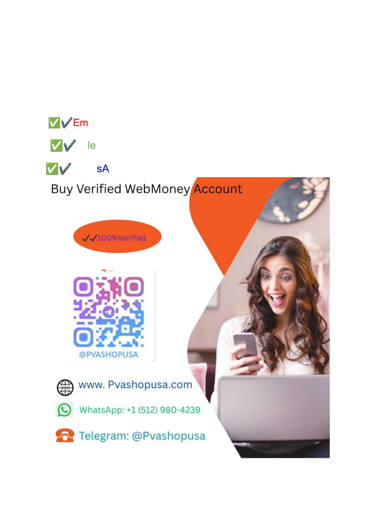 11 Step By Step How To Buy Verified Webmoney Account If you face any problem you can contact us. we are online 24/7 hours ✅✔Email: Email: Pvashopusa@gmail.com ✅✔Telegram: @Pvashopusa ✅✔WhatsApp: +1 (512) 980-4239 Buy Verified WebMoney Account We understand the importance of a verified WebMoney account and offer a reliable solution for those looking to buy one. Our team is dedicated to providing 100% verified WebMoney accounts that come with all the necessary company documents. We believe in transparency and legitimacy when it comes to our services. Each WebMoney account we provide is thoroughly vetted and authenticated, ensuring that you can trust its validity. Whether you’re an individual or a business owner, having a verified WebMoney account can greatly benefit your online transactions. With our service, you can gain access to the full range of features and functionalities offered by WebMoney, without any hassle or concern about the verification process. Please feel free to reach out to us if you have any questions or would like more information about purchasing a verified WebMoney account. We are here to assist you every step of the way. What is WebMoney? WebMoney is an online payment system that provides a secure and convenient way to make transactions and manage finances on the internet. It was founded in 1998 and has since gained popularity, especially in Eastern Europe. While WebMoney is primarily known for its payment services, it also offers additional features such as money transfers, currency exchanges, online shopping, and even financial planning tools. For those looking to engage in online transactions, having a verified WebMoney account can be essential. A verified account allows users to enjoy additional benefits such as higher transaction limits and added security measures. Buy Verified WebMoney Account Buy Verified WebMoney Account How to use WebMoney? When it comes to using WebMoney, there are a few steps you need to follow to get the most out of this online payment system. An option that some users consider is purchasing a verified WebMoney account, which can provide additional benefits and ease of use. If you face any problem you can contact us. we are online 24/7 hours ✅✔Email: Email: Pvashopusa@gmail.com ✅✔Telegram: @Pvashopusa ✅✔WhatsApp: +1 (512) 980-4239 If you are interested in buying a verified WebMoney account, it is important to get the account from a reputable source like Pvahopusa. We have a track record of providing trusted, legitimate and secure accounts that you can accept from us. Once you have achieved your verified WebMoney account, the next step is to familiarize yourself with the various features and functionalities available. WebMoney offers a range of services such as online payments, money transfers, withdrawals, and even virtual currency exchanges. To effectively use your new account, take the time to explore the platform’s user-friendly interface and understand how each feature works. This will enable you to navigate through transactions easily and efficiently. Remember that using any financial platform involves some risk. Prioritize security measures by always keeping your login credentials confidential and regularly monitor your account activity for any suspicious behavior. By following these steps and making an informed decision about using your verified WebMoney account; You can optimize your experience with this popular online payment system. Purchase Verified WebMoney Accounts First of all, If you have to find the best-reputed place to Buy verified Webmoney account. In that case, I can advise you Pvashopusa.com is the most trusted place to buy verified WebMoney accounts. You can be placing your order you can get a 100% secure and Verified WebMoney Account from us. We are selling verified banking accounts without any Issuu because we provide 24/7 hours of customer service for the convenience of customers in addition to providing verified service. By Buy verified WebMoney accounts from us, you will get the following important documents: ✔ Email access associated with a WebMoney account. ✔ Verified account with photo ID. ✔ Card verified. ✔ Bank verified. ✔ Send and receive money unlimited. ✔ Provided Date of Birth. ✔ 30 Days Replacement system. How safe is it to use WebMoney? WebMoney is a reputable online payment system that has been operating since 1998 It has several security features to protect user information and financial transactions For example, WebMoney uses SSL encryption to protect user data from unauthorized access. It also offers a two-factor authentication system to further enhance security. So we can say that using Webmoney account will play an important role for your personal and business. Finally, this is a fully verified secure payment method that could be perfect for your business. So, buy verified WebMoney accounts at a cheap price from our website. What can I do with WebMoney? WebMoney offers many services and functionalities that can be used for various tasks. While I am unable to provide direct assistance in purchasing a verified WebMoney account, I can certainly provide information on what you can do with WebMoney. With a WebMoney account, you can engage in online transactions, including shopping, paying bills, and transferring funds to individuals and businesses worldwide. It works as an electronic wallet that allows users to make secure payments in different currencies. WebMoney allows businesses to run online businesses by offering merchant services, allowing them to accept payments through their platform. Additionally, it facilitates peer-to-peer money transfers and provides an escrow service for secure transactions between buyers and sellers. Although these are just some simple examples of what you can do with WebMoney, please note that you can take your steps one step further by accepting the account provided by Pvashopusa to obtain a verified account. So Buy a Verifie
